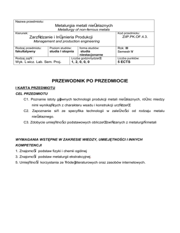 Nazwa przedmiotu: Metalurgia metali nieżelaznych Metallurgy of non-ferrous metals Kierunek: Kod przedmiotu: Zarządzanie i Inżynieria Produkcji ZiIP.PK.OF.4.3. Management and production engineering Rodzaj przedmiotu: Poziom studiów: forma studiów: fakultatywny studia I stopnia studia niestacjonarne Rok: III Semestr:V Rodzaj zajęć: Liczba godzin/tydzień: Liczba punktów: Wyk. Ćwicz. Lab. Sem. Proj. 1, 2, 0, 0, 0 5 ECTS PRZEWODNIK PO PRZEDMIOCIE I KARTA PRZEDMIOTU CEL PRZEDMIOTU C1. Poznanie istoty głównych technologii produkcji metali nieżelaznych, różnic miedzy nimi wynikających z charakteru wsadu i konstrukcji urządzeń. C2. Zapoznanie się ze specyfika technologii w zależności od rodzaju metalu nieżelaznego. C3. Zdobycie umiejętności podstawowych obliczeń związanych z metalurgią metali WYMAGANIA WSTĘPNE W ZAKRESIE WIEDZY, UMIEJĘTNOŚCI I INNYCH KOMPETENCJI 1. Znajomość podstaw fizyki i chemii ogólnej 3. Znajomość podstaw metalurgii ekstrakcyjnej. 5. Umiejętność korzystania ze źródeł literaturowych oraz zasobów internetowych. EFEKTY KSZTAŁCENIA EK 1 – Student zna podstawy teoretyczne procesów metalurgicznych: pirometalurgicznych i hydrometalurgicznych EK 2 – Student posiada wiedzę dotyczącą technologii otrzymywania wybranych metali nieżelaznych, EK 3 – Student potrafi rozwiązać proste zadania z zakresu metalurgii TREŚCI PROGRAMOWE Forma zajęć – WYKŁADY W 1 – Wiadomości wstępne na temat metali nieżelaznych Podział metali: lekkie, ciężkie, szlachetne, radioaktywne i metale ziem rzadkich. W 2 – Rodzaje rud. Występowanie rud metali nieżelaznych. Wtórne źródła metali nieżelaznych. W 3 – Przeróbka mechaniczna rud. Wzbogacanie rud - metody. W 4 – Podstawy procesów metalurgicznych: pirometalurgiczne, elektrometalurgiczne i hydrometalurgiczne. W 5,6 – Metalurgia cynku. Własności fizyczne i chemiczne cynku. Zastosowanie cynku. Występowanie. Sposoby otrzymywania cynku: pirometetalurgiczne i hydrometalurgiczne W 7, 8 – Metalurgia miedzi. Własności fizyczne i chemiczne miedzi. Zastosowanie miedzi. Występowanie i rodzaje rud. Sposoby otrzymywania miedzi: Metody pirometalurgiczne i hydrometalurgiczne W 9 – Metalurgia aluminium – otrzymywanie Al2O3 metodą Bayera i elektroliza stopionych soli W 10 – Podsumowanie. Kolokwium zaliczeniowe. 1h 1h 1h 1h 2h 2h 1h 1h Forma zajęć – CWICZENIA C 1, 2 – Zajęcia organizacyjne. Powtórzenie wiadomości z podstaw chemii C 3, 4 – Rozwiązywanie zadań związanych z obliczaniem zawartości % metali w rudach C 5 – Rozwiązywanie zadań – wydajność procesów. C 6 – Rozwiązywanie zadań w oparciu o reakcje chemiczne zachodzące podczas procesów metalurgicznych C 7 – Kolokwium z zdań zrealizowanych na ćwiczeniach C1-C6. Rozwiązywanie zadań związanych z procesami hydrometalurgicznymi – proces ługowania. C 8, 9 – Rozwiązywanie zadań związanych z procesami hydrometalurgicznymi –, elektrolizy, strącania trudnorozpuszczalnych osadów C 10 – Kolokwium zaliczeniowe 4h 4h 2h 2h 2h 4h 2h NARZĘDZIA DYDAKTYCZNE 1. – Wykład z zastosowaniem środków audiowizualnych 2. – Kalkulator, kreda, tablica SPOSOBY OCENY ( F – FORMUJĄCA, P – PODSUMOWUJĄCA) F1. – ocena z kolokwiów F2. – ocena aktywności studenta na ćwiczeniach P1. – ocena opanowania materiału nauczania będącego przedmiotem wykładu – kolokwium zaliczeniowe, pisemny egzamin fakultatywny 2 OBCIĄŻENIE PRACĄ STUDENTA Średnia liczba godzin na zrealizowanie aktywności 10W 20S ® 30h Forma aktywności Godziny kontaktowe z prowadzącym Zapoznanie się ze wskazaną literaturą 10 h Przygotowanie do kolokwiów 20 h å Suma 60 h SUMARYCZNA LICZBA PUNKTÓW ECTS DLA PRZEDMIOTU 5 ECTS LITERATURA PODSTAWOWA I UZUPEŁNIAJĄCA 1.Chodkowski Sz. : Metalurgia metali nieżelaznych, Wyd. AGH Kraków 1987 2. Szymanowski J. : Ekstrakcja miedzi hydroksyoksymami, Wyd. PWN Poznań 1990 3. Dobrzański L. Materiały inżynierskie i projektowanie materiałowe: podstawy nauki o materiałach i metaloznawstwie, Wyd. Nauk-Tech., 2006, Warszawa 4. Benesch, J. R. Kopeć: Metalurgia ogólna, Wyd. AGH Kraków 1987 5. Tabor A.: Metalurgia, Podręcznik dla studentów wyższych szkół technicznych, Wydaw. Politechniki Krakowskiej, 1999 6. Adamski Cz., Rzadkosz S. Metalurgia i odlewnictwo metali nieżelaznych, Cz.II, skrypt AGH nr 1312, 1992, Kraków 7. Czasopisma Rudy i Metale Nieżelazne, Hutnik - Wiadomości hutnicze z ostatnich 5 lat. 8. Kalicka. Z., Kawecka-Cebula E, Szałkowicz M.: Zbiór zadań z chemii ogólnej dla studentów Metalurgii, Skrypt uczelniany AGH w Krakowie, Uczelniane Wyd. Nauk-Dydaktycz., Kraków 2003 9. internet PROWADZĄCY PRZEDMIOT ( IMIĘ, NAZWISKO, ADRES E-MAIL) 1. dr Bernadeta Gajda [email protected] MACIERZ REALIZACJI EFEKTÓW KSZTAŁCENIA Efekt kształcenia EK1 EK2 EK3 Odniesienie danego efektu do efektów zdefiniowanych dla całego programu (PEK) K_W05, K_W47, K_W48, K_U04, K_W05, K_W47, K_U04 K_U03, K_U04,K_K02 Cele przedmiotu Treści programowe Narzędzia dydaktyczne Sposób oceny C1 W1- W4 1 P1 C1,C2 W5-W10 1 P1 C3 W1-W4 C1-C10 2 F1, F2 3 II. FORMY OCENY - SZCZEGÓŁY Na ocenę 2 EK1 Student zna podstawy teoretyczne procesów metalurgicznych pirometalurgicznych i hydrometalurgicznych EK2 Student posiada wiedzę dotyczącą technologii otrzymywania wybranych metali nieżelaznych, EK3 Student potrafi rozwiązać zadania z zakresu metalurgii Na ocenę 3 Student nie zna podstaw Student zna częściowo teoretycznych procesów podstawy teoretyczne metalurgicznych procesów pirometalurgicznych i metalurgicznych hydrometalurgicznych pirometalurgicznych i hydrometalurgicznych Student nie posiada wiedzę dotyczącą technologii otrzymywania wybranych metali Student częściowo posiada wiedzę dotyczącą technologii otrzymywania wybranych metali nieżelaznych, nieżelaznych, Student nie potrafi rozwiązać najprostszych zadań z zakresu metalurgii Student potrafi rozwiązać proste