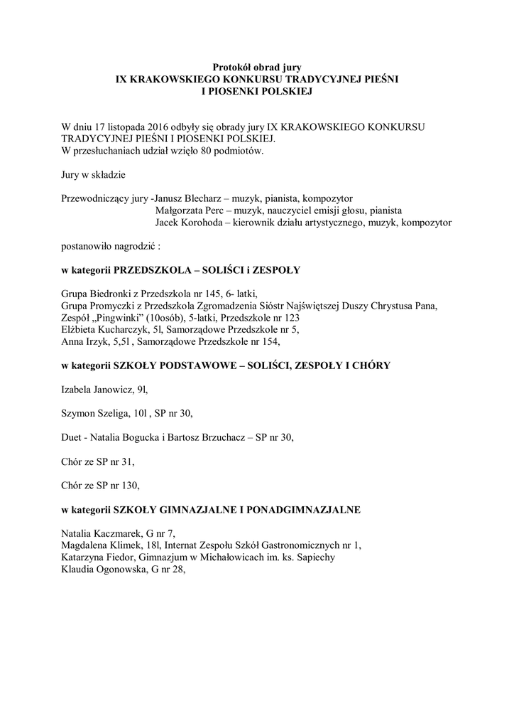Protokół obrad jury IX KRAKOWSKIEGO KONKURSU TRADYCYJNEJ PIEŚNI I PIOSENKI POLSKIEJ W dniu 17 listopada 2016 odbyły się obrady jury IX KRAKOWSKIEGO KONKURSU TRADYCYJNEJ PIEŚNI I PIOSENKI POLSKIEJ. W przesłuchaniach udział wzięło 80 podmiotów. Jury w składzie Przewodniczący jury -Janusz Blecharz – muzyk, pianista, kompozytor Małgorzata Perc – muzyk, nauczyciel emisji głosu, pianista Jacek Korohoda – kierownik działu artystycznego, muzyk, kompozytor postanowiło nagrodzić : w kategorii PRZEDSZKOLA – SOLIŚCI i ZESPOŁY Grupa Biedronki z Przedszkola nr 145, 6- latki, Grupa Promyczki z Przedszkola Zgromadzenia Sióstr Najświętszej Duszy Chrystusa Pana, Zespół „Pingwinki” (10osób), 5-latki, Przedszkole nr 123 Elżbieta Kucharczyk, 5l, Samorządowe Przedszkole nr 5, Anna Irzyk, 5,5l , Samorządowe Przedszkole nr 154, w kategorii SZKOŁY PODSTAWOWE – SOLIŚCI, ZESPOŁY I CHÓRY Izabela Janowicz, 9l, Szymon Szeliga, 10l , SP nr 30, Duet - Natalia Bogucka i Bartosz Brzuchacz – SP nr 30, Chór ze SP nr 31, Chór ze SP nr 130, w kategorii SZKOŁY GIMNAZJALNE I PONADGIMNAZJALNE Natalia Kaczmarek, G nr 7, Magdalena Klimek, 18l, Internat Zespołu Szkół Gastronomicznych nr 1, Katarzyna Fiedor, Gimnazjum w Michałowicach im. ks. Sapiechy Klaudia Ogonowska, G nr 28,