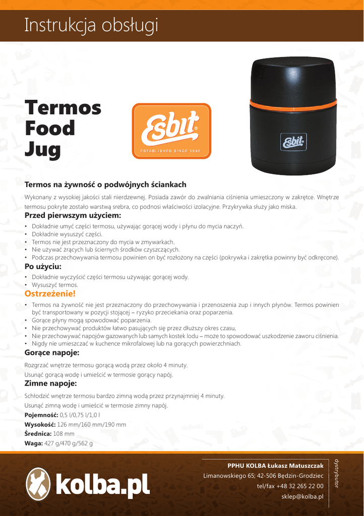 Instrukcja obsługi Termos Food Jug Termos na żywność o podwójnych ściankach Wykonany z wysokiej jakości stali nierdzewnej. Posiada zawór do zwalniania ciśnienia umieszczony w zakrętce. Wnętrze termosu pokryte zostało warstwą srebra, co podnosi właściwości izolacyjne. Przykrywka służy jako miska. Przed pierwszym użyciem: • • • • • Dokładnie umyć części termosu, używając gorącej wody i płynu do mycia naczyń. Dokładnie wysuszyć części. Termos nie jest przeznaczony do mycia w zmywarkach. Nie używać żrących lub ściernych środków czyszczących. Podczas przechowywania termosu powinien on być rozłożony na części (pokrywka i zakrętka powinny być odkręcone). Po użyciu: • Dokładnie wyczyścić części termosu używając gorącej wody. • Wysuszyć termos. Ostrzeżenie! • Termos na żywność nie jest przeznaczony do przechowywania i przenoszenia zup i innych płynów. Termos powinien być transportowany w pozycji stojącej − ryzyko przeciekania oraz poparzenia. • Gorące płyny mogą spowodować poparzenia. • Nie przechowywać produktów łatwo pasujących się przez dłuższy okres czasu, • Nie przechowywać napojów gazowanych lub samych kostek lodu − może to spowodować uszkodzenie zaworu ciśnienia. • Nigdy nie umieszczać w kuchence mikrofalowej lub na gorących powierzchniach. Gorące napoje: Rozgrzać wnętrze termosu gorącą wodą przez około 4 minuty. Usunąć gorącą wodę i umieścić w termosie gorący napój. Zimne napoje: Schłodzić wnętrze termosu bardzo zimną wodą przez przynajmniej 4 minuty. Usunąć zimną wodę i umieścić w termosie zimny napój. Pojemność: 0,5 l/0,75 l/1,0 l Wysokość: 126 mm/160 mm/190 mm Średnica: 108 mm Waga: 427 g/470 g/562 g tel/fax +48 32 265 22 00 [email protected] dystrybutor PPHU KOLBA Łukasz Matuszczak Limanowskiego 65; 42-506 Będzin-Grodziec