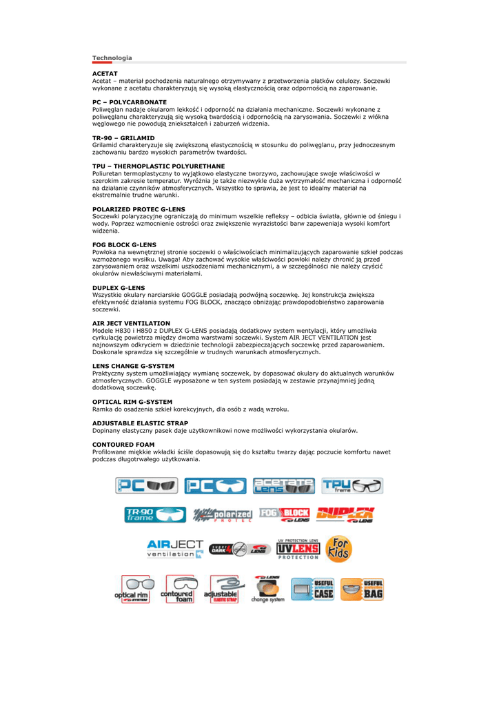 Technologia ACETAT Acetat – materiał pochodzenia naturalnego otrzymywany z przetworzenia płatków celulozy. Soczewki wykonane z acetatu charakteryzują się wysoką elastycznością oraz odpornością na zaparowanie. PC – POLYCARBONATE Poliwęglan nadaje okularom lekkość i odporność na działania mechaniczne. Soczewki wykonane z poliwęglanu charakteryzują się wysoką twardością i odpornością na zarysowania. Soczewki z włókna węglowego nie powodują zniekształceń i zaburzeń widzenia. TR-90 – GRILAMID Grilamid charakteryzuje się zwiększoną elastycznością w stosunku do poliwęglanu, przy jednoczesnym zachowaniu bardzo wysokich parametrów twardości. TPU – THERMOPLASTIC POLYURETHANE Poliuretan termoplastyczny to wyjątkowo elastyczne tworzywo, zachowujące swoje właściwości w szerokim zakresie temperatur. Wyróżnia je także niezwykle duża wytrzymałość mechaniczna i odporność na działanie czynników atmosferycznych. Wszystko to sprawia, że jest to idealny materiał na ekstremalnie trudne warunki. POLARIZED PROTEC G-LENS Soczewki polaryzacyjne ograniczają do minimum wszelkie refleksy – odbicia światła, głównie od śniegu i wody. Poprzez wzmocnienie ostrości oraz zwiększenie wyrazistości barw zapeweniaja wysoki komfort widzenia. FOG BLOCK G-LENS Powłoka na wewnętrznej stronie soczewki o właściwościach minimalizujących zaparowanie szkieł podczas wzmożonego wysiłku. Uwaga! Aby zachować wysokie właściwości powłoki należy chronić ją przed zarysowaniem oraz wszelkimi uszkodzeniami mechanicznymi, a w szczególności nie należy czyścić okularów niewłaściwymi materiałami. DUPLEX G-LENS Wszystkie okulary narciarskie GOGGLE posiadają podwójną soczewkę. Jej konstrukcja zwiększa efektywność działania systemu FOG BLOCK, znacząco obniżając prawdopodobieństwo zaparowania soczewki. AIR JECT VENTILATION Modele H830 i H850 z DUPLEX G-LENS posiadają dodatkowy system wentylacji, który umożliwia cyrkulację powietrza między dwoma warstwami soczewki. System AIR JECT VENTILATION jest najnowszym odkryciem w dziedzinie technologii zabezpieczających soczewkę przed zaparowaniem. Doskonale sprawdza się szczególnie w trudnych warunkach atmosferycznych. LENS CHANGE G-SYSTEM Praktyczny system umożliwiający wymianę soczewek, by dopasować okulary do aktualnych warunków atmosferycznych. GOGGLE wyposażone w ten system posiadają w zestawie przynajmniej jedną dodatkową soczewkę. OPTICAL RIM G-SYSTEM Ramka do osadzenia szkieł korekcyjnych, dla osób z wadą wzroku. ADJUSTABLE ELASTIC STRAP Dopinany elastyczny pasek daje użytkownikowi nowe możliwości wykorzystania okularów. CONTOURED FOAM Profilowane miękkie wkładki ściśle dopasowują się do kształtu twarzy dając poczucie komfortu nawet podczas długotrwałego użytkowania.
