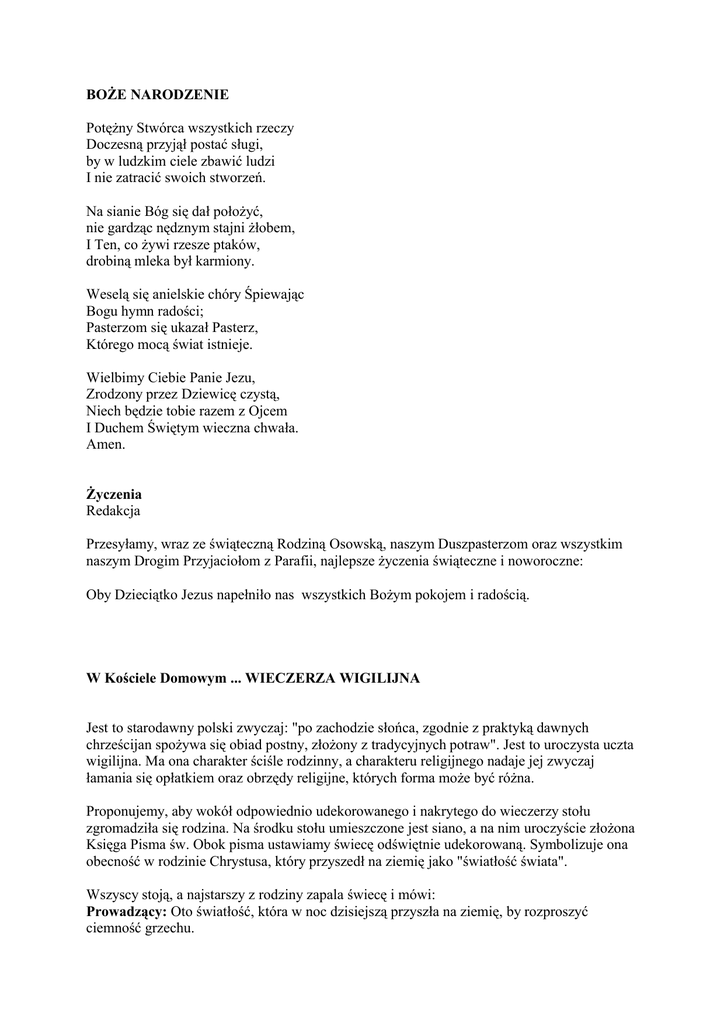 BOŻE NARODZENIE Potężny Stwórca wszystkich rzeczy Doczesną przyjął postać sługi, by w ludzkim ciele zbawić ludzi I nie zatracić swoich stworzeń. Na sianie Bóg się dał położyć, nie gardząc nędznym stajni żłobem, I Ten, co żywi rzesze ptaków, drobiną mleka był karmiony. Weselą się anielskie chóry Śpiewając Bogu hymn radości; Pasterzom się ukazał Pasterz, Którego mocą świat istnieje. Wielbimy Ciebie Panie Jezu, Zrodzony przez Dziewicę czystą, Niech będzie tobie razem z Ojcem I Duchem Świętym wieczna chwała. Amen. Życzenia Redakcja Przesyłamy, wraz ze świąteczną Rodziną Osowską, naszym Duszpasterzom oraz wszystkim naszym Drogim Przyjaciołom z Parafii, najlepsze życzenia świąteczne i noworoczne: Oby Dzieciątko Jezus napełniło nas wszystkich Bożym pokojem i radością. W Kościele Domowym ... WIECZERZA WIGILIJNA Jest to starodawny polski zwyczaj: "po zachodzie słońca, zgodnie z praktyką dawnych chrześcijan spożywa się obiad postny, złożony z tradycyjnych potraw". Jest to uroczysta uczta wigilijna. Ma ona charakter ściśle rodzinny, a charakteru religijnego nadaje jej zwyczaj łamania się opłatkiem oraz obrzędy religijne, których forma może być różna. Proponujemy, aby wokół odpowiednio udekorowanego i nakrytego do wieczerzy stołu zgromadziła się rodzina. Na środku stołu umieszczone jest siano, a na nim uroczyście złożona Księga Pisma św. Obok pisma ustawiamy świecę odświętnie udekorowaną. Symbolizuje ona obecność w rodzinie Chrystusa, który przyszedł na ziemię jako "światłość świata". Wszyscy stoją, a najstarszy z rodziny zapala świecę i mówi: Prowadzący: Oto światłość, która w noc dzisiejszą przyszła na ziemię, by rozproszyć ciemność grzechu. Wszyscy: Bogu niech będą dzięki. P. W imię Ojca+i Syna+i Ducha+Świętego. W. Amen. P. "Oto zwiastuję wam radość wielką, która będzie udziałem całego narodu: dziś w mieście Dawida narodził się wam Zbawiciel, którym jest Mesjasz, Pan" (Łk 2,10-11) - takie słowa skierował Anioł do pasterzy w noc Bożego Narodzenia. Słowa te skierowane są również do nas wszystkich. Niech radość i pokój, które wyśpiewywali Aniołowie nad stajnią w Betlejem będą stale udziałem naszej rodziny niech w niej gości wzajemna miłość i serdeczność, której wyrazem jest biały opłatek. Módlmy się za naszego Papieża Jana Pawła II, aby dobry Bóg dał mu zdrowie i siły w przyszłorocznej pielgrzymce do Polski i do Gdańska. W. Wysłuchaj nas Panie. P. Módlmy się za wszystkich, których ogarniamy swoim sercem, a szczególnie za naszego arcybiskupa Tadeusza Gocłowskiego, naszych Duszpasterzy, naszych krewnych, przyjaciół i sąsiadów oraz zmarłych, by w dzisiejszą noc Pan obdarzył ich swą łaską i pokojem. W. Wysłuchaj nas Panie. W. Ojcze nasz... P. Panie Jezu Chryste, który w dzisiejszą noc przyszedłeś na świat rodząc się w grocie betlejemskiej z Najświętszej Maryi Panny, zamieszkaj w naszej rodzinie i zespól ją węzłami Twojej miłości oraz pobłogosław te dary, które z wdzięcznością będziemy spożywali. Który żyjesz i królujesz na wieki wieków. W. Amen. P. Teraz obdzielimy się białym opłatkiem „z miłością, nikomu serca nie skąpiąc". Obecnie wszyscy łamią się opłatkiem przekazując sobie znak miłości i pokoju. W czasie wieczerzy wigilijnej śpiewamy kolędy, słuchamy płyt i audycji o tematyce Bożego Narodzenia. Dziadkowie i rodzice opowiadają dzieciom o przeżyciach ze swego dzieciństwa i przekazują im dawne polskie zwyczaje bożonarodzeniowe. Niech ten wieczór będzie ciepły, miły i pełen radości. Pokój temu domowi ...WIZYTA DUSZPASTERSKA Przyjęcie kapłana z wizytą duszpasterską jest aktem publicznego wyznania wiary, a zarazem znakiem jedności i żywej więzi Kościoła domowego z Kościołem parafialnym, a tym samym diecezjalnym i powszechnym. "Gdy do jakiego domu wejdziecie, najpierw mówcie: Pokój temu domowi! Jeśli tam mieszka człowiek godny pokoju, wasz pokój spocznie na nim" (Łk 10.5-6) Papieżowi każdy biskup składa raz na pięć lat oficjalną wizytę i sprawozdanie z sytuacji Kościoła diecezjalnego. Biskup raz na pięć lat wizytuje każdą parafię w swojej diecezji. Kapłan natomiast raz w roku składa oficjalną wizytę w każdej rodzinie chrześcijańskiej, w domowym Kościele. Czyni to zazwyczaj w okresie Bożego Narodzenia. Wizyta duszpasterska ma charakter małej liturgii sprawowanej w domowym sanktuarium. Dzień wizyty duszpasterskiej w rodzinie jest szczególnym przeżyciem. Im rodzina jest bardziej związana z Kościołem, im większy panuje w niej duch chrześcijański, im większa jest jej religijność, tym głębiej przeżywa spotkanie z oficjalnym sługą Kościoła. PRZEBIEG WIZYTY DUSZPASTERSKIEJ W RODZINIE Należy taką wizytę odpowiednio przygotować. Stół nakryty białym obrusem, na nim krzyż, świece. Wodę, święconą i kropidło przyniosą ze sobą ministranci. Na stole kładziemy księgę Pisma świętego i zeszyty katechetyczne dzieci. Wszyscy domownicy oczekują kapłana w odpowiednim, stosownym do okoliczności stroju. Przed przybyciem kapłana możemy wspólnie pomodlić się słowami: Dziękujemy Ci Chryste za to, że przysyłasz nam kapłana na znak Twej wśród nas obecności. Spraw, aby wraz z jego przybyciem zagościł w naszym domu Twój pokój, a błogosławieństwo Twoje niech spocznie na nas, domownikach. Który żyjesz i królujesz na wieki wieków. Amen. Kapłan wchodząc pozdrawia domowników słowami: K. Pokój temu domowi. W. I wszystkim w nim mieszkającym. K. Panie wysłuchaj modlitwy nasze. W. A wołanie nasze niech do Ciebie przyjdzie. Następują teraz: modlitwy o błogosławieństwo Boże dla całej rodziny, ucałowanie krzyża, pokropienie wodą święconą, rozmowa duszpasterska. Na zakończenie wizyty kapłan składa życzenia dla rodziny. Po wizycie kapłana odmawiamy wspólnie następu