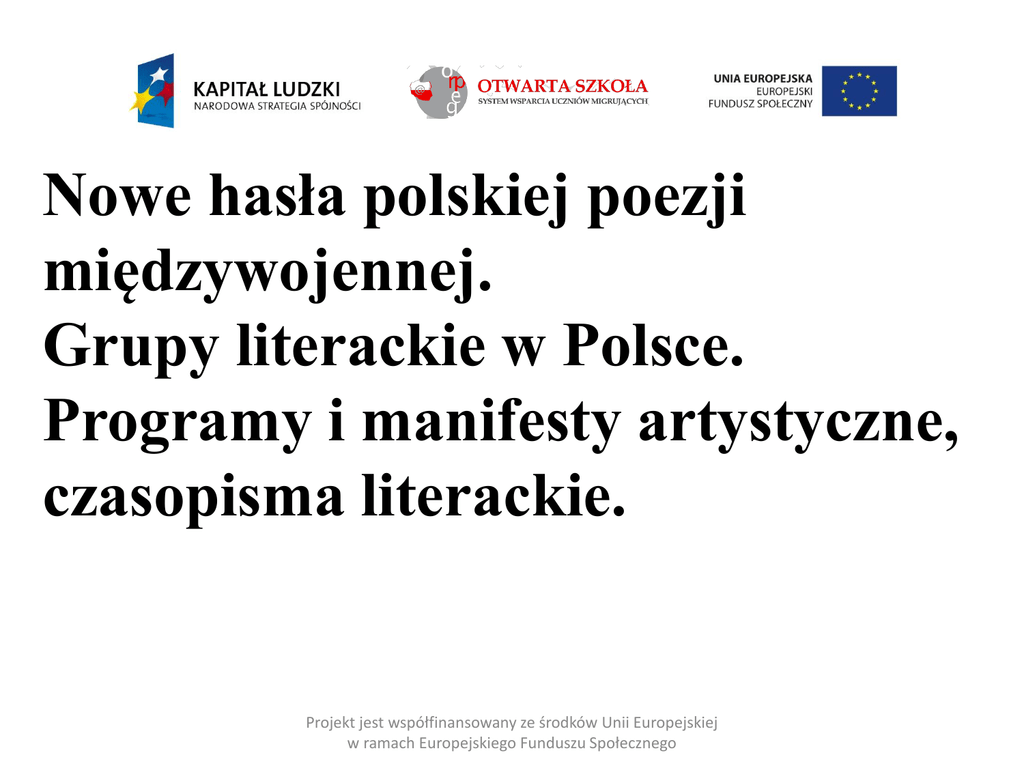 Nowe hasła polskiej poezji międzywojennej. Grupy literackie w Polsce. Programy i manifesty artystyczne, czasopisma literackie. Projekt jest współfinansowany ze środków Unii Europejskiej w ramach Europejskiego Funduszu Społecznego NURT TRADYCYJNY GRUPA POETYCKA „SKAMANDER” ukształtowana w Warszawie po roku 1918, skupiona wokół miesięcznika „Skamander”, wychodzącego w latach 1920 – 28 i 1935 – 39; zasadniczy skład grupy: J. Tuwim, A, Słonimski, J. Lechoń, J. Iwaszkiewicz, K. Wierzyński; luźno związani poeci: M. Pawlikowska – Jasnorzewska, Wł. Broniewski, K. Iłłakiewiczówna, J. Wittlin, J. Liebert. Projekt jest współfinansowany ze środków Unii Europejskiej w ramach Europejskiego Funduszu Społecznego Za swojego patrona grupa uważała L. Staffa. Nazwa pochodziła od mitologicznej rzeki opływającej Troję, poeci zaś wzięli ją bezpośrednio z „Akropolis” St. Wyspiańskiego: „Skamander połyska, wiślaną świetlący się falą”. Taki tytuł nosił miesięcznik poetycki – pismo, które stało się trybuną postulatów „Skamandra” – grupy poetów. Projekt jest współfinansowany ze środków Unii Europejskiej w ramach Europejskiego Funduszu Społecznego Postulaty: programowa zapowiedź bezprogramowości; prawo do swobody artystycznej, niechęć do patosu i kult talentu; poeta musi być rzemieślnikiem i uczciwym pracownikiem; „młodość” jako temat i siła twórcza. Projekt jest współfinansowany ze środków Unii Europejskiej w ramach Europejskiego Funduszu Społecznego Cechy poezji: zwrot do postawy aktywnej (poezja zaangażowana); tematyka miasta, tłumu, codzienności; w pierwszej fazie reprezentowali tematykę antyromantyczną, negowali poezję służącą narodowi – uważali, że wyzwolone państwo nie potrzebuje takiej poezji; nie negowali (tak jak awangarda) wytworów tradycji i kultury; pisali utwory przeznaczone do kabaretu. Projekt jest współfinansowany ze środków Unii Europejskiej w ramach Europejskiego Funduszu Społecznego Omawiane utwory Podręcznik - Witold Bobiński „Barwy epok. Kultura i literatura.” Odezwa i cennik usług – „Pod Picadorem” s. 49; Słowo wstępne, „Skamander” 1920, nr 1 s .51; Henri Matisse „Taniec II”, 1910 s. 34; Jan Lechoń „Herostrates” s. 51; Antoni Słonimski „Czarna wiosna” (frag.) s. 52; K. Wierzyński „Jestem jak….” s. 52; Julian Tuwim „Wiosna (Dytyramb)” s. 108; Projekt jest współfinansowany ze środków Unii Europejskiej w ramach Europejskiego Funduszu Społecznego DYTYRAMB – kunsztowna oda, pieśń pochwalna o charakterze wzniosłym lub ironicznym. Nazwa pochodzi od starożytnych hymnów ku czci Dionizosa o przydomku Dityrambos. Dytyramby cechuje patetyczna ekstaza, gwałtowność uczuć, styl śmiały, porywający, często hiperboliczny (przesadny, wyolbrzymiony). Projekt jest współfinansowany ze środków Unii Europejskiej w ramach Europejskiego Funduszu Społecznego Jan Lechoń „Mochnacki” s. 119 M. Pawlikowska – Jasnorzewska „Miłość”, „Fotografia” s. 129 Lata trzydzieste XX w. to koniec działalności grupy „Skamander”. Rozeszły się drogi poetów – przyjaciół, obrali różne kariery, poróżniły ich także poglądy polityczne. Lechoń i Iwaszkiewicz objęli stanowiska dyplomatyczne za granicą, Wierzyński związał się z prawicowym obozem sanacji, Słonimski zajął się publicystyką, a Tuwim coraz poważniejszymi, krytykującymi rzeczywistość tematami. Projekt jest współfinansowany ze środków Unii Europejskiej w ramach Europejskiego Funduszu Społecznego AWANGARDA KRAKOWSKA Program Awangardy Krakowskiej ukształtował się pod wpływem polemicznych sporów ze „Skamandrem”. Grupa powstała na początku lat dwudziestych XX w., za sprawą działalności poetów skupionych wokół Tadeusza Peipera i wydawanego przez niego pisma „Zwrotnica” (w dwóch seriach 1922-23 i 1926-27). Peiper – nazywany często „papieżem awangardy”, był teoretykiem grupy. Po powrocie z Hiszpanii w 1921 r. wydał programowe książki: „Nowe usta” i „Tędy”. Projekt jest współfinansowany ze środków Unii Europejskiej w ramach Europejskiego Funduszu Społecznego Skład Awangardy Krakowskiej to: Julian Przyboś, Adam Ważyk i Jalu Kurek. Ich program to idea nowej sztuki, którą określają: 3M – czyli miasto, masa, maszyna jako naczelne tematy poezji; Praca nad językiem poetyckim – „precz z watą słów” – sens tkwi w skrócie i sile metafory, w kondensacji znaczeń słowa; Poeta nie jest kapłanem, nie jest beztroskim lekkoduchem, lecz poważnym rzemieślnikiem, pracującym w materiale słowa. Projekt jest współfinansowany ze środków Unii Europejskiej w ramach Europejskiego Funduszu Społecznego OMAWIANE UTWORY: Tadeusz Peiper - fragmenty rozpraw s. 53-54; Julian Przyboś „Z Tatr” s. 139 Grupa przestała istnieć w latach trzydziestych XX w., lecz do jej założeń nawiązywały inne grupy, zwłaszcza awangarda lubelska. Najwybitniejszym poetą awangardy krakowskiej pozostał Julian Przyboś. Projekt jest współfinansowany ze środków Unii Europejskiej w ramach Europejskiego Funduszu Społecznego AWANGARDA LUBELSKA – 1927-1939. Jej najwybitniejszym przedstawicielem był Józef Czechowicz. Awangarda lubelska przejęła od krakowskiej zasadę poetyckich skrótów i płynnego obrazowania. Projekt jest współfinansowany ze środków Unii Europejskiej w ramach Europejskiego Funduszu Społecznego FUTURYZM Polscy futuryści nawiązywali w swojej twórczości do założeń futuryzmu europejskiego. Marinetti głosił, iż „ryczący automobil jest piękniejszy od Nike z Samotraki” a futuryści słynne G G A – czyli „Gga gąsiora jest piękniejsze od śpiewu słowika”. Futuryści byli pierwszym awangardowym kierunkiem w polskiej poezji, główna ich działalność przypada na lata 1918 – 1921. Projekt jest współfinansowany ze środków Unii Europejskiej w ramach Europejski