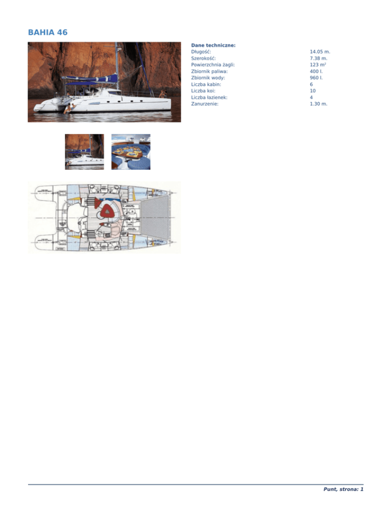 BAHIA 46 Dane techniczne: Długość: Szerokość: Powierzchnia żagli: Zbiornik paliwa: Zbiornik wody: Liczba kabin: Liczba koi: Liczba łazienek: Zanurzenie: 14.05 m. 7.38 m. 123 m2 400 l. 960 l. 6 10 4 1.30 m. Punt, strona: 1