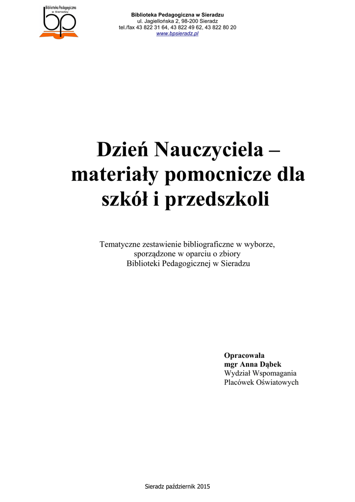 Biblioteka Pedagogiczna w Sieradzu ul. Jagiellońska 2, 98-200 Sieradz tel./fax 43 822 31 64, 43 822 49 62, 43 822 80 20 www.bpsieradz.pl Dzień Nauczyciela – materiały pomocnicze dla szkół i przedszkoli Tematyczne zestawienie bibliograficzne w wyborze, sporządzone w oparciu o zbiory Biblioteki Pedagogicznej w Sieradzu Opracowała mgr Anna Dąbek Wydział Wspomagania Placówek Oświatowych Sieradz październik 2015 Biblioteka Pedagogiczna w Sieradzu ul. Jagiellońska 2, 98-200 Sieradz tel./fax 43 822 31 64, 43 822 49 62, 43 822 80 20 www.bpsieradz.pl Zbiory zwarte 1. Bez kapelusza : propozycje imprez dla teatrzyku szkolnego / Wiesława Machura. - Kielce : Wydawnictwo Pedagogiczne ZNP, 1995. - S.17-20. ISBN 83-85230-59-9 Czytelnia Poddębice: sygn. 26348-Czyt.; Wypożyczalnia Łask: sygn. 29766; Wypożyczalnia Wieluń: sygn. 29206; Wypożyczalnia Sieradz: sygn. 98122 - 98123; Czytelnia Sieradz: sygn. 98121-Czyt.; 2. Gotowe scenariusze imprez szkolnych czyli Jak przygotować imprezę w szkole, aby nie była nudną "kuczcią" / Jerzy Hamerski. - Warszawa : Wydawnictwo Publicat, cop. 2011. S. 49-58 ISBN 978-83-245-1815-9 Wypożyczalnia Wieruszów: sygn. 22694; Czytelnia Sieradz: sygn. 117967-Czyt.; 3. Inscenizacje na każdą okazję : gimnazjum / Małgorzata Wieczorek, Dorota Wieczorek. Gdańsk : "Harmonia", 2003. - S. 13-35. ISBN 83-7134-123-7 Wypożyczalnia Wieruszów: sygn. 21306; Czytelnia Sieradz: sygn. 110024-Czyt.; 4. Malowane wierszem : scenariusze imprez okolicznościowych dla klas od 1-3 / Józef Marek Śnieciński. - Warszawa : "Żak", 1997. - S. 20-24. ISBN 83-86770-61-9 Czytelnia Poddębice: sygn. 27335-Czyt.; Czytelnia Łask: sygn. 25387-Czyt.; Wypożyczalnia Sieradz: sygn. 101725 - 101726; Czytelnia Sieradz: sygn. 101724-Czyt.; Czytelnia Zduńska Wola: sygn. 37405-Czyt.; 5. Moja rodzina, szkoła, Ojczyzna : scenariusze imprez okolicznościowych dla starszych klas szkoły podstawowej / Józef Marek Śnieciński. - Warszawa : "Żak", 1998. - S.25-34. ISBN 83-86770-66-X Czytelnia Poddębice: sygn. 27399-Czyt.; Wypożyczalnia Wieruszów: sygn. 19606; Czytelnia Łask: sygn. 25378-Czyt.; Wypożyczalnia Sieradz: sygn. 102505 - 102506; Czytelnia Sieradz: sygn. 102504-Czyt.; Czytelnia Zduńska Wola: sygn. 36674-Czyt.; 6. Mój mały świat : scenariusze imprez okolicznościowych dla przedszkoli / Józef Marek Śnieciński ; rysunki Kasia Śniecińska. - Warszawa : "Żak", 1996. - S. 19-23; 88-92. ISBN 83-86770-22-8 Czytelnia Poddębice: sygn. 26822-Czyt.; Czytelnia Łask: sygn. 25786-Czyt.; Wypożyczalnia Wieluń: sygn. 32719; Wypożyczalnia Sieradz: sygn. 101909 - 101911; Czytelnia Sieradz: sygn. 99820-Czyt.; Wypożyczalnia Zduńska Wola: sygn. 37135; Sieradz październik 2015 Biblioteka Pedagogiczna w Sieradzu ul. Jagiellońska 2, 98-200 Sieradz tel./fax 43 822 31 64, 43 822 49 62, 43 822 80 20 www.bpsieradz.pl 7. Na szkolnej scenie / Elżbieta Gałczyńska, Elżbieta Szczepańska, Urszula Wójcik. - Płock : Wydawnictwo "Korepetytor" Marian Gałczyński, 1997. - S.7-25. ISBN 83-86356-21-9 Wypożyczalnia Wieruszów: sygn. 19771; Czytelnia Sieradz: sygn. 106563-Czyt.; 8. Nauczycielom - uczniowie : wiersze, inscenizacje i piosenki na uroczystości nauczycielskie / wybór i oprac. Emilia Frątczak, Jan Frątczak. - Bydgoszcz : "Arcanus", 1995. ISBN 83-90769-20 Czytelnia Poddębice: sygn. 26094-Czyt.; Wypożyczalnia Sieradz: sygn. 97133; Czytelnia Sieradz: sygn. 97131-Czyt.; Dział informacyjno-bibliograf.: sygn. 97132-Inf.; Czytelnia Zduńska Wola: sygn. 35871-Czyt.; 9. Pinokio... a jak myślisz? : scenariusze uroczystości szkolnych dla szkół podstawowych / Jan Jakub Należyty ; oprac. metod. Lena Jankowska-Poleganow. - Wyd. 2. - Warszawa : "Fraszka Edukacyjna", 2003. - S. 30-35. ISBN 83-88839-70-5 Wypożyczalnia Sieradz: sygn. 113440; Czytelnia Sieradz: sygn. 113439-Czyt.; 10. Pomysł na niebanalną uroczystość szkolną / Jolanta Zabielska. - Kraków : "Impuls", 2010. S. 27-34. ISBN 978-83-7587-287-3 Wypożyczalnia Wieluń: sygn. 34792; Czytelnia Sieradz: sygn. 116899-Czyt.; 11. Radosne przedszkole: tematy kompleksowe: zabawy, opowiadania, teatrzyki, wiersze na cały rok / Dorota Niewola. - Kraków: Impuls, 2013. ISBN 978-83-7850-433-7 ISBN 978-83-7850-425-2 Wypożyczalnia Wieruszów: sygn. 23133; 12. Scenariusze imprez szkolnych dla klas I-III / pod red. Ireny Służewskiej i Ireny ChyłySzypułowej. - Kielce : Wydawnictwo Pedagogiczne ZNP, 1995. - S. 35-42. ISBN 83-85230-34-3 Czytelnia Poddębice: sygn. 26703-Czyt.; Wypożyczalnia Sieradz: sygn. 98113 - 98114; Czytelnia Sieradz: sygn. 98112-Czyt.; 13. Scenariusze szkolnych przedstawień teatralnych dla szkół podstawowych / Zofia Kaliska, Beata Jacewicz. - Białystok : "Printex", 2010. - S. 5-11. ISBN 978-83-60826-20-1 Czytelnia Sieradz: sygn. 117418-Czyt.; 14. Scenariusze uroczystości szkolnych : szkoła podstawowa. Cz. 2 / red. Krystyna Radwan. Kraków : "Rubikon", cop. 2004. - S. 42-45. ISBN 83-88725-76-9 Czytelnia Sieradz: sygn. 112225-Czyt.; Sieradz październik 2015 Biblioteka Pedagogiczna w Sieradzu ul. Jagiellońska 2, 98-200 Sieradz tel./fax 43 822 31 64, 43 822 49 62, 43 822 80 20 www.bpsieradz.pl 15. Scenariusze uroczystości szkolnych dla klas IV-VIII. Cz. 1 / [Halina Jelonek et al.]. - Kielce : Agencja Wydawnicza "Puch", 1992. - S.43-53. ISBN 83-85698-05-1 Wypożyczalnia Sieradz: sygn. 92027; Czytelnia Sieradz: sygn. 92026-Czyt.; 16. Scenariusze uroczystości szkolnych dla klas IV-VIII. Cz. 2. Na akademii i szkolnym apelu : (wybór wierszy i piosenek) / wyboru dokonała Barbara Mida, Ewa Pobratyn. - Kielce : Agencja Wydawnicza "Puch", 1993. - S. 11-20. ISBN 83-85-698-02-7 Wypożyczalnia Sieradz: sygn. 95262; Czytelnia Sieradz: sygn. 95263-Czyt.; 17. Słowa jak kwiaty / Józef Marek Śnieciński. - Warszawa : "Żak", 1995. - S. 17-29. ISBN 83-86770-07-2 Czytelnia Poddębice: sygn. 26215-Czyt.; Wypożyczalnia Wieruszów: sygn. 19350; Wypożyczalnia Łask: sygn. 24358; Czytelnia Łask: sygn. 24357-Czyt.; Wypoży