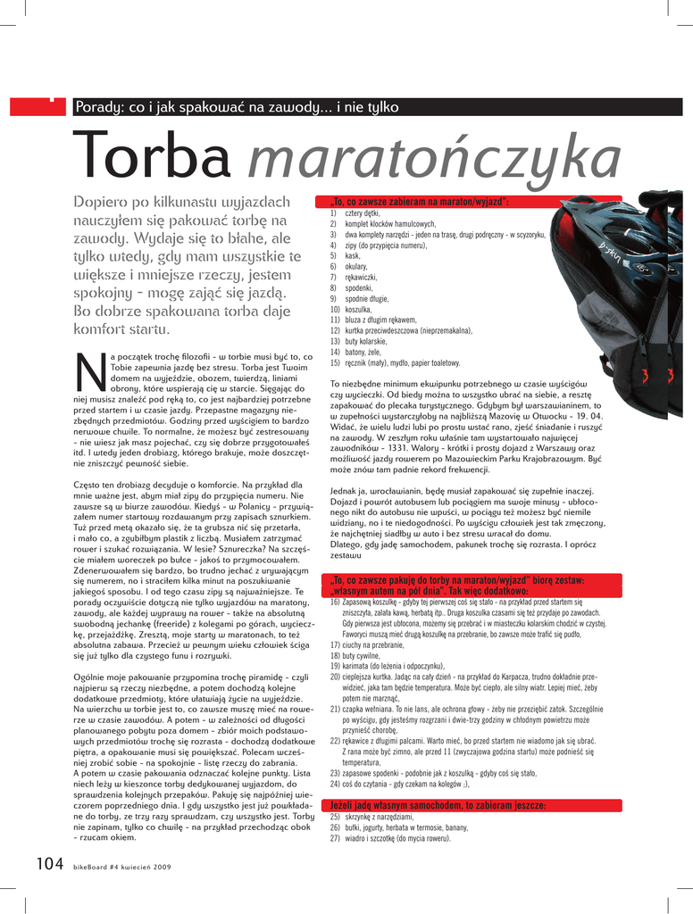 Porady: co i jak spakować na zawody... i nie tylko Torba maratończyka Dopiero po kilkunastu wyjazdach nauczyłem się pakować torbę na zawody. Wydaje się to błahe, ale tylko wtedy, gdy mam wszystkie te większe i mniejsze rzeczy, jestem spokojny - mogę zająć się jazdą. Bo dobrze spakowana torba daje komfort startu. N a początek trochę filozofii - w torbie musi być to, co Tobie zapewnia jazdę bez stresu. Torba jest Twoim domem na wyjeździe, obozem, twierdzą, liniami obrony, które wspierają cię w starcie. Sięgając do niej musisz znaleźć pod ręką to, co jest najbardziej potrzebne przed startem i w czasie jazdy. Przepastne magazyny niezbędnych przedmiotów. Godziny przed wyścigiem to bardzo nerwowe chwile. To normalne, że możesz być zestresowany - nie wiesz jak masz pojechać, czy się dobrze przygotowałeś itd. I wtedy jeden drobiazg, którego brakuje, może doszczętnie zniszczyć pewność siebie. Często ten drobiazg decyduje o komforcie. Na przykład dla mnie ważne jest, abym miał zipy do przypięcia numeru. Nie zawsze są w biurze zawodów. Kiedyś - w Polanicy - przywiązałem numer startowy rozdawanym przy zapisach sznurkiem. Tuż przed metą okazało się, że ta grubsza nić się przetarła, i mało co, a zgubiłbym plastik z liczbą. Musiałem zatrzymać rower i szukać rozwiązania. W lesie? Sznureczka? Na szczęście miałem woreczek po bułce - jakoś to przymocowałem. Zdenerwowałem się bardzo, bo trudno jechać z urywającym się numerem, no i straciłem kilka minut na poszukiwanie jakiegoś sposobu. I od tego czasu zipy są najważniejsze. Te porady oczywiście dotyczą nie tylko wyjazdów na maratony, zawody, ale każdej wyprawy na rower - także na absolutną swobodną jechankę (freeride) z kolegami po górach, wycieczkę, przejażdżkę. Zresztą, moje starty w maratonach, to też absolutna zabawa. Przecież w pewnym wieku człowiek ściga się już tylko dla czystego funu i rozrywki. Ogólnie moje pakowanie przypomina trochę piramidę - czyli najpierw są rzeczy niezbędne, a potem dochodzą kolejne dodatkowe przedmioty, które ułatwiają życie na wyjeździe. Na wierzchu w torbie jest to, co zawsze muszę mieć na rowerze w czasie zawodów. A potem - w zależności od długości planowanego pobytu poza domem - zbiór moich podstawowych przedmiotów trochę się rozrasta - dochodzą dodatkowe piętra, a opakowanie musi się powiększać. Polecam wcześniej zrobić sobie - na spokojnie - listę rzeczy do zabrania. A potem w czasie pakowania odznaczać kolejne punkty. Lista niech leży w kieszonce torby dedykowanej wyjazdom, do sprawdzenia kolejnych przepaków. Pakuję się najpóźniej wieczorem poprzedniego dnia. I gdy wszystko jest już powkładane do torby, ze trzy razy sprawdzam, czy wszystko jest. Torby nie zapinam, tylko co chwilę - na przykład przechodząc obok - rzucam okiem. 104 bi ke Bo ar d # 4 k wi ecień 2009 „To, co zawsze zabieram na maraton/wyjazd”: 1) 2) 3) 4) 5) 6) 7) 8) 9) 10) 11) 12) 13) 14) 15) cztery dętki, komplet klocków hamulcowych, dwa komplety narzędzi - jeden na trasę, drugi podręczny - w scyzoryku, zipy (do przypięcia numeru), kask, okulary, rękawiczki, spodenki, spodnie długie, koszulka, bluza z długim rękawem, kurtka przeciwdeszczowa (nieprzemakalna), buty kolarskie, batony, żele, ręcznik (mały), mydło, papier toaletowy. To niezbędne minimum ekwipunku potrzebnego w czasie wyścigów czy wycieczki. Od biedy można to wszystko ubrać na siebie, a resztę zapakować do plecaka turystycznego. Gdybym był warszawianinem, to w zupełności wystarczyłoby na najbliższą Mazovię w Otwocku - 19. 04. Widać, że wielu ludzi lubi po prostu wstać rano, zjeść śniadanie i ruszyć na zawody. W zeszłym roku właśnie tam wystartowało najwięcej zawodników - 1331. Walory - krótki i prosty dojazd z Warszawy oraz możliwość jazdy rowerem po Mazowieckim Parku Krajobrazowym. Być może znów tam padnie rekord frekwencji. Jednak ja, wrocławianin, będę musiał zapakować się zupełnie inaczej. Dojazd i powrót autobusem lub pociągiem ma swoje minusy - ubłoconego nikt do autobusu nie wpuści, w pociągu też możesz być niemile widziany, no i te niedogodności. Po wyścigu człowiek jest tak zmęczony, że najchętniej siadłby w auto i bez stresu wracał do domu. Dlatego, gdy jadę samochodem, pakunek trochę się rozrasta. I oprócz zestawu „To, co zawsze pakuję do torby na maraton/wyjazd” biorę zestaw: „własnym autem na pół dnia”. Tak więc dodatkowo: 16) Zapasową koszulkę - gdyby tej pierwszej coś się stało - na przykład przed startem się zniszczyła, zalała kawą, herbatą itp.. Druga koszulka czasami się też przydaje po zawodach. Gdy pierwsza jest ubłocona, możemy się przebrać i w miasteczku kolarskim chodzić w czystej. Faworyci muszą mieć drugą koszulkę na przebranie, bo zawsze może trafić się pudło, 17) ciuchy na przebranie, 18) buty cywilne, 19) karimata (do leżenia i odpoczynku), 20) cieplejsza kurtka. Jadąc na cały dzień - na przykład do Karpacza, trudno dokładnie przewidzieć, jaka tam będzie temperatura. Może być ciepło, ale silny wiatr. Lepiej mieć, żeby potem nie marznąć, 21) czapka wełniana. To nie lans, ale ochrona głowy - żeby nie przeziębić zatok. Szczególnie po wyścigu, gdy jesteśmy rozgrzani i dwie-trzy godziny w chłodnym powietrzu może przynieść chorobę, 22) rękawice z długimi palcami. Warto mieć, bo przed startem nie wiadomo jak się ubrać. Z rana może być zimno, ale przed 11 (zwyczajowa godzina startu) może podnieść się temperatura, 23) zapasowe spodenki - podobnie jak z koszulką - gdyby coś się stało, 24) coś do czytania - gdy czekam na kolegów ;), Jeżeli jadę własnym samochodem, to zabieram jeszcze: 25) skrzynkę z narzędziami, 26) bułki, jogurty, herbata w termosie, banany, 27) wiadro i szczotkę (do mycia roweru).