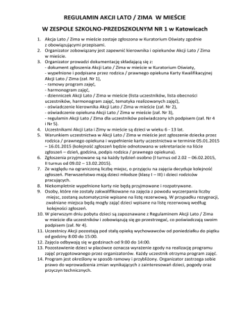 REGULAMIN AKCJI LATO / ZIMA W MIEŚCIE W ZESPOLE SZKOLNO-PRZEDSZKOLNYM NR 1 w Katowicach 1. Akcja Lato / Zima w mieście zostaje zgłoszona w Kuratorium Oświaty zgodnie z obowiązującymi przepisami. 2. Organizator zobowiązany jest zapewnić kierownika i opiekunów Akcji Lato / Zima w mieście. 3. Organizator prowadzi dokumentację składającą się z: - dokument zgłoszenia Akcji Lato / Zima w mieście w Kuratorium Oświaty, - wypełnione i podpisane przez rodzica / prawnego opiekuna Karty Kwalifikacyjnej Akcji Lato / Zima (zał. Nr 1), - ramowy program zajęć, - harmonogram zajęć, - dzienniczek Akcji Lato / Zima w mieście (lista uczestników, lista obecności uczestników, harmonogram zajęć, tematyka realizowanych zajęć), - oświadczenie kierownika Akcji Lato / Zima w mieście (zał. Nr 2), - oświadczenie opiekuna Akcji Lato / Zima w mieście (zał. Nr 3), - regulamin Akcji Lato / Zima dla uczestników poświadczony ich podpisem (zał. Nr 4 i Nr 5). 4. Uczestnikami Akcji Lata i Zimy w mieście są dzieci w wieku 6 - 13 lat. 5. Warunkiem uczestnictwa w Akcji Lato / Zima w mieście jest zgłoszenie dziecka przez rodzica / prawnego opiekuna i wypełnienie karty uczestnictwa w terminie 05.01.2015 – 16.01.2015 (kolejność zgłoszeń będzie odnotowana w sekretariacie na liście zgłoszeń – dzień, godzina, podpis rodzica / prawnego opiekuna). 6. Zgłoszenia przyjmowane są na każdy tydzień osobno (I turnus od 2.02 – 06.02.2015, II turnus od 09.02 – 13.02.2015). 7. Ze względu na ograniczoną liczbę miejsc, o przyjęciu na zajęcia decyduje kolejność zgłoszeń. Pierwszeństwo mają dzieci młodsze (klasy I – III) i dzieci rodziców pracujących. 8. Niekompletnie wypełnione karty nie będą przyjmowane i rozpatrywane. 9. Osoby, które nie zostały zakwalifikowane na zajęcia z powodu wyczerpania liczby miejsc, zostaną automatycznie wpisane na listę rezerwową. W przypadku rezygnacji, zwalniane miejsca będą mogły zająć dzieci wpisane na listę rezerwową według kolejności zgłoszeń. 10. W pierwszym dniu pobytu dzieci są zapoznawane z Regulaminem Akcji Lato / Zima w mieście dla uczestników i zobowiązują się go przestrzegać, co poświadczają swoim podpisem (zał. Nr 4). 11. Uczestnicy Akcji pozostają pod stałą opieką wychowawców od poniedziałku do piątku od godziny 8:00 do 15:00. 12. Zajęcia odbywają się w godzinach od 9:00 do 14:00. 13. Pozostawienie dzieci w placówce oznacza wyrażenie zgody na realizację programu zajęć przygotowanego przez organizatorów. Każdy uczestnik otrzyma program zajęć. 14. Program jest określony w sposób ramowy i przybliżony. Organizator zastrzega sobie prawo do wprowadzenia zmian wynikających z zainteresowań dzieci, pogody oraz przyczyn technicznych.