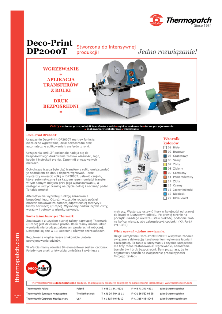 Deco-Print DP2000T Stworzona do intensywnej produkcji! Jedno rozwiązanie! WGRZEWANIE + APLIKACJA TRANSFERÓW Z ROLKI + DRUK BEZPOŚREDNI = Zalety automatyczny podajnik transferów z rolki szybkie znakowanie znakowanie wielokolorowe wgrzewanie łatwe pozycjonowanie Deco-Print DP2000T Wzornik kolorów Urządzenie Deco-Print DP2000T ma trzy funkcje: niezależne wgrzewanie, druk bezpośredni oraz automatyczne aplikowanie transferów z rolki. 01 Biały Urządzenia serii „T” doskonale nadają się do bezpośredniego drukowania znaków własności, logo, kodów i instrukcji prania. Zapomnij o wszywanych metkach. 02 Brązowy Dotychczas trzeba było ciąć transfery z rolki, umiejscawiać je nadrukiem do dołu i dopiero wgrzewać. Teraz wystarczy umieścić rolkę w DP2000T, ustawić czujnik, który automatycznie i za każdym razem umieści transfer w tym samym miejscu przy jego wprasowywaniu, a następnie ułożyć tkaninę na płycie dolnej i nacisnąć pedał. To takie proste! 08 Zielony 03 Granatowy 05 Szary 07 Żółty Alternatywnie wypróbuj funkcję znakowania bezpośredniego. Odzież i wszystkie rodzaje pościeli możesz znakować za pomocą odpowiedniej matrycy i taśmy barwiącej (C-tape). Wykonany nadruk będzie ostry, wyraźny i gotowy w ułamku sekundy. Sucha taśma barwiąca Thermark thermopatch.com Znakowanie z użyciem suchej taśmy barwiącej Thermark (C-tape) jest dziecinnie proste. Rolki taśmy można łatwo wymienić nie brudząc palców ani powierzchni roboczej. Dostępne są one w 13 kolorach i różnych szerokościach. Jan 2015 PL Regulowana wiązka lasera znakomicie ułatwia pozycjonowanie odzieży. W ofercie mamy również 94-elementowy zestaw czcionek. Pojedyncze znaki z łatwością umieścisz i wyjmiesz z 09 Czerwony 11 Pomarańczowy 14 Złoty 15 Czarny 16 Jasnoniebieski 17 Niebieski 22 Ultra Violet matrycy. Wystarczy ustawić litery w kolejności od prawej do lewej w lustrzanym odbiciu. Po prawej stronie na początku każdego wiersza ustaw blokadę, podobnie zrób na końcu wiersza, aby zabezpieczyć czcionki. (Kit Part# PM-1330) Wiele wyzwań – jedno rozwiązanie. Dzięki urządzeniu Deco-PrintDP2000T wszystkie zadania związane z dekoracją i znakowaniem wykonasz łatwiej i oszczędniej. To tanie w utrzymaniu i szybkie urządzenie ma trzy różne zastosowania: wgrzewanie, nanoszenie transferów i druk bezpośredni. Sam przyznasz, że to najprostszy sposób na zwiększenie produkcyjności Twojego zakładu. Thermopatch Polska dane techniczne produktu znajdują sie w broszurce dostępnej na naszej stronie internetowej: www.thermopatch.com Thermopatch Polska Poland T +48 71 341 4331 F +48 71 341 4331 [email protected] Thermopatch European Headquarters The Netherlands T +31 36 549 11 11 F +31 36 532 03 98 [email protected] Thermopatch Corporate Headquarters USA T +1 315 446-8110 F +1 315 445-8046 [email protected]