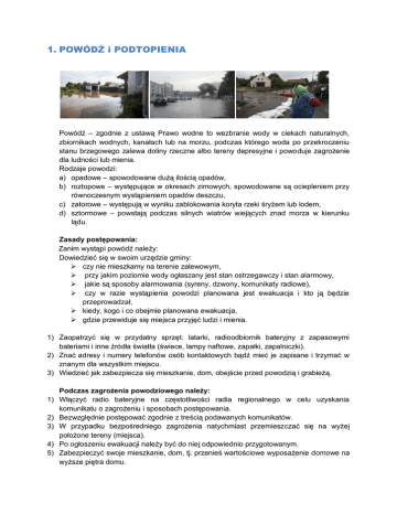1. POWÓDŹ i PODTOPIENIA Powódź – zgodnie z ustawą Prawo wodne to wezbranie wody w ciekach naturalnych, zbiornikach wodnych, kanałach lub na morzu, podczas którego woda po przekroczeniu stanu brzegowego zalewa doliny rzeczne albo tereny depresyjne i powoduje zagrożenie dla ludności lub mienia. Rodzaje powodzi: a) opadowe – spowodowane dużą ilością opadów, b) roztopowe – występujące w okresach zimowych, spowodowane są ociepleniem przy równoczesnym wystąpieniem opadów deszczu, c) zatorowe – występują w wyniku zablokowania koryta rzeki śryżem lub lodem, d) sztormowe – powstają podczas silnych wiatrów wiejących znad morza w kierunku lądu. Zasady postępowania: Zanim wystąpi powódź należy: Dowiedzieć się w swoim urzędzie gminy: czy nie mieszkamy na terenie zalewowym, przy jakim poziomie wody ogłaszany jest stan ostrzegawczy i stan alarmowy, jakie są sposoby alarmowania (syreny, dzwony, komunikaty radiowe), czy w razie wystąpienia powodzi planowana jest ewakuacja i kto ją będzie przeprowadzał, kiedy, kogo i co obejmie planowana ewakuacja, gdzie przewiduje się miejsca przyjęć ludzi i mienia. 1) Zaopatrzyć się w przydatny sprzęt: latarki, radioodbiornik bateryjny z zapasowymi bateriami i inne źródła światła (świece, lampy naftowe, zapałki, zapalniczki). 2) Znać adresy i numery telefonów osób kontaktowych bądź mieć je zapisane i trzymać w znanym dla wszystkim miejscu. 3) Wiedzieć jak zabezpiecza się mieszkanie, dom, obejście przed powodzią i grabieżą. 1) 2) 3) 4) 5) Podczas zagrożenia powodziowego należy: Włączyć radio bateryjne na częstotliwości radia regionalnego w celu uzyskania komunikatu o zagrożeniu i sposobach postępowania. Bezwzględnie postępować zgodnie z treścią podawanych komunikatów. W przypadku bezpośredniego zagrożenia natychmiast przemieszczać się na wyżej położone tereny (miejsca). Po ogłoszeniu ewakuacji należy być do niej odpowiednio przygotowanym. Zabezpieczyć swoje mieszkanie, dom, tj. przenieś wartościowe wyposażenie domowe na wyższe piętra domu. 6) Odłączyć urządzenia elektryczne. 7) Wyłączyć sieć gazową i wodociągową. 8) Nie używać w gospodarstwie domowym wód gruntowych, gdyż mogą być zatrute (skażone). 9) Nie przemieszczać się po obszarach zalanych, a jeżeli jest taka konieczność, użyć tyczki do badania gruntu przed sobą, a do przejścia wybierać miejsca bez silnego nurtu. 10) Należy pamiętać, że zachowanie trzeźwości umysłu bez wywoływania paniki to połowa sukcesu. 1) 2) 3) 4) 5) 6) 7) 8) Po powodzi należy: Nie używać wód powodziowych do picia!. Jak najdłużej pozostać poza zasięgiem wód powodziowych. Być ostrożnym podczas wejścia na tereny dotknięte powodzią. Mieć włączony odbiornik radiowy w celu uzyskania informacji lokalnych dotyczących udzielanej pomocy. Zachować zasady higieny – często myć ręce mydłem w czystej wodzie. Wyrzucić żywność, która miała kontakt z wodami powodziowymi. Poinformować odpowiednie służby o zerwanych liniach energetycznych, nieszczelności rurociągu gazowego lub o innych zagrożeniach występujących na zalanym terenie. Zdezynfekować mieszkanie i wszystkie sprzęty, przydatne do dalszego użytkowania. 2. WICHURY I SILNE WIATRY 1) 2) 3) 4) 5) Zanim wystąpi wichura należy: Wiedzieć, jak postępować w czasie huraganu. Wiedzieć jak wyłączać gaz, elektryczność i wodę. Opracować plan komunikowania się w czasie zagrożenia na okoliczność, gdy członkowie rodziny są rozdzieleni. Wiedzieć jak wezwać służby ratownicze: policję lub straż pożarną. Wiedzieć, które radio jest nastrojone na odbiór informacji o stanie zagrożenia. Podczas wystąpienia wichury należy: 1) Mieć włączone radio bateryjne na częstotliwości radia regionalnego albo rozgłośni lokalnej, w celu uzyskania komunikatu o zagrożeniu i sposobach postępowania. 2) Zabezpieczyć swoje mieszkanie lub dom poprzez: zamknięcie okien, zabezpieczenie lamp i innych urządzeń, które mogą ulec zniszczeniu, usunięcie z parapetów i balkonów przedmiotów, które mogą zagrażać, uprzątnięcie z obejścia przedmiotów, które mogłyby narobić szkód porwane przez wiatr, 3) Zabezpieczyć się w latarki elektryczne, baterie do nich, świece, itp. 4) Sprawdzić stan apteczki pierwszej pomocy i zaopatrzyć się w niezbędne materiały i leki. 5) Przygotować rzeczy, które mogą być potrzebne w czasie ewakuacji. 6) Schować się w środkowych i najniższych partiach budynku z dala od oszklonych okien, dachów i drzwi. 7) Pozostać w miejscu, aż huragan nie przejdzie. 8) Nie zatrzymywać się pod trakcjami elektrycznymi, planszami reklamowymi, drzewami itp. Po ogłoszeniu ewakuacji należy: 1) Wyruszyć tak szybko, jak to tylko możliwe, 2) Zawiadomić kogoś poza zasięgiem wichury, dokąd się ewakuuje, 3) Zabrać przygotowany wcześniej podręczny bagaż oraz ciepłą odzież. 1) 2) 3) 4) Po ustąpieniu wichury należy: Udzielić pierwszej pomocy rannym i poszkodowanym osobom. Unikać leżących lub zwisających przewodów elektrycznych. Ostrożnie wchodzić do swego domu. Należy poinformować o wszystkich zdarzeniach mających istotne znaczenie dla bezpieczeństwa ludzi specjalistyczne służby ratunkowe: Państwową Straż Pożarną, Policję, pogotowie energetyczne, gazowe, inne. 3. ŚNIEŻYCE, ZAMIECIE, ZAWIEJE Postępowanie podczas wystąpienia śnieżyc: 1) W czasie opadów w miarę możliwości należy pozostać w domu. 2) Jeżeli trzeba wyjść na zewnątrz, należy ubrać się w ciepłą odzież wielowarstwową i powiadomić kogokolwiek o docelowym miejscu podróży oraz przewidywanym czasie dotarcia na miejsce przeznaczenia. 3) Należy zachować ostrożność poruszając się po zaśnieżonym i oblodzonym terenie, zwrócić uwagę na zwisające sople, zwały śniegu na dachach budynków itp. 4) W przypadku dłuższego przebywania na zewnątrz podczas śnieżycy należy: zwróci