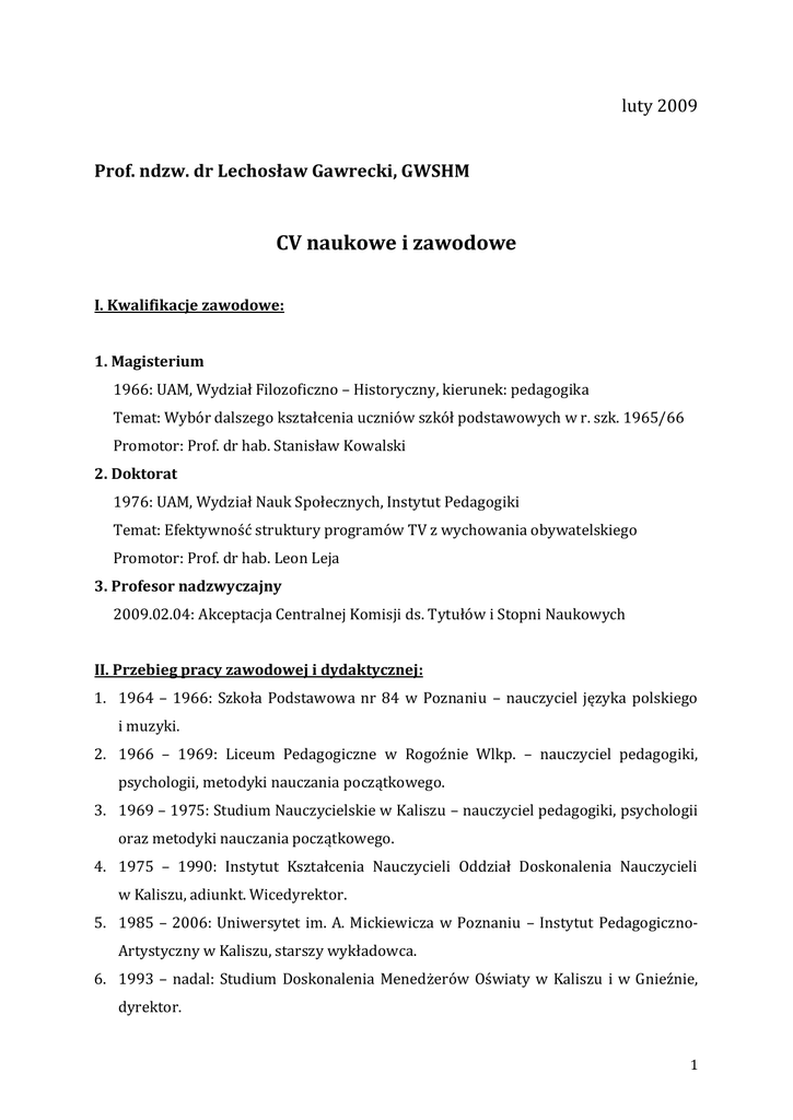 luty 2009 Prof. ndzw. dr Lechosław Gawrecki, GWSHM CV naukowe i zawodowe I. Kwalifikacje zawodowe: 1. Magisterium 1966: UAM, Wydział Filozoficzno – Historyczny, kierunek: pedagogika Temat: Wybór dalszego kształcenia uczniów szkół podstawowych w r. szk. 1965/66 Promotor: Prof. dr hab. Stanisław Kowalski 2. Doktorat 1976: UAM, Wydział Nauk Społecznych, Instytut Pedagogiki Temat: Efektywność struktury programów TV z wychowania obywatelskiego Promotor: Prof. dr hab. Leon Leja 3. Profesor nadzwyczajny 2009.02.04: Akceptacja Centralnej Komisji ds. Tytułów i Stopni Naukowych II. Przebieg pracy zawodowej i dydaktycznej: 1. 1964 – 1966: Szkoła Podstawowa nr 84 w Poznaniu – nauczyciel języka polskiego i muzyki. 2. 1966 – 1969: Liceum Pedagogiczne w Rogoźnie Wlkp. – nauczyciel pedagogiki, psychologii, metodyki nauczania początkowego. 3. 1969 – 1975: Studium Nauczycielskie w Kaliszu – nauczyciel pedagogiki, psychologii oraz metodyki nauczania początkowego. 4. 1975 – 1990: Instytut Kształcenia Nauczycieli Oddział Doskonalenia Nauczycieli w Kaliszu, adiunkt. Wicedyrektor. 5. 1985 – 2006: Uniwersytet im. A. Mickiewicza w Poznaniu – Instytut PedagogicznoArtystyczny w Kaliszu, starszy wykładowca. 6. 1993 – nadal: Studium Doskonalenia Menedżerów Oświaty w Kaliszu i w Gnieźnie, dyrektor. 1 7. 2003 – nadal: Gnieźnieńska Wyższa Szkoła Humanistyczno-Menedżerska „Milenium”, profesor nadzwyczajny, założyciel i rektor. III. Kierowanie pracami magisterskimi i dyplomowymi: 1. Promotor około 400 prac magisterskich i licencjackich. 2. Promotor około 500 obronionych prac dyplomowych na Studiach Podyplomowych Organizacji i Zarządzania Oświatą. IV. Funkcje naukowe: 1971 – 1987: Konsultant naukowy w Redakcji Programów Szkolnych Telewizji Polskiej. 1983 – 1988: Konsultant naukowy w Dziale Programów dla Szkół Polskiego Radia. 2004 – 2005: Członek Komitetu Naukowego przygotowującego Międzynarodowy Kongres Edukacyjny „Edukacja polska w zjednoczonej Europie” (organizator: Związek Nauczycielstwa Polskiego). V. Szczególne osiągnięcia zawodowe: 1993 – nadal: Założyciel – według własnej autorskiej koncepcji – Studium Doskonalenia Menedżerów Oświaty (SDMO) w Kaliszu a od 2004 roku również w Gnieźnie. Placówka ogólnopolska, specjalizująca się w menedżerskim kształceniu na studiach podyplomowych (we współpracy ze szkołami wyższymi) i kursach kierowniczej kadry oświaty. Ponad 6 tysięcy absolwentów z całego kraju. Słuchacze SDMO spotykali się z najbardziej znaczącymi politykami m. in. z ministrem edukacji R. Czarnym, ministrem ds. samorządu M. Kuleszą, pięcioma wiceministrami MEN, wiceprezesem NIK Z. Wesołowskim. Do Kalisza i Gniezna na spotkania z słuchaczami SDMO przyjeżdżali wybitni specjaliści w dziedzinie pedagogiki, psychologii i socjologii: profesorowie: W. Kobyliński, J. Kurnal, J. Radziewicz, T. Pilch, Z. Melosik, L. Gapik, S. Kwiatkowski, P. Buczkowski, J. Gęsicki, B. Śliwerski, A. Nalaskowski, A. Wiszniewski (komunikacja społeczna) oraz profesorowie bibliotekoznawstwa: K. Migoń i M. Skalska-Zlat. Studium organizuje dla swoich słuchaczy i absolwentów również wizyty i staże zagraniczne. (Niemcy, Austria, Szwajcaria, Anglia, Francja). Organizuje też konferencje naukowe: Menedżerskie zarządzanie szkołą; 2003 (organizator: prof. L. Gawrecki), Szkoła polska na tle porównawczym; 2006 (organizator: prof. E. Potulicka), Dyscyplina 2 i kierowanie klasą szkolną – konteksty, problemy, rozwiązania praktyczne; 2007 (organizator: prof. Ewa Filipiak), Szkoła polska w XXI wieku; 2008 (organizator: prof. L. Gawrecki). 2002 – nadal: Jednoosobowy założyciel Gnieźnieńskiej Wyższej Szkoły Humanistyczno-Menedżerskiej „Milenium” – uczelni niepublicznej. W roku akademickim 2007/08 studiowało tu około 1300 studentów na trzech wydziałach: Zarządzania i Marketingu, Pedagogiki i Kulturoznawstwa. VI. Funkcje administracyjne: 1. 1975 – 1977: Kierownik Studiów Podyplomowych Organizacji i Zarządzania Oświatą. 2. 1977 – 1985: Kierownik Zaocznych Studiów Magisterskich – kierunek nauczanie początkowe (ok. 500 absolwentów). 3. 1986 – 1989: Kierownik Studiów Podyplomowych Organizacji i Zarządzania Oświatą. 4. 1989 – 1990: Wicedyrektor Oddziału Centrum Doskonalenia Nauczycieli w Kaliszu. 5. 1993 – nadal: Dyrektor Studium Doskonalenia Menedżerów Oświaty w Kaliszu i w Gnieźnie. 6. 2002 – nadal: Założyciel Gnieźnieńskiej Wyższej Szkoły Humanistyczno- Menedżerskiej „Milenium” w Gnieźnie. 7. 2007 – nadal: Rektor Gnieźnieńskiej Wyższej Szkoły Humanistyczno-Menedżerskiej „Milenium” w Gnieźnie. VII. Funkcje społeczne: 1. 1983 – 1994: Ławnik w Sądzie Rejonowym w Kaliszu. 2. 1990 – 1994: Sekretarz Krajowej Sekcji Kształcenia i Doskonalenia Nauczycieli przy Zarządzie Głównym Związku Nauczycielstwa Polskiego. VIII. Dane o publikacjach: 1. Publikacje naukowe i popularno-naukowe: · książki wydane: 10, · artykuły naukowe: ukazały się w wydawnictwach zwartych oraz w czasopismach, m.in.: Nauczyciel i Wychowanie, Chowanna, Neodidagmata, Nowa Szkoła, News Nowości Oświaty, Oświata i Wychowanie, Życie Szkoły, Przekazy i Opinie, Dyrektor Szkoły. 3 2. Redaktor Głosu Dyrektora-Menedżera – dodatku cyklicznego do Głosu Polityce, Głosie Nauczycielskiego. Ukazało się 25 numerów w latach 1997 – 2000. 3. Publicystyka oświatowa: około 100 artykułów w m.in.: Nauczycielskim, Życiu Literackim, Tygodniku Kulturalnym, Rzeczpospolitej. 4. Autorskie audycje radiowe i programy telewizyjne: · 1983 - 1987: Nauczycielski Uniwersytet Radiowo–Telewizyjny NURT (5 programów autorskich; 2 w radiu, 3 w telewizji), · 1985 - 1989: cykl radiowy pod tytułem. Radio w szkole (10 audycji): autor koncepcji cyklu i poszczególnych audycji, · 1988 - 1989: stały felieton popularno-naukowy w Polskim Radiu z cyklu: Radio w nauczaniu i wychowaniu. IX.