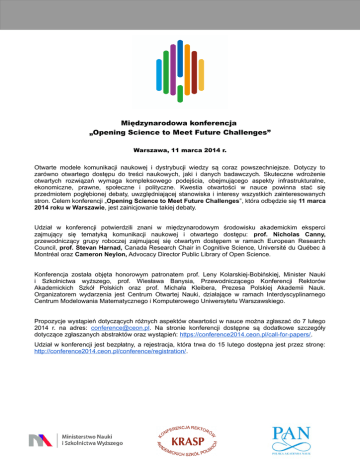 Międzynarodowa konferencja „Opening Science to Meet Future Challenges” Warszawa, 11 marca 2014 r. Otwarte modele komunikacji naukowej i dystrybucji wiedzy są coraz powszechniejsze. Dotyczy to zarówno otwartego dostępu do treści naukowych, jaki i danych badawczych. Skuteczne wdrożenie otwartych rozwiązań wymaga kompleksowego podejścia, obejmującego aspekty infrastrukturalne, ekonomiczne, prawne, społeczne i polityczne. Kwestia otwartości w nauce powinna stać się przedmiotem pogłębionej debaty, uwzględniającej stanowiska i interesy wszystkich zainteresowanych stron. Celem konferencji „Opening Science to Meet Future Challenges”, która odbędzie się 11 marca 2014 roku w Warszawie, jest zainicjowanie takiej debaty. Udział w konferencji potwierdzili znani w międzynarodowym środowisku akademickim eksperci zajmujący się tematyką komunikacji naukowej i otwartego dostępu: prof. Nicholas Canny, przewodniczący grupy roboczej zajmującej się otwartym dostępem w ramach European Research Council, prof. Stevan Harnad, Canada Research Chair in Cognitive Science, Université du Québec à Montréal oraz Cameron Neylon, Advocacy Director Public Library of Open Science. Konferencja została objęta honorowym patronatem prof. Leny Kolarskiej-Bobińskiej, Minister Nauki i Szkolnictwa wyższego, prof. Wiesława Banysia, Przewodniczącego Konferencji Rektorów Akademickich Szkół Polskich oraz prof. Michała Kleibera, Prezesa Polskiej Akademii Nauk. Organizatorem wydarzenia jest Centrum Otwartej Nauki, działające w ramach Interdyscyplinarnego Centrum Modelowania Matematycznego i Komputerowego Uniwersytetu Warszawskiego. Propozycje wystąpień dotyczących różnych aspektów otwartości w nauce można zgłaszać do 7 lutego 2014 r. na adres: [email protected]. Na stronie konferencji dostępne są dodatkowe szczegóły dotyczące zgłaszanych abstraktów oraz wystąpień: https://conference2014.ceon.pl/call-for-papers/. Udział w konferencji jest bezpłatny, a rejestracja, która trwa do 15 lutego dostępna jest przez stronę: http://conference2014.ceon.pl/conference/registration/.