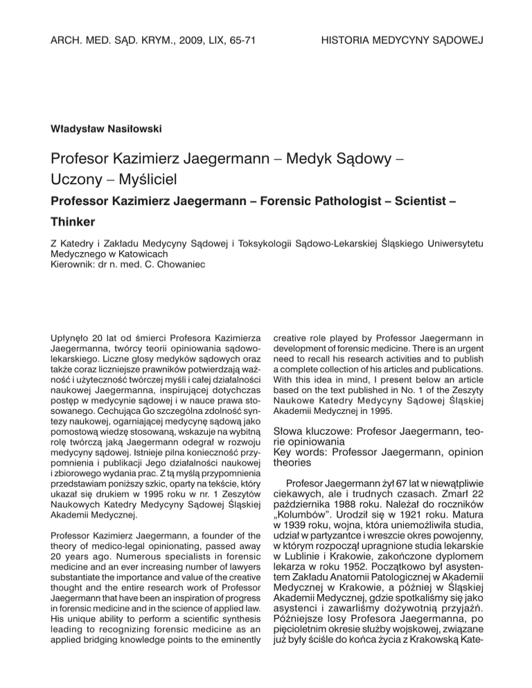ARCH. MED. SĄD. KRYM., 2009, LIX, 65-71 HISTORIA MEDYCYNY SĄDOWEJ Władysław Nasiłowski Profesor Kazimierz Jaegermann – Medyk Sądowy – Uczony – Myśliciel Professor Kazimierz Jaegermann – Forensic Pathologist – Scientist – Thinker Z Katedry i Zakładu Medycyny Sądowej i Toksykologii Sądowo-Lekarskiej śląskiego Uniwersytetu Medycznego w Katowicach Kierownik: dr n. med. C. Chowaniec Upłynęło 20 lat od śmierci Profesora Kazimierza Jaegermanna, twórcy teorii opiniowania sądowolekarskiego. Liczne głosy medyków sądowych oraz także coraz liczniejsze prawników potwierdzają ważność i użyteczność twórczej myśli i całej działalności naukowej Jaegermanna, inspirującej dotychczas postęp w medycynie sądowej i w nauce prawa stosowanego. Cechująca Go szczególna zdolność syntezy naukowej, ogarniającej medycynę sądową jako pomostową wiedzę stosowaną, wskazuje na wybitną rolę twórczą jaką Jaegermann odegrał w rozwoju medycyny sądowej. Istnieje pilna konieczność przypomnienia i publikacji Jego działalności naukowej i zbiorowego wydania prac. Z tą myślą przypomnienia przedstawiam poniższy szkic, oparty na tekście, który ukazał się drukiem w 1995 roku w nr. 1 Zeszytów Naukowych Katedry Medycyny Sądowej śląskiej Akademii Medycznej. Professor Kazimierz Jaegermann, a founder of the theory of medico-legal opinionating, passed away 20 years ago. Numerous specialists in forensic medicine and an ever increasing number of lawyers substantiate the importance and value of the creative thought and the entire research work of Professor Jaegermann that have been an inspiration of progress in forensic medicine and in the science of applied law. His unique ability to perform a scientific synthesis leading to recognizing forensic medicine as an applied bridging knowledge points to the eminently creative role played by Professor Jaegermann in development of forensic medicine. There is an urgent need to recall his research activities and to publish a complete collection of his articles and publications. With this idea in mind, I present below an article based on the text published in No. 1 of the Zeszyty Naukowe Katedry Medycyny Sądowej śląskiej Akademii Medycznej in 1995. Słowa kluczowe: Profesor Jaegermann, teorie opiniowania Key words: Professor Jaegermann, opinion theories Profesor Jaegermann żył 67 lat w niewątpliwie ciekawych, ale i trudnych czasach. Zmarł 22 października 1988 roku. Należał do roczników „Kolumbów”. Urodził się w 1921 roku. Matura w 1939 roku, wojna, która uniemożliwiła studia, udział w partyzantce i wreszcie okres powojenny, w którym rozpoczął upragnione studia lekarskie w Lublinie i Krakowie, zakończone dyplomem lekarza w roku 1952. Początkowo był asystentem Zakładu Anatomii Patologicznej w Akademii Medycznej w Krakowie, a później w śląskiej Akademii Medycznej, gdzie spotkaliśmy się jako asystenci i zawarliśmy dożywotnią przyjaźń. Późniejsze losy Profesora Jaegermanna, po pięcioletnim okresie służby wojskowej, związane już były ściśle do końca życia z Krakowską Kate- 66 Władysław Nasiłowski drą Medycyny Sądowej. Krótki okres, w którym współpracowałem z profesorem Jaegermannem pozwolił mi nie tylko się z nim zaprzyjaźnić, ale również Go podziwiać, a później, w pełni akceptować jego poglądy, propozycje oraz całościowe widzenie zarówno medycyny sądowej, jak i filozofii nauki. Już wtedy uderzająca była Jego nadzwyczajna zdolność do refleksji, racjonalnego uogólnienia i systematyzowania poglądów. Dotyczyło to najpierw organizacji pracy, a później samego jej sensu przez nadawanie jej podbudowy teoretycznej. Ta umiejętność, polegająca na zdolności do abstrahowania głębszych treści i wytłumaczenia otaczających zjawisk, będzie cechowała całe życie naukowe, a w znacznej mierze osobiste Kazimierza Jaegermanna Z tej zdolności zrodziły się Jego późniejsze koncepcje naukowe dotyczące medycyny sądowej i szerzej filozofii nauki. W roku 1962 zdobywa doktorat medycyny, w roku 1968 habilituje się, a w roku 1984 zostaje profesorem tytułowym. Działalność Profesora Jaegermanna obejmuje 135 artykułów drukowanych, autorstwo i współautorstwo 8 podręczników i monografii. Dorobek ten wybitnie rozszerza się gdyby policzyć Jego bezpośrednie oddziaływanie i działalność w sferze opiniowania sądowo-lekarskiego, w licznych kręgach dyskusyjnych, a także jako organizatora i inspiratora sympozjów, spotkań i niezliczonych dyskusji. Pierwsze kierunki zainteresowań dotyczyły patomorfologii, a zwłaszcza problematyki miażdżycy i nagłej śmierci, zwłaszcza śmierci sercowej. śmierć nagła była także tematem późniejszych Jego badań i rozważań. Już w tym wczesnym okresie działalności naukowej można było dostrzec pozakonwencjonalne ujęcia metodologiczne nawiązujące do opiniowania w medycynie sądowej. Temat ten stał się problemem numer jeden Jego dociekań naukowych w późnym, dojrzałym okresie Jego twórczości. Ciekawym, stanowiącym jakby boczną gałąź, obszarem zainteresowań Profesora Jaegermanna była serohematologia. Praca habilitacyjna „Badania nad możliwością zastosowania układu grupowego lipoproteidów (LP)” miała obok propozycji medycznych wyraźny charakter opiniodawczy, gdyż co charakterystyczne, przynosiła zakwestionowanie stosowanego przedwcześnie w badaniach sądowo-lekarskich tego układu – a więc miała charakter wniosków negatywnych, na które nie każdy uczony łatwo sobie pozwała. Można tutaj zatem dostrzec charakterystyczny rys dla postawy poszukiwawczej Profesora Jaegermanna – rzetelność, uczciwość, pewnego Nr 2 rodzaju „puryzm” metodologiczny, sprowadzający się do całkowitej wierności dla przyjętego paradygmatu pracy naukowej. Równocześnie prace tego okresu i późniejsze, cechowała konsekwencja w budowaniu modeli abstrakcyjnych, co jak wiadomo b