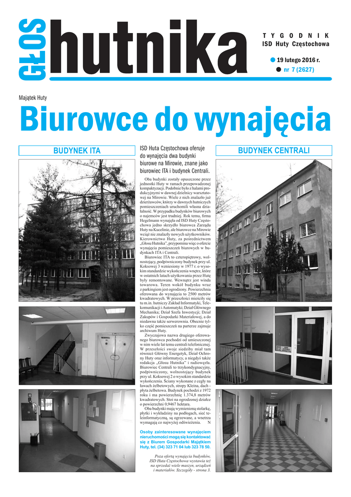 t y g o d n i k ISD Huty Częstochowa l 19 lutego 2016 r. l nr 7 (2627) Majątek Huty Biurowce do wynajęcia BUDYNEK ITA ISD Huta Częstochowa oferuje do wynajęcia dwa budynki biurowe na Mirowie, znane jako biurowiec ITA i budynek Centrali. Oba budynki zostały opuszczone przez jednostki Huty w ramach przepowadzonej kompaktyzacji. Podobnie było z halami produkcyjnymi w dawnej dzielnicy warsztatowej na Mirowie. Wiele z nich znalazło już dzierżawców, którzy w dawnych hutniczych pomieszczeniach uruchomili własna działalność. W przypadku budynków biurowych o najemców jest trudniej. Rok temu, firma Hegelmann wynajęła od ISD Huty Częstochowa jedno skrzydło biurowca Zarządu Huty na Kucelinie, ale biurowce na Mirowie wciąż nie znalazły nowych użytkowników. Kierownictwo Huty, za pośrednictwem „Głosu Hutnika”, przypomina więc o ofercie wynajęcia pomieszczeń biurowych w budynkach ITA i Centrali. Biurowiec ITA to czteropiętrowy, wolnostojący, podpiwniczony budynek przy ul. Koksowej 3 wzniesiony w 1977 r. o wysokim standardzie wykończenia wnętrz, które w ostatnich latach użytkowania przez Hutę były remontowane. Wewnątrz jest winda towarowa. Teren wokół budynku wraz z parkingiem jest ogrodzony. Powierzchnia oferowana do wynajęcia to 2500 metrów kwadratowych. W przeszłości mieściły się tu m.in. hutniczy Zakład Informatyki, Telekomunikacji i Automatyki; Dział Głównego Mechanika; Dział Szefa Inwestycji; Dział Zakupów i Gospodarki Materiałowej, a do niedawna także serwerownia. Obecnie tylko część pomieszczeń na parterze zajmuje archiwum Huty. Zwyczajowa nazwa drugiego oferowanego biurowca pochodzi od umieszczonej w nim wiele lat temu centrali telefonicznej. W przeszłości swoje siedziby miał tam również Główny Energetyk, Dział Ochrony Huty oraz informatycy, a niegdyś także redakcja „Głosu Hutnika” i radiowęzła. Biurowiec Centrali to trzykondygnacyjny, podpiwniczony, wolnostojący budynek przy ul. Koksowej 2 o wysokim standardzie wykończenia. Ściany wykonane z cegły na ławach żelbetowych, stropy Kleina, dach płyta żelbetowa. Budynek pochodzi z 1972 roku i ma powierzchnię 1.374,8 metrów kwadratowych. Stoi na ogrodzonej działce o powierzchni 0,9467 hektara. Oba budynki mają wymienioną stolarkę, płytki i wykładziny na podłogach, sieć teleinformatyczną, są ogrzewane, a wnetrza wymagają co najwyżej odświeżenia. N Osoby zainteresowane wynajęciem nieruchomości mogą się kontaktować się z Biurem Gospodarki Majątkiem Huty, tel. (34) 323 71 04 lub 323 78 50. Poza ofertą wynajęcia budynków, ISD Huta Częstochowa wystawia też na sprzedaż wiele maszyn, urządzeń i materiałów. Szczegóły - strona 3. BUDYNEK CENTRALI 2 nr 7/2016 Aktualności kulturalne l na scenie Teatru Teatr im. Adama Mickiewicza w piątek i sobotę o godz. 19 zaprasza na komedię „Ostra Jazda” Norma Fostera. Natomiast w niedzielę, 21 lutego, a także w przyszły piątek i sobotę, 26 i 27 lutego o godz. 19 będzie można zobaczyć ponownie „Mayday” Raya Cooneya. l W REPERTUARZE FILHARMONII Filharmonia Częstochowska im. Bronisława Hubermana zaprasza w przyszły piątek, 26 lutego, o godz. 19 na koncert symfoniczny, podczas którego orkiestra pod dyrekcją Adama Klocka i skrzypek Jan Mracek wykonają utwory Luwiga van Beethovena i Richarda Straussa. W przyszłą sobotę, 27 lutego, o godz. 18 na scenie filharmonii wystąpi Michał Bajor z koncertem pod tytułem „Moja miłość”, a w niedzielę, 28 lutego, o godz. 19 artyści baletu i soliści Opery Lwowskiej zaprezentują najsłynniejsze szlagiery operetkowe podczas koncertu „Vivat Operetta”. Natomiast 4 marca w Filharmonii Częstochowskiej odbędzie się Koncert Nadzwyczajny: kanadyjski pianista Charles Richard-Hamelin, laureat II nagrody Konkursu Chopinowskiego w 2015 r., wykona utwory G. Bacewicz, F. Chopina i J. Brahmsa. l kabaret w kłobucku W Miejskim Ośrodku Kultury w Kłobucku, ul. Targowa 1, w niedzielę, 21 lutego, o godz. 15 wystąpi kabaret „Paranienormalni”. l koncert piosenki włoskiej W przyszłą sobotę, 27 lutego, o godz. 18 Stowarzyszenie Polsko-Włoskie Due Terre wraz z OPK „Gaude Mater” organizują Koncert Piosenki Włoskiej - muzyczną podróż poprzez najbardziej znane we Włoszech przeboje od lat 50. do dziś w wykonaniu duetu akustycznego:Michela Duina - śpiew i klawisze, Omar Khrisat- gitara. Miejsce: Kamieniczka.eu, ul. Targowa 1. Wstęp wolny. l „CLASSIC TEA” Ośrodek Promocji Kultury „Gaude Mater”, ul. Dąbrowskiego 1, zaprasza w czwartek, 25 lutego, o godz. 18 na kolejny koncert muzyki kameralnej z cyklu „Classic tea”, praygotowany we współpracy z Akademia Muzyczną w Łodzi. l TENORZY DLA PAŃ Stajnia Biały Borek w Biskupicach k. Olsztyna zaprasza 5 marca o godz. 19 na koncert Trzech Tenorów z okazji Dnia Kobiet. Najsłynniejsze arie operowe i operetkowe wykonają: Wojciech Poprawa, Przemysław Żywczok – solista Filharmonii Narodowej i Michał Borkowski, a towarzyszyć im będzie pianista Janusz Frączek. Rezerwacja miejsc pod numerem tel. 600 096 708. Zaproszenia dostępne są także w restauracji „Biały Borek”, Al. NMP 59. l IMPREZA W „RURZE” Novika, Mr Lex, Leon, Thomas Langner i Peetee S zagrają w sobotę o godz. 21.30 w klubie Rura, Al. NMP 38 (w bramie). l akordeony na rakowie Wystawa unikatowych instrumentów z kolekcji Romana Krysta, częstochowskiego pasjonata, który zgromadził ponad 200 akordeonów, zostanie otwarta w piątek o godz. 17 w Miejskim Domu Kultury przy ul. Łukasińskiego 50/68. l kim był ferdynand karo? W piątek o godz. 17 w Ratuszu na Pl. Biegańskiego zostanie otwarta wystawa pod tytułem „Dziedzictwo kulturowe farmaceuty Ferdynanda Karo na tle inwentaryzacji świata” przygotowana przez Muzeum Częstochowskie i warszawskie Muzeum Farmacji, a dofinansowana przez Ministerstwo Kultury i Dziedzictwa Narodowego. Ferdynand Karo (1845-1927) był farmaceutą, uczestnikiem pow