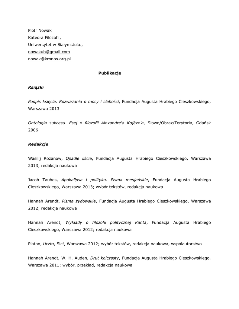 Piotr Nowak Katedra Filozofii, Uniwersytet w Białymstoku, [email protected] [email protected] Publikacje Książki Podpis księcia. Rozważania o mocy i słabości, Fundacja Augusta Hrabiego Cieszkowskiego, Warszawa 2013 Ontologia sukcesu. Esej o filozofii Alexandre'a Kojève'a, Słowo/Obraz/Terytoria, Gdańsk 2006 Redakcje Wasilij Rozanow, Opadłe liście, Fundacja Augusta Hrabiego Cieszkowskiego, Warszawa 2013; redakcja naukowa Jacob Taubes, Apokalipsa i polityka. Pisma mesjańskie, Fundacja Augusta Hrabiego Cieszkowskiego, Warszawa 2013; wybór tekstów, redakcja naukowa Hannah Arendt, Pisma żydowskie, Fundacja Augusta Hrabiego Cieszkowskiego, Warszawa 2012; redakcja naukowa Hannah Arendt, Wykłady o filozofii politycznej Kanta, Fundacja Augusta Hrabiego Cieszkowskiego, Warszawa 2012; redakcja naukowa Platon, Uczta, Sic!, Warszawa 2012; wybór tekstów, redakcja naukowa, współautorstwo Hannah Arendt, W. H. Auden, Drut kolczasty, Fundacja Augusta Hrabiego Cieszkowskiego, Warszawa 2011; wybór, przekład, redakcja naukowa Leo Strauss, Joseph Cropsey, Historia filozofii politycznej, Fronda / Fundacja Augusta Hrabiego Cieszkowskiego, Warszawa 2010; redakcja naukowa (wraz z Mikołajem Wiśniewskim) Wojna pokoleń, redaktor tomu, współautor, Prószyński i ska, Warszawa 2006 1 „Kronos. Metafizyka – Kultura – Religia”, Uniwersytet Warszawski, Fundacja Augusta Hrabiego Cieszkowskiego; zastępca redaktora naczelnego, 2007Redakcje w języku angielskim Man and His Enemies. Essays on Carl Schmitt, współredaktor (ze Svetozarem Minkovem) tomu, współautor, Uniwersytet w Białymstoku, Białystok 2008 2 Przedmowy i posłowia Wasilij Rozanow, Opadłe liście, Fundacja Augusta Hrabiego Cieszkowskiego, Warszawa 2013 – „Na początku Bóg stworzył Rozanowa…” (przedmowa) Jacob Taubes, Apokalipsa i polityka. Pisma mesjańskie, Fundacja Augusta Hrabiego Cieszkowskiego, Warszawa 2013 – przedmowa 1 W skład antologii wchodzą teksty następujących autorów: Piotr Nowak, Wstęp; Agata Bielik-Robson, Straceni inaczej. Dziwni trzydziestoletni i ich kłopoty z samookreśleniem; Dariusz Gawin, Bezkształtne pokolenie lat 90-tych; Cezary Michalski, Rewolta nieudacznika w świecie zadekretowanego happy endu (o prozie Michela Houellebecqa); Jacek Zychowicz, Śmierć młodości; Paweł Śpiewak, W pół drogi. Warszawska szkoła historyków idei; Janusz Ostrowski, Marcowa rodzina Josifa; Zygmunt Bauman, Między nami, pokoleniami... Aleksander Ochocki, Patent na Dojrzałość, czyli część i Całość; Maciej W. Grabski, Wojna pokoleń czy konflikt interesów?; Piotr Nowak, Król Lear albo wojna pokoleń; Tadeusz Sławek, Too Old to Rock’n’roll, Too Young to Die. De-generacja; Szymon Wróbel, Polityka temporalna; Piotr Graczyk, Porno-grafia, czyli zapisywanie Natury; Magdalena Grochowska, Lewa strona gobelinu. 2 W skład antologii wchodzą teksty następujących autorów: Preface – Svetozar Minkov, Piotr Nowak; The Age of Carl Schmitt – Gopal Balakrishnan; Carl Schmit and His Critics – Paul A. Rahe; Morality, or One’s Own Question as a Figure – Heinrich Meier; The Problem of Carl Schmitt’s Political Theology – Anna Schmidt; Schmitt’s Decisionism Revisited – Jenna Silber Storey; Irrational Choice and Mortal Combat as Political Destiny: The Essential Carl Schmitt – John P. McCormick; Politics and Values – Krzysztof Michalski; Political Catholicism – Piotr Graczyk; Seeking in Modern Athens an Answer to the Ancient Jerusalem Question – Zygmunt Bauman; Beyond the Political: Hans Blumenberg’s Criticism of Carl Schmitt – Oliver Müller; Hamlet or Hecuba: Schmitt or Benjamin – Daniel Doneson; The Politics of Power and Freedom in the Thought of Schmitt and Arendt – Rafał Wonicki; Natural Evil as Natural Goodness? Strauss on Schmitt – Svetozar Minkov; Incarnations of Leviathan – Piotr Nowak Hannah Arendt, Pisma żydowskie, Fundacja Augusta Hrabiego Cieszkowskiego, Warszawa 2012 – przedmowa Hannah Arendt, Wykłady o filozofii politycznej Kanta, Fundacja Augusta Hrabiego Cieszkowskiego, Warszawa 2012 – przedmowa Platon, Uczta, Sic!, Warszawa 2012 – przedmowa Hannah Arendt, W. H. Auden, Drut kolczasty, Fundacja Augusta Hrabiego Cieszkowskiego, Warszawa 2011 – przedmowa Leo Strauss, Joseph Cropsey, Historia filozofii politycznej, Fronda / Fundacja Augusta Hrabiego Cieszkowskiego, Warszawa 2010 – przedmowa Man And His Enemies. Essays On Carl Schmitt, Uniwersytet w Białymstoku, Białystok 2008 – preface (wraz ze Svetozarem Minkovem) Giorgio Agamben, Homo Sacer. Suwerenna władza i nagie życie, Prószyński i ska, Warszawa 2008 – posłowie Carl Schmitt, Lewiatan w teorii państwa Thomasa Hobbesa. Sens i niepowodzenie politycznego symbolu, Prószyński i ska, Warszawa 2008 – posłowie Hannah Arendt, Salon berliński i inne eseje, Prószyński i ska, Warszawa 2008 – wybór tekstów i przedmowa Hannah Arendt, Polityka jako obietnica, Prószyński i ska, Warszawa 2007 – posłowie Hannah Arendt, Odpowiedzialność i władza sądzenia, Prószyński i ska, Warszawa 2006 – posłowie Wojna pokoleń, Prószyński i ska, Warszawa 2006 – wstęp Hannah Arendt, O rewolucji, Czytelnik, Warszawa 2003 – Słowa i gwałt (posłowie) Hannah Arendt, Kondycja ludzka, Aletheia, Warszawa 2000 – Wolność albo życie (posłowie) Kontrybucje, rozdziały w książkach Nicość i nieobecność, [w:] Nihilizm i nowoczesność, (pod red. E. Patrygi i M. Januszkiewicza), Instytut Sztuki PAN, Warszawa 2012 Ludzie, instytucje, pojęcia (wraz z Piotrem Herbichem), [w:] Hannah Arendt, Pisma żydowskie, Fundacja Augusta Hrabiego Cieszkowskiego, Warszawa 2012 Głupi przepych wolności, [w:] Spór o Rymkiewicza, red. T. Rowiński, Fronda, Warszawa 2012 Dorośli i dzieci, [w:] Korczak, Opera Podlaska, Białystok 2012 Objaśnienia (wspólnie z Andrzejem Serafinem), Platon, Uczta, Sic!, Warszawa 2012 Niespożyta biesiada, [w:] Platon, Uczta, Sic!, Warszawa 2012 Alkibiades Wi