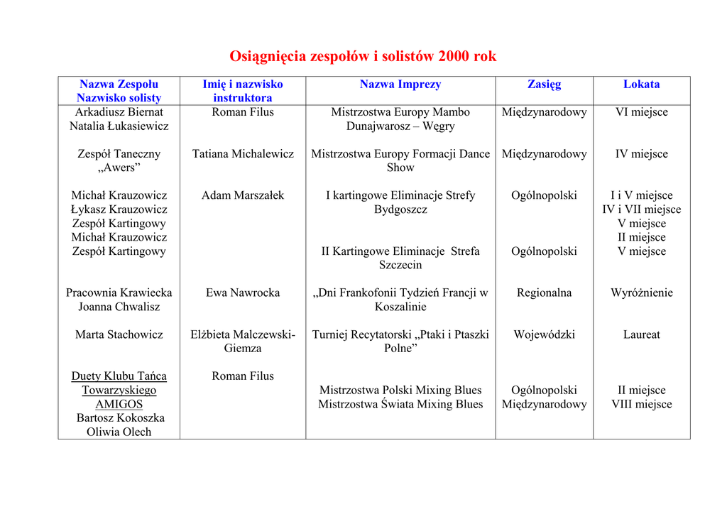 Osiągnięcia zespołów i solistów 2000 rok Nazwa Zespołu Nazwisko solisty Arkadiusz Biernat Natalia Łukasiewicz Imię i nazwisko instruktora Roman Filus Zespół Taneczny „Awers” Tatiana Michalewicz Michał Krauzowicz Łykasz Krauzowicz Zespół Kartingowy Michał Krauzowicz Zespół Kartingowy Adam Marszałek Pracownia Krawiecka Joanna Chwalisz Nazwa Imprezy Zasięg Lokata Mistrzostwa Europy Mambo Dunajwarosz – Węgry Międzynarodowy VI miejsce Mistrzostwa Europy Formacji Dance Międzynarodowy Show IV miejsce I kartingowe Eliminacje Strefy Bydgoszcz Ogólnopolski II Kartingowe Eliminacje Strefa Szczecin Ogólnopolski I i V miejsce IV i VII miejsce V miejsce II miejsce V miejsce Ewa Nawrocka „Dni Frankofonii Tydzień Francji w Koszalinie Regionalna WyróŜnienie Marta Stachowicz ElŜbieta MalczewskiGiemza Turniej Recytatorski „Ptaki i Ptaszki Polne” Wojewódzki Laureat Duety Klubu Tańca Towarzyskiego AMIGOS Bartosz Kokoszka Oliwia Olech Roman Filus Mistrzostwa Polski Mixing Blues Mistrzostwa Świata Mixing Blues Ogólnopolski Międzynarodowy II miejsce VIII miejsce Marek Zwierzchowski Kamila Tarasewicz Mistrzostwa Polski Mixing Blues Ogólnopolski III miejsce Grzegorz Kmita Nikolet Zisopulu Mistrzostwa Polski w Mambo, Mixing Blues, Hot Blues Ogólnopolski I miejsce Arkadiusz Biernat Natalia Łukszewicz Mistzrostwa Polski w Tango Argentino Ogólnopolski II miejsce Jacek Jobkie Joanna Iwańska Mistrzostwa Polski w Acromixing Blues Ogólnopolski I miejsce Grzegorz Wojciechowski Beata Duda Mistrzostwa Europy w Tango Argentino Bruge - Belgia Międzynarodowy VIII miejsce
