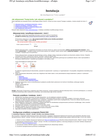 PIT.pl: Instalacja certyfikatu kwalifikowanego - ePodpis Page 1 of 7 Instalacja Jak skonfigurować Twój e-podpis? Jak aktywować Twoją kartę i jak uŜywać e-podpisu? JeŜeli odebrałeś juŜ przesyłkę (krok1) zawierającą zestaw Certum i chcesz juŜ teraz uŜywać Twojego e-podpisu, moŜesz przejść do kroku 2 i 3: aktywacja karty i weryfikacja toŜsamości - krok 2, pobranie certyfikatu i instalacja - krok 3, konfiguracja certyfikatu w programie Płatnik ZUS, jak e-podpisywać dokumenty?. Polecam takŜe obejrzenie filmu instruktaŜowego z instalacji certyfikatu kwalifikowanego Certum. Aktywacja karty i weryfikacja toŜsamości - krok 2 1. Aktywujesz swoją kartę wypełniając formularz na stronie Centrum Certyfikacji: przejdź na stronę http://certum.pl/certum/certum,pz_wybor_certyfikatu.xml W formularzu aktywacji w polu: Kto przeprowadził Ciebie przez ścieŜkę sprzedaŜy?, prosimy wybrać "Inny" i podać PIT.pl Podczas aktywacji karty i wypełniania formularza na stronie certum.pl, pojawi się komunikat „pobierz oprogramowanie Unizeto”, który naleŜy potwierdzić > następnie pojawi się formularz gotowy do wysłania, naleŜy wybrać opcję „wyślij bez podpisu”, (jeŜeli nie masz jeszcze e-podpisu i kupujesz go po raz pierwszy) . Proces aktywacji karty wymaga jej indywidualnego numeru, dlatego naleŜy rozpocząć go dopiero po otrzymaniu zestawu Certum. Wypełnij rozwaŜnie formularz z poprawnymi danymi, sprawdź i wyślij do Certum PCC. 2. System Certum generuje automatycznie dokumenty w formacie PDF. Dokumenty generują się na podstawie danych, które wprowadziłeś w formularzu elektronicznym i wysyłane są na podany w nim adres e-mail. Treść poszczególnych wiadomości mail: Po odbiorze wygenerowanych dokumentów, sprawdź ich poprawność i wydrukuj w 2 egzemplarzach. W przypadku niezgodności skontaktuj się z infolinią. 3. Mając wydrukowane dokumenty umów się w dogodnym dla Ciebie czasie w celu potwierdzenia swojej toŜsamości z jednym z wybranych podmiotów: Notariusz Punkt rejestracji Punkt potwierdzenia toŜsamości lub zamów usługi Mobilnego Punktu; 4. Podpisane dokumenty wraz ze zweryfikowanym podpisem prześlij listem poleconym do Centrum Certyfikacji, adresując kopertę: CERTUM - PCC Unizeto Technologies SA ul. Bajeczna 13 71-838 Szczecin Uwaga: Aktywujesz Twoją kartę w dogodnym dla Ciebie momencie: moŜesz świadomie dokonać aktywacji karty w terminie późniejszym, co oznacza moŜliwość przesunięcia daty wystawienia certyfikatu, czyli przesunięcia jego okresu waŜności. Pobranie certyfikatu i instalacja - krok 3 1. CERTUM PCC weryfikuje otrzymane od Ciebie dokumenty i na ich podstawie wystawia certyfikat. 2. Wysyła informację do Ciebie o wystawionym certyfikacie. Informacja trafia na adres e-mail, który podałeś w formularzu aktywacji. 3. Wkładasz do stacji CD płytę dostarczoną wraz z zestawem i instalujesz czytnik karty kryptograficznej. Proces ten odbywa się przy pomocy automatycznego instalatora (nie dotyczy zestawów bez czytnika). 4. Mając podłączony czytnik karty, instalujesz z dostarczonej płyty CD standardowe oprogramowanie proCertum CardManager, które umoŜliwi Ci m.in. zapisanie certyfikatu na karcie kryptograficznej. 5. Wchodzisz pod wskazany w korespondencji z e-mail adres WWW. 6. Następnie logujesz się do systemu przy uŜyciu numeru karty oraz numeru PESEL. 7. Po zalogowaniu się pobierasz certyfikat na dysk twardy komputera. 8. Wgrywasz certyfikat na kartę cryptoCertum. Konfiguracja certyfikatu w programie Płatnik ZUS I. Instalacja Programu „Płatnik” wersja 7.02.001 oraz Zestawu Certum Aby korzystać z moŜliwości elektronicznej wymiany dokumentów z Zakładem Ubezpieczeń Społecznych konieczne jest posiadanie aktualnej wersji oprogramowania „Płatnik” (wersja 7.02.001) oraz kupno Zestawu CERTUM do składania bezpiecznego podpisu elektronicznego. W tym celu naleŜy: 1. Pobrać ze strony Zakładu Ubezpieczeń Społecznych http://e-inspektorat.zus.pl aktualną wersję oprogramowania „Płatnik” (wersja 7.02.001). 2. Zainstalować oprogramowanie „Płatnik” (wersja 7.02.001) na komputerze zgodnie z instrukcją dostępną na stronach Zakładu Ubezpieczeń Społecznych http://e-inspektorat.zus.pl 3. Zainstalować Zestaw CERTUM zgodnie z instrukcją dołączoną do zakupionego zestawu. 4. Uruchomić oprogramowanie proCertum CardManager http://www.e-podpis.pit.pl/instalacja/index.php 2008-07-12 PIT.pl: Instalacja certyfikatu kwalifikowanego - ePodpis Page 2 of 7 5. Przejść do zakładki „Profil bezpieczny” 6. Wybrać certyfikat i nacisnąć przycisk „Rejestruj certyfikat” 7. Uruchomić oprogramowanie „Płatnik”. II. Rejestracja certyfikatu kwalifikowanego w programie „Płatnik” (wersja 7.02.001) Aby zarejestrować certyfikat kwalifikowany w programie „Płatnik” (wersja 7.02.001) naleŜy: 1. Wybrać w górnym menu programu opcję: Przekaz / Rejestruj certyfikat kwalifikowany 2. Wybrać z listy certyfikat, za pomocą którego będziemy popisywać dokumenty przesyłane do ZUS. 3. Zatwierdzić wybór certyfikatu przyciskiem „Rejestruj”. 4. Po naciśnięciu przycisku „Rejestruj” pojawia się komunikat o pomyślnym zarejestrowaniu certyfikatu kwalifikowanego. http://www.e-podpis.pit.pl/instalacja/index.php 2008-07-12 PIT.pl: Instalacja certyfikatu kwalifikowanego - ePodpis Page 3 of 7 3. Ustawienie przekazu elektronicznego Dla prawidłowego ustawienia przekazu elektronicznego w programie „Płatnik” (wersja 7.02.001) naleŜy: 1. Wybrać w górnym menu programu opcję: Przekaz / Ustawienia przekazu elektronicznego 2. Wybrać zakładkę „Ustawienia ogólne” 3. W zakładce „Ustawienia ogólne” prosimy: 3.1.1. zaznaczyć pole „Wysyłka automatyczna”, 3.1.2. wybrać z rozwijanej listy „Adres do przekazywania zestawów dokumentów”, 3.1.3. wybrać z rozwijanej listy „Adres do pobierania danych z CRU”, 3.1.4. zaznaczyć pole „UŜywaj Elektroniczn