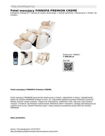 http://lord4sport.pl Fotel masujący FINNSPA PREMION CREME kategoria: Kategorie > Sprzęt do użytku domowego > Sprzęt sportowy i rekreacyjny > Fotele do masażu Producent: FINNLO 7 999,00 zł Kod QR: Fotel masujący FINNSPA Premion CREME. Fotel masujący PREMION gwarantuje ekskluzywny masaż i odprężenie w domu. Wyjątkowość fotela do masażu PREMION polega na tym, że: naprawdę spełnia wszystkie Państwa życzenia! Należy wybrać rodzaj masażu, miejsce do masowania, szerokość rolki, siłę oraz czas trwania masażu i możecie się Państwo rozkoszować dokładnie takim masażem, jakiego potrzebujecie po ciężkim dniu pracy. Nawet Państwa szyja i stopy zostaną zauważone przez fotel do masażu PREMION. Opis produktu: strona: 1/4 wydrukowano: 03-03-2017 http://lord4sport.pl/fotel-masujacy-finnlo-premion-creme.html PREMION jest dumą serii foteli do masażu firmy FinnSpa. Gwarantuje Państwu ekskluzywny masaż i zapewnia uczucie odprężenia. Wyjątkowość fotela do masażu PREMION polega na tym, że: naprawdę spełnia wszystkie Państwa życzenia! Rodzaj masażu, miejsce do masowania, szerokość rolki, siłę, tempo i czas trwania masażu i możecie się Państwo indywidualnie ustawić, a następnie rozkoszować się dokładnie takim masażem, jakiego potrzebujecie po ciężkim dniu pracy. Proszę uruchomić jeden z 5 automatycznych programów i poczuć rozluźnienie w napiętych mięśniach. Dzięki skanowaniu pleców przed właściwym programem masażu, fotel do masażu PREMION zawsze znajdzie szczególnie dla Państwa ważne punkty masażu i rolki automatycznie ustanowi we właściwej pozycji. Proszę rozsiąść się w wygodnym profesjonalnym fotelu masującym i rozkoszować się indywidualnym masażem całego ciała w jakości 3D. Oczywiście, mogą zostać ustawione różne rodzaje masażu, takie jak pukanie, shiatsu, ugniatanie, masaż rolkami oraz uciskanie, którymi można sterować pojedynczo i manualnie oraz częściowo łączyć. Również szerokość masażu pleców można dostosować indywidualnie do wysokości i szerokości pleców.· Szczególną atrakcją fotela masującego PREMION jest masaż Full-Air oraz funkcja Zero-Gravity. Cały fotel do masażu jest wyposażony w poduszki powietrzne, które na życzenie wypełniają się powietrzem. Możecie się Państwo dzięki temu cieszyć tym niesamowicie przyjemnym relaksem połączonym ze wspaniałym masażem całego ciała. Siedzisko posiada opcję wibracji i wyłączaną funkcją grzania. Ciepło dodatkowo rozluźnia mięśnie, jak również pobudza układ krążenia, co stanowi wspaniałe uzupełnienie chwil relaksu. W razie potrzeby, można też masować kark, stopy, jak również obszar lędźwiowy oraz pośladki. Bardzo niewiele foteli masujących oferuje oddzielny masaż karku. Proszę korzystać z niego regularnie i cieszyć się rozluźnieniem szyi. Masaż stóp i okolicy lędźwiowej dodaje energii, która tak bardzo jest na co dzień potrzebna. Kąt podnóżka można regulować w zakresie od 0-90 stopni za pomocą jednego przycisku. Wszystkie funkcje fotela masującego PREMION mogą zostać wybrane bezpośrednio na pilocie. Również ustawienie siedziska może być dostosowane w ten sposób. Wygodne oparcie regulowane jest pomiędzy 117 -157 stopni, co daje nieskończenie wiele relaksujących pozycji zarówno siedzących jak i leżących. Gdy pilot nie jest używany, może być praktycznie przechowywany w kieszeni bocznej. Zegar sterujący monitoruje każdą ustawioną długość masażu. Proszę wybrać czas z zakresu od 5 do 30 minut i pozwolić sobie odpłynąć. Fotel do masażu PREMION posiada zabezpieczenie przed przegrzaniem oraz wyłącznik bezpieczeństwa, można więc na co dzień zapomnieć o codzienności i oddać się bez obaw pełnemu wieczornemu relaksowi. Najwyższa jakoś i przetestowane bezpieczeństwo jest najwyższym priorytetem dla FinnSpa. Do produkcji naszego fotela masującego zostały użyte tylko wysokiej jakości materiały. Szczegółowa kontrola jakości, której jest poddawany każdy fotel masujący, zapewniają maksymalną trwałość i bezpieczeństwo potwierdzone certyfikatem TÜV. strona: 2/4 wydrukowano: 03-03-2017 http://lord4sport.pl/fotel-masujacy-finnlo-premion-creme.html Rodzaje masażu (można łączyć): Ugniatanie: Rytmicznie silne ugniatanie. Szczególnie polecane przy napiętych mięśniach Ugniatanie i stukanie: idealne połączenie ugniatania i stukania Pukanie: Przyjemne stukanie pięścią w celu rozluźnienia mięśni Shiatsu: Przyjemne uciskanie Stukanie: imitacja przerywanego, okresowego stukania wewnętrzną stroną dłoni Rolki: imitacja gładzenie pleców przez profesjonalnego masażystę Dane techniczne: Kolor: kremowy Wymiary w pozycji siedzącej: 135 x 78 x 112 cm Wymiary w pozycji leżącej: 185 x 78 x 92 cm Maksymalna waga użytkownika: 120 kg Waga fotela: 77 kg Zasilanie: 230 V, 50 Hz, 180 Watt Materiał: eko-skóra Fotel jest rozkładany Sterowanie poprzez pilot Rodzaje masażu: Ugniatanie Ugniatanie i stukanie Tapping Shiatsu Pukanie Rolki Programy: 5 automatycznych, pełne masaże ciała 6 różnych funkcji masażu: ugniatanie, ugniatanie I stukanie, gwintowanie, shiatsu, prasowanie, pukanie I wałki. Masaże mogą być łączone, każdy dostępny osobno Do wyboru: masaż karku, pleców, stóp, lędźwiowy Fotel posiada funkcje grzania Regulacja siły masażu w 3 różnych poziomach. Pozostałe informacje: Gwarancja 36 miesięcy strona: 3/4 wydrukowano: 03-03-2017 http://lord4sport.pl/fotel-masujacy-finnlo-premion-creme.html Paragon lub faktura vat Numer katalogowy: 60040 strona: 4/4 wydrukowano: 03-03-2017 http://lord4sport.pl/fotel-masujacy-finnlo-premion-creme.html