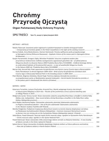 Chrońmy Przyrodę Ojczystą Organ Państwowej Rady Ochrony Przyrody SPIS TREŚCI Tom 71, zeszyt 4, lipiec/sierpień 2015 ARTYKUŁY � ARTICLES ARTYKUŁY – ARTICLES Aleksandra Biedrzycka: Wpływ zaniku i fragmentacji siedliska na strukturę genetyczną populacji susła Natalia Tokarczyk: Zarastanie polan reglowych w polskich Karpatach w świetle istniejących badań perełkowanego Spermophilus suslicus – wykorzystanie danych genetycznych do planowania ochrony gatunku – Overgrowing of montane glades in the Polish Carpathians in the light of the exis�ng research ................... – The effect of habitat fragmenta�on and loss on gene�c structure of spo�ed suslik popula�ons – the use of Dariusz Kubiak, Anna Biedunkiewicz, Damian Koźniewski: Porosty epifityczne parku przypałacowego gene�cal data in species conserva�on .............................................................................................................. w Opinogórze Górnej (Północne Mazowsze) – Epiphy�c lichens of the manor park in Opinogóra Górna (N Mazovia) ....................................................................................................................................................... Magdalena Lenda, Piotr Skórka: Orzech włoski Juglans regia – nowy, potencjalnie inwazyjny gatunek w rodzimej Kacper Pyrzanowski, Grzegorz Zięba, Przybylski: Sztuczne urządzenia jako florze – Walnut Juglans regia – aMirosław new, poten�ally invasive species in na�vewodne flora ........................................... przyrodniczo niedoceniane siedliska występowania zagrożonych gatunków ryb – przykład piskorza fossilis na obszarze Natura 2000 pomurnika Pradolina Bzury-Neru Ar�ficial drainage ditches PiotrMisgurnus Profus, Mateusz Matysiak: Obserwacje TichodromaPLH100006 muraria w–Polsce poza tatrzańską ostoją as undervalued habitats of threatened fish species – a case of weatherfish Misgurnus lęgową – Records of Wallcreeper Tichodroma muraria in Poland outside the breedingfossilis site in the Tatra Mts in the Natura 2000 site ‘Pradolina Bzury-Neru PLH100006’ ............................................................................. Marian Stój, Konrad Ptaki szponiaste Accipitriformes bocian czarny Ciconia nigra w Bieszczadzkim Jerzy Kruk, RenataStój: Szymańska: Rukiew drobnolistna oraz Nastur�um microphyllum (Boenn.) Rchb. – nowe Parku Narodowym w okresie lęgowym – Birds ofyellow prey Accipitriformes andmicrophyllum black stork (Boenn.) w okolicach Krakowa – New2009–2014 stands of one-row cress Nastur�um stanowiska Rchb. innigra the surroundings KrakówPark ................................................................................................................ Ciconia in Bieszczady of Na�onal in the breeding season in 2009–2014 ............................................. Piotr Bilański, Zbigniew Kołodziej, Marek Pająk: Pachnica dębowa Osmoderma eremita s.l. Adam Michał Główka: Występowanie różanki Rhodeus sericeus (Pallas, 1776) i piskorza w Olszewski, przypałacowym parku w Niedźwiedziu (powiat krakowski) – Hermit beetle Osmoderma eremitaMisgurnus s.l. fossilis (Linné,park 1758) w Puszczy Kampinoskiej The occurrence of the bi�erling Rhodeus sericeus (Pallas, in the palace in Niedźwiedź (the district of–Krakow) ................................................................................. 1776) and weatherfish Misgurnus fossilis (Linné, 1758) in the Kampinos Forest (Central Poland) ................... NOTATKI – NOTESMech pędzliczek szerokolistny Syntrichia la�folia (Hartm.) Huebener w Karpatach Polskich Adam Stebel: i problemy jego ochrony – The Water Screw-moss Syntrichia la�folia in the Polish Carpathians and problems Katarzyna Turzańska, Justyna Chachulska, Krzysztof Kus: Wyniki wstępnego liczenia sów leśnych of its protec�on ................................................................................................................................................. na Wysoczyźnie Elbląskiej w 2014 roku – Results of the preliminary census of forest-dwelling owls on Elbląg Plateau in 2014 .................................................................................................................................. Marcin Nobis, Agnieszka Nobis: Stanowisko sasanki otwartej Pulsa�lla patens (L.) Mill. (Ranunculaceae) Małgorzata Łaciak, Tomasz Łaciak: Nowe stanowisko zadychry w dolinie Raby in w Starachowicach (Przedgórze Iłżeckie) – A locality ofpospolitej Pulsa�llaBranchipus patens (L.)schaefferi Mill. (Ranunculaceae) (Gdów, woj. małopolskie) – New record of fairy shrimp Branchipus schaefferi in the Raba River valley ............................................................................................................................. Starachowice (Iłża Foreland) (Gdów, Małopolska province) ............................................................................................................................ Anna Bartłomiej Stanowisko salamandry plamistej Salamandra–salamandra AdamNajbar, P. Kubiak: Flora Najbar: naczyniowa doliny Olszówki (Kotlina Sandomierska) walory i zagadnienia ochrony – na Pogórzu Zachodniosudeckim – Site(Kotlina of the fire salamanderSE Salamandra salamandra Vascular flora of the Olszówka valley Sandomierska, Poland) – it’s values and conserva�on issues in the Western Sudetes Foothills (SW Poland) ................................................................................................... Monika Podejźrzon księżycowy Botrychium lunaria na terenie dawnej eksploatacji żelaza Marcin Podgórska: Stanisław Wilga: Rycerzyk oliwkowożółty Tricholomopsis decora (Fr.: Fr.) Singer w rud Lasach Oliwskich (Trójmiejski Park Krajobrazowy) –(Wyżyna Tricholomopsis decora (Fr.: Fr.) Singer in Lasy Oliwskie Forests na Płaskowyżu Suchedniowskim Małopolska) – Common moonwort Botrychi