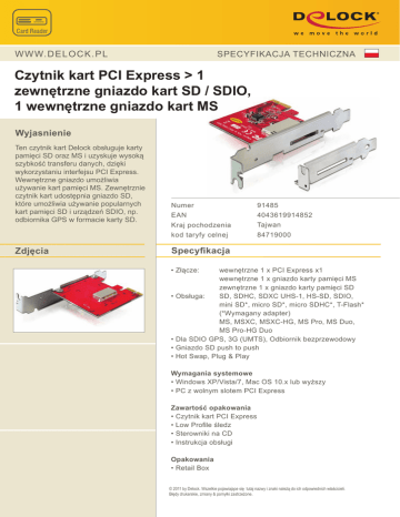 SPECYFIKACJA TECHNICZNA W WW. DE LO CK . P L Czytnik kart PCI Express > 1 zewnętrzne gniazdo kart SD / SDIO, 1 wewnętrzne gniazdo kart MS Wyjasnienie Ten czytnik kart Delock obsługuje karty pamięci SD oraz MS i uzyskuje wysoką szybkość transferu danych, dzięki wykorzystaniu interfejsu PCI Express. Wewnętrzne gniazdo umożliwia używanie kart pamięci MS. Zewnętrznie czytnik kart udostępnia gniazdo SD, które umożliwia używanie popularnych kart pamięci SD i urządzeń SDIO, np. odbiornika GPS w formacie karty SD. Zdjęcia Numer 91485 EAN 4043619914852 Kraj pochodzenia Tajwan kod taryfy celnej 84719000 Specyfikacja • Złącze: wewnętrzne 1 x PCI Express x1 wewnętrzne 1 x gniazdo karty pamięci MS zewnętrzne 1 x gniazdo karty pamięci SD SD, SDHC, SDXC UHS-1, HS-SD, SDIO, • Obsługa: mini SD*, micro SD*, micro SDHC*, T-Flash* (*Wymagany adapter) MS, MSXC, MSXC-HG, MS Pro, MS Duo, MS Pro-HG Duo • Dla SDIO GPS, 3G (UMTS), Odbiornik bezprzewodowy • Gniazdo SD push to push • Hot Swap, Plug & Play Wymagania systemowe • Windows XP/Vista/7, Mac OS 10.x lub wyższy • PC z wolnym slotem PCI Express Zawartość opakowania • Czytnik kart PCI Express • Low Profile śledz • Sterowniki na CD • Instrukcja obsługi Opakowania • Retail Box © 2011 by Delock. Wszelkie pojawiające się tutaj nazwy i znaki należą do ich odpowiednich właścicieli. Błędy drukarskie, zmiany & pomyłki zastrzeżone.