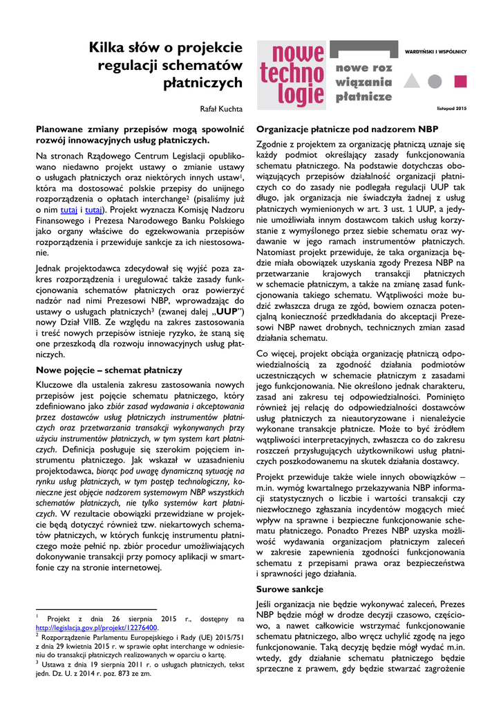 Kilka słów o projekcie regulacji schematów płatniczych Rafał Kuchta Planowane zmiany przepisów mogą spowolnić rozwój innowacyjnych usług płatniczych. Na stronach Rządowego Centrum Legislacji opublikowano niedawno projekt ustawy o zmianie ustawy o usługach płatniczych oraz niektórych innych ustaw1, która ma dostosować polskie przepisy do unijnego rozporządzenia o opłatach interchange2 (pisaliśmy już o nim tutaj i tutaj). Projekt wyznacza Komisję Nadzoru Finansowego i Prezesa Narodowego Banku Polskiego jako organy właściwe do egzekwowania przepisów rozporządzenia i przewiduje sankcje za ich niestosowanie. Jednak projektodawca zdecydował się wyjść poza zakres rozporządzenia i uregulować także zasady funkcjonowania schematów płatniczych oraz powierzyć nadzór nad nimi Prezesowi NBP, wprowadzając do ustawy o usługach płatniczych3 (zwanej dalej „UUP”) nowy Dział VIIB. Ze względu na zakres zastosowania i treść nowych przepisów istnieje ryzyko, że staną się one przeszkodą dla rozwoju innowacyjnych usług płatniczych. Nowe pojęcie – schemat płatniczy Kluczowe dla ustalenia zakresu zastosowania nowych przepisów jest pojęcie schematu płatniczego, który zdefiniowano jako zbiór zasad wydawania i akceptowania przez dostawców usług płatniczych instrumentów płatniczych oraz przetwarzania transakcji wykonywanych przy użyciu instrumentów płatniczych, w tym system kart płatniczych. Definicja posługuje się szerokim pojęciem instrumentu płatniczego. Jak wskazał w uzasadnieniu projektodawca, biorąc pod uwagę dynamiczną sytuację na rynku usług płatniczych, w tym postęp technologiczny, konieczne jest objęcie nadzorem systemowym NBP wszystkich schematów płatniczych, nie tylko systemów kart płatniczych. W rezultacie obowiązki przewidziane w projekcie będą dotyczyć również tzw. niekartowych schematów płatniczych, w których funkcję instrumentu płatniczego może pełnić np. zbiór procedur umożliwiających dokonywanie transakcji przy pomocy aplikacji w smartfonie czy na stronie internetowej. Organizacje płatnicze pod nadzorem NBP Zgodnie z projektem za organizację płatniczą uznaje się każdy podmiot określający zasady funkcjonowania schematu płatniczego. Na podstawie dotychczas obowiązujących przepisów działalność organizacji płatniczych co do zasady nie podlegała regulacji UUP tak długo, jak organizacja nie świadczyła żadnej z usług płatniczych wymienionych w art. 3 ust. 1 UUP, a jedynie umożliwiała innym dostawcom takich usług korzystanie z wymyślonego przez siebie schematu oraz wydawanie w jego ramach instrumentów płatniczych. Natomiast projekt przewiduje, że taka organizacja będzie miała obowiązek uzyskania zgody Prezesa NBP na przetwarzanie krajowych transakcji płatniczych w schemacie płatniczym, a także na zmianę zasad funkcjonowania takiego schematu. Wątpliwości może budzić zwłaszcza druga ze zgód, bowiem oznacza potencjalną konieczność przedkładania do akceptacji Prezesowi NBP nawet drobnych, technicznych zmian zasad działania schematu. Co więcej, projekt obciąża organizację płatniczą odpowiedzialnością za zgodność działania podmiotów uczestniczących w schemacie płatniczym z zasadami jego funkcjonowania. Nie określono jednak charakteru, zasad ani zakresu tej odpowiedzialności. Pominięto również jej relację do odpowiedzialności dostawców usług płatniczych za nieautoryzowane i nienależycie wykonane transakcje płatnicze. Może to być źródłem wątpliwości interpretacyjnych, zwłaszcza co do zakresu roszczeń przysługujących użytkownikowi usług płatniczych poszkodowanemu na skutek działania dostawcy. Projekt przewiduje także wiele innych obowiązków – m.in. wymóg kwartalnego przekazywania NBP informacji statystycznych o liczbie i wartości transakcji czy niezwłocznego zgłaszania incydentów mogących mieć wpływ na sprawne i bezpieczne funkcjonowanie schematu płatniczego. Ponadto Prezes NBP uzyska możliwość wydawania organizacjom płatniczym zaleceń w zakresie zapewnienia zgodności funkcjonowania schematu z przepisami prawa oraz bezpieczeństwa i sprawności jego działania. Surowe sankcje 1 Projekt z dnia 26 sierpnia 2015 r., dostępny na http://legislacja.gov.pl/projekt/12276400. 2 Rozporządzenie Parlamentu Europejskiego i Rady (UE) 2015/751 z dnia 29 kwietnia 2015 r. w sprawie opłat interchange w odniesieniu do transakcji płatniczych realizowanych w oparciu o kartę. 3 Ustawa z dnia 19 sierpnia 2011 r. o usługach płatniczych, tekst jedn. Dz. U. z 2014 r. poz. 873 ze zm. Jeśli organizacja nie będzie wykonywać zaleceń, Prezes NBP będzie mógł w drodze decyzji czasowo, częściowo, a nawet całkowicie wstrzymać funkcjonowanie schematu płatniczego, albo wręcz uchylić zgodę na jego funkcjonowanie. Taką decyzję będzie mógł wydać m.in. wtedy, gdy działanie schematu płatniczego będzie sprzeczne z prawem, gdy będzie stwarzać zagrożenie dla użytkowników, stabilności systemu płatniczego, bezpieczeństwa lub sprawności funkcjonowania systemów płatności, a także w przypadku zmiany zasad funkcjonowania schematu bez uzyskania zgody Prezesa NBP. W praktyce oznaczać to będzie wstrzymanie realizacji transakcji w schemacie pociągające za sobą być może bezpowrotną utratę zaufania jego użytkowników. Trudno wobec tego zrozumieć, dlaczego przepisy projektu nie wskazują w sposób jednoznaczny przysługujących od decyzji środków odwoławczych. Warto też wspomnieć, że prowadzenie schematu płatniczego bez wymaganej zgody Prezesa NBP będzie zagrożone karą grzywny do 5 000 000 złotych. Podsumowanie Podejmując próbę oceny projektowanych zmian, należy zgodzić się ze stanowiskiem wyrażonym w uzasadnieniu projektu, że dynamiczny rozwój technologiczny tych innowacyjnych instrumentów płatniczych, również z uwagi na rosnącą rolę i znaczenie sfery e-handlu, zwiększa potrzeb