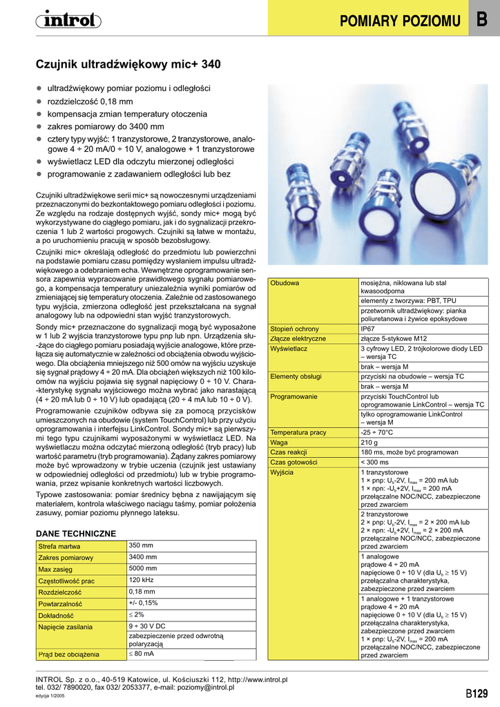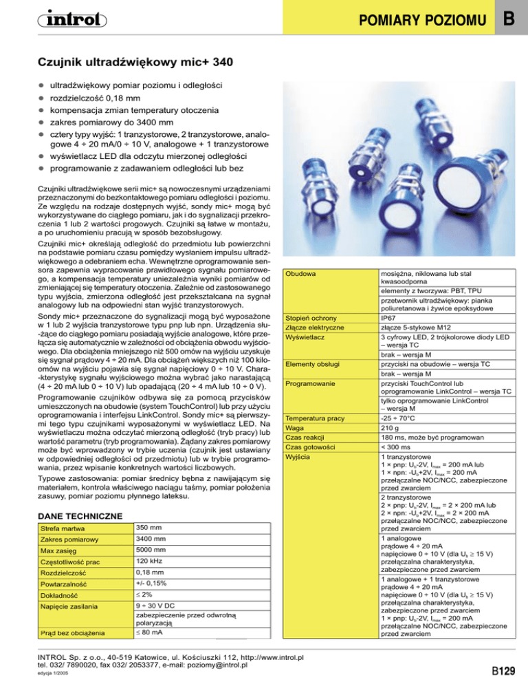 POMIARY POZIOMU B Czujnik ultradźwiękowy mic+ 340 ● ● ● ● ● ● ● ultradźwiękowy pomiar poziomu i odległości rozdzielczość 0,18 mm kompensacja zmian temperatury otoczenia zakres pomiarowy do 3400 mm cztery typy wyjść: 1 tranzystorowe, 2 tranzystorowe, analogowe 4 ÷ 20 mA/0 ÷ 10 V, analogowe + 1 tranzystorowe wyświetlacz LED dla odczytu mierzonej odległości programowanie z zadawaniem odległości lub bez Czujniki ultradźwiękowe serii mic+ są nowoczesnymi urządzeniami przeznaczonymi do bezkontaktowego pomiaru odległości i poziomu. Ze względu na rodzaje dostępnych wyjść, sondy mic+ mogą być wykorzystywane do ciągłego pomiaru, jak i do sygnalizacji przekroczenia 1 lub 2 wartości progowych. Czujniki są łatwe w montażu, a po uruchomieniu pracują w sposób bezobsługowy. Czujniki mic+ określają odległość do przedmiotu lub powierzchni na podstawie pomiaru czasu pomiędzy wysłaniem impulsu ultradźwiękowego a odebraniem echa. Wewnętrzne oprogramowanie sensora zapewnia wypracowanie prawidłowego sygnału pomiarowego, a kompensacja temperatury uniezależnia wyniki pomiarów od zmieniającej się temperatury otoczenia. Zależnie od zastosowanego typu wyjścia, zmierzona odległość jest przekształcana na sygnał analogowy lub na odpowiedni stan wyjść tranzystorowych. Sondy mic+ przeznaczone do sygnalizacji mogą być wyposażone w 1 lub 2 wyjścia tranzystorowe typu pnp lub npn. Urządzenia słu-żące do ciągłego pomiaru posiadają wyjście analogowe, które przełącza się automatycznie w zależności od obciążenia obwodu wyjściowego. Dla obciążenia mniejszego niż 500 omów na wyjściu uzyskuje się sygnał prądowy 4 ÷ 20 mA. Dla obciążeń większych niż 100 kiloomów na wyjściu pojawia się sygnał napięciowy 0 ÷ 10 V. Chara-kterystykę sygnału wyjściowego można wybrać jako narastającą (4 ÷ 20 mA lub 0 ÷ 10 V) lub opadającą (20 ÷ 4 mA lub 10 ÷ 0 V). Programowanie czujników odbywa się za pomocą przycisków umieszczonych na obudowie (system TouchControl) lub przy użyciu oprogramowania i interfejsu LinkControl. Sondy mic+ są pierwszymi tego typu czujnikami wyposażonymi w wyświetlacz LED. Na wyświetlaczu można odczytać mierzoną odległość (tryb pracy) lub wartość parametru (tryb programowania). Żądany zakres pomiarowy może być wprowadzony w trybie uczenia (czujnik jest ustawiany w odpowiedniej odległości od przedmiotu) lub w trybie programowania, przez wpisanie konkretnych wartości liczbowych. Obudowa Stopień ochrony Złącze elektryczne Wyświetlacz Elementy obsługi Programowanie Temperatura pracy Waga Czas reakcji Czas gotowości Wyjścia Typowe zastosowania: pomiar średnicy bębna z nawijającym się materiałem, kontrola właściwego naciągu taśmy, pomiar położenia zasuwy, pomiar poziomu płynnego lateksu. DANE TECHNICZNE Strefa martwa 350 mm Zakres pomiarowy 3400 mm Max zasięg 5000 mm Częstotliwość prac 120 kHz Rozdzielczość 0,18 mm Powtarzalność +/- 0,15% Dokładność ≤ 2% Napięcie zasilania 9 ÷ 30 V DC zabezpieczenie przed odwrotną polaryzacją ≤ 80 mA Prąd ą bez obciążenia INTROL Sp. z o.o., 40-519 Katowice, ul. Ko ściusz ki k 112, htttp://www.introl.pl tel. 032/ 7890020, fax 032/ 2053377, e-mail: [email protected] edycja 1/2005 mosiężna, niklowana lub stal kwasoodporna elementy z tworzywa: PBT, TPU przetwornik ultradźwiękowy: pianka poliuretanowa i żywice epoksydowe IP67 złącze 5-stykowe M12 3 cyfrowy LED, 2 trójkolorowe diody LED – wersja TC brak – wersja M przyciski na obudowie – wersja TC brak – wersja M przyciski TouchControl lub oprogramowanie LinkControl – wersja TC tylko oprogramowanie LinkControl – wersja M -25 ÷ 70°C 210 g 180 ms, może być programowan < 300 ms 1 tranzystorowe 1 × pnp: Ub-2V, Imax = 200 mA lub 1 × npn: -Ub+2V, Imax = 200 mA przełączalne NOC/NCC, zabezpieczone przed zwarciem 2 tranzystorowe 2 × pnp: Ub-2V, Imax = 2 × 200 mA lub 2 × npn: -Ub+2V, Imax = 2 × 200 mA przełączalne NOC/NCC, zabezpieczone przed zwarciem 1 analogowe prądowe 4 ÷ 20 mA napięciowe 0 ÷ 10 V (dla Ub ≥ 15 V) przełączalna charakterystyka, zabezpieczone przed zwarciem 1 analogowe + 1 tranzystorowe prądowe 4 ÷ 20 mA napięciowe 0 ÷ 10 V (dla Ub ≥ 15 V) przełączalna charakterystyka, zabezpieczone przed zwarciem 1 × pnp: Ub-2V, Imax = 200 mA przełączalne NOC/NCC, zabezpieczone przed zwarciem B POMIARY POZIOMU WYMIARY SCHEMATY POŁĄCZEŃ 1 wyjście analogowe + 1 wyjście tranzystorowe pnp 1 wyjście tranzystorowe 2 wyjścia tranzystorowe 1 wyjście analogowe PRZYKŁADY ZASTOSOWAŃ Czujnik mic+ wykorzystany do kontroli naciągu taśmy Pomiar poziomu z wykorzystaniem czujnika mic+ Czujnik mic+ mierzący średnicę bębna z nawijającym się na niego materiałem B130 INTROL Sp. z o.o., 40-519 Katowice, ul. Ko ściusz ki 112, http://www.introl.pl tel. 032/ 7890020, fax 032/ 2053377, e-mail: [email protected] edycja 1/2005