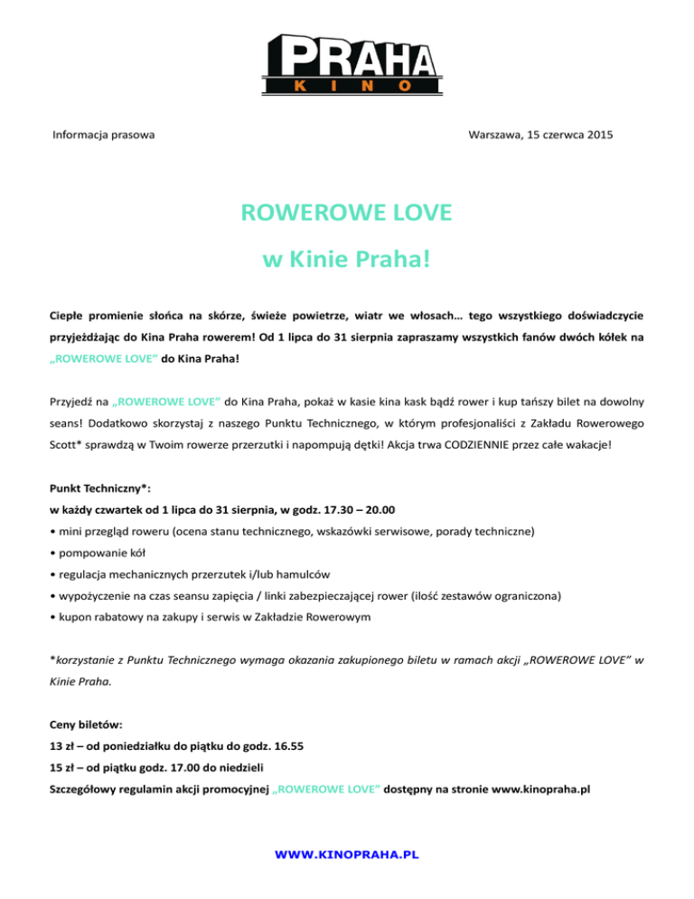 Informacja prasowa Warszawa, 15 czerwca 2015 ROWEROWE LOVE w Kinie Praha! Ciepłe promienie słońca na skórze, świeże powietrze, wiatr we włosach… tego wszystkiego doświadczycie przyjeżdżając do Kina Praha rowerem! Od 1 lipca do 31 sierpnia zapraszamy wszystkich fanów dwóch kółek na „ROWEROWE LOVE” do Kina Praha! Przyjedź na „ROWEROWE LOVE” do Kina Praha, pokaż w kasie kina kask bądź rower i kup tańszy bilet na dowolny seans! Dodatkowo skorzystaj z naszego Punktu Technicznego, w którym profesjonaliści z Zakładu Rowerowego Scott* sprawdzą w Twoim rowerze przerzutki i napompują dętki! Akcja trwa CODZIENNIE przez całe wakacje! Punkt Techniczny*: w każdy czwartek od 1 lipca do 31 sierpnia, w godz. 17.30 – 20.00 • mini przegląd roweru (ocena stanu technicznego, wskazówki serwisowe, porady techniczne) • pompowanie kół • regulacja mechanicznych przerzutek i/lub hamulców • wypożyczenie na czas seansu zapięcia / linki zabezpieczającej rower (ilość zestawów ograniczona) • kupon rabatowy na zakupy i serwis w Zakładzie Rowerowym *korzystanie z Punktu Technicznego wymaga okazania zakupionego biletu w ramach akcji „ROWEROWE LOVE” w Kinie Praha. Ceny biletów: 13 zł – od poniedziałku do piątku do godz. 16.55 15 zł – od piątku godz. 17.00 do niedzieli Szczegółowy regulamin akcji promocyjnej „ROWEROWE LOVE” dostępny na stronie www.kinopraha.pl WWW.KINOPRAHA.PL Zakład Rowerowy Scott* - sklep i serwis rowerowy zlokalizowany na warszawskiej Starej Pradze przy ul. Okrzei 7. W ofercie znajdują się rowery firmy SCOTT oraz markowe akcesoria przydatne każdemu rowerzyście. Prowadzą serwis rowerowy, w którym wykonują przeglądy techniczne oraz naprawy sprzętu w szerokim zakresie. Rowery są ich pasją, a celem satysfakcja Klientów. Zapraszamy na „ROWEROWE LOVE” w Kinie Praha! INFORMCJA: Kasa Kina Praha ul. Jagiellońska 26 03-719 Warszawa tel. 22 343 03 10 KONTAKT DLA MEDIÓW: Katarzyna Polubiec-Mrowińska email: [email protected] tel. 728 875 350 WWW.KINOPRAHA.PL