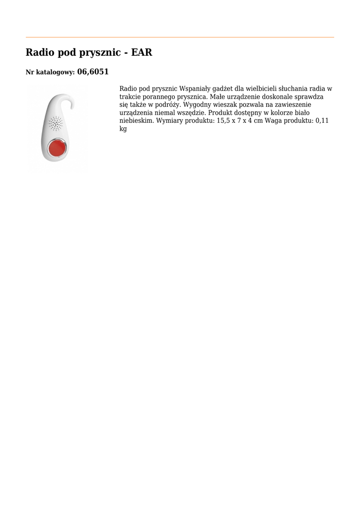 Radio pod prysznic - EAR Nr katalogowy: 06,6051 Radio pod prysznic Wspaniały gadżet dla wielbicieli słuchania radia w trakcie porannego prysznica. Małe urządzenie doskonale sprawdza się także w podróży. Wygodny wieszak pozwala na zawieszenie urządzenia niemal wszędzie. Produkt dostępny w kolorze biało niebieskim. Wymiary produktu: 15,5 x 7 x 4 cm Waga produktu: 0,11 kg