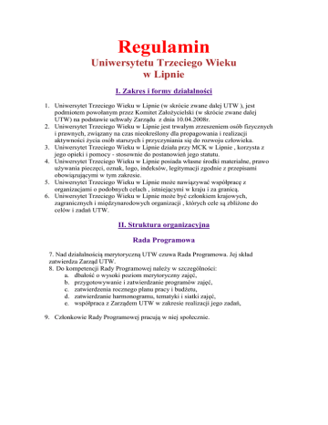 Regulamin Uniwersytetu Trzeciego Wieku w Lipnie I. Zakres i formy działalności 1. Uniwersytet Trzeciego Wieku w Lipnie (w skrócie zwane dalej UTW ), jest podmiotem powołanym przez Komitet Założycielski (w skrócie zwane dalej UTW) na podstawie uchwały Zarządu z dnia 10.04.2008r. 2. Uniwersytet Trzeciego Wieku w Lipnie jest trwałym zrzeszeniem osób fizycznych i prawnych, związany na czas nieokreślony dla propagowania i realizacji aktywności życia osób starszych i przyczyniania się do rozwoju człowieka. 3. Uniwersytet Trzeciego Wieku w Lipnie działa przy MCK w Lipnie , korzysta z jego opieki i pomocy - stosownie do postanowień jego statutu. 4. Uniwersytet Trzeciego Wieku w Lipnie posiada własne środki materialne, prawo używania pieczęci, oznak, logo, indeksów, legitymacji zgodnie z przepisami obowiązującymi w tym zakresie. 5. Uniwersytet Trzeciego Wieku w Lipnie może nawiązywać współpracę z organizacjami o podobnych celach , istniejącymi w kraju i za granicą. 6. Uniwersytet Trzeciego Wieku w Lipnie może być członkiem krajowych, zagranicznych i międzynarodowych organizacji , których cele są zbliżone do celów i zadań UTW. II. Struktura organizacyjna Rada Programowa 7. Nad działalnością merytoryczną UTW czuwa Rada Programowa. Jej skład zatwierdza Zarząd UTW. 8. Do kompetencji Rady Programowej należy w szczególności: a. dbałość o wysoki poziom merytoryczny zajęć, b. przygotowywanie i zatwierdzanie programów zajęć, c. zatwierdzenia rocznego planu pracy i budżetu, d. zatwierdzanie harmonogramu, tematyki i siatki zajęć, e. współpraca z Zarządem UTW w zakresie realizacji jego zadań, 9. Członkowie Rady Programowej pracują w niej społecznie. Samorząd Słuchaczy Samorząd Słuchaczy stanowią wszyscy Słuchacze UTW. 1. Z każdej grupy (koła, kursy, lektoraty) działającej w UTW wybierany jest przez słuchaczy starosta grupy. 2. Starostowie wszystkich grup tworzą Radę Słuchaczy i wybierają ze swojego grona: Starostę roku, Wicestarostę roku, Skarbnika, Protokolanta. 3. Rada Słuchaczy pełni funkcje doradcze wobec Zarządu. 4. Kadencja Rady Słuchaczy trwa jeden rok. 5. Do zakresu działania Rady Słuchaczy należy: realizowanie wniosków Słuchaczy, udział w ustalaniu planów działalności UTW, w celu przedłożenia ich Zebraniu Słuchaczy, zwoływanie Zebrań Samorządu Słuchaczy, rozpatrywanie i rozstrzyganie spraw członków dotyczących nieprzestrzegania Statutu, regulaminów oraz sporów powstałych na tle działalności UTW, współdecydowanie w sprawach powoływania i rozwiązywania zespołów, kół zainteresowań, klubów, organizowanie działalności turystycznej, kulturalnej, sportowej itp. 1. Posiedzenia Rady Słuchaczy zwoływane są przez Zarząd zgodnie z rocznym terminarzem oraz doraźnie na wniosek Zarządu lub Samorządu Słuchaczy. 2. Członkowie wchodzący w skład Rady Słuchaczy są zobowiązani do: czynnego uczestnictwa we wszystkich posiedzeniach i pracach Samorządu Słuchaczy, współtworzenia atmosfery życzliwości i zgodnego współdziałania, wnoszenie propozycji do Zarządu i Rady Programowej dotyczących programu działalności Uniwersytetu w danym semestrze, w szczególnych przypadkach zachowania w tajemnicy spraw poruszanych na posiedzeniu Samorządu Słuchaczy, jeśli mogłyby naruszyć dobro osobiste Słuchaczy lub osób współpracujących z Uniwersytetem. 3. Zebrania Samorządu Słuchaczy są protokołowane. Protokół podpisuje Protokolant i Przewodniczący. Członkowie Rady Słuchaczy mają obowiązek zapoznania się z protokołem. III. Członkowie, ich prawa i obowiązki. 10. Słuchacze Uniwersytetu Trzeciego Wieku mają prawo: brania udziału we wszystkich rodzajach zajęć zgodnie z przyjętymi zasadami odpłatności ● inicjowania nowych form działań programowych i twórczych ● zgłaszania swoich uwag i wniosków do koordynatorów UTW za pośrednictwem Społecznej Rady Słuchaczy korzystanie z wszelkich form działalności UTW i korzystania z dorobku UTW, ● 11. Słuchacze Uniwersytetu Trzeciego Wieku maja obowiązki: a. brania udziału w działalności UTW i realizacji jego celów, b. postępowania zgodnego z niniejszym regulaminem, c. regularnego opłacania opłat , d. dbałość o mienie i dobre imię UTW, e. uczestnictwo we wszystkich wykładach 12. Opłata wpisowego na rok 2008/2009 wynosi 20 zł ( wpłata w miesiącu październiku ). Opłata czesnego – 30 zł - upoważnia do udziału w seminariach i wykładach. 13. W roku akademickim 2008/2009 opłata za udział w jednym wybranym zespole twórczym i samokształceniowym wynosi 5 zł miesięcznie ( do 10 każdego miesiąca ) .Opłata za udział w każdej dodatkowej formie zajęć wynosi 2,50 zł, płatność jak wyżej. 14. Słuchacz uczestniczy w wybranych przez siebie wykładach, sekcjach zainteresowań oraz zajęciach dodatkowych. 15. Warunkiem uczęszczania w zajęciach jest posiadanie indeksu lub legitymacji słuchacza UTW. 16. Warunkiem rozpoczęcia zajęć sekcji zainteresowań oraz oferty dodatkowej UTW jest powstanie grupy osób, której liczebność wynosi minimum 5 osób. 17. Słuchacz otrzymuje wpisy do indeksu po zakończeniu każdych zajęć. 18. Warunkiem zaliczenia roku jest uczestnictwo na minimum 75% wykładów i sekcji zainteresowań 19. Rezygnacja z członkostwa może nastąpić po przyjęciu pisemnej rezygnacji i uregulowaniu zobowiązań wobec UTW. 20. Skreślenie z listy słuchaczy przez Zarząd Uniwersytetu na wniosek Samorządu Słuchaczy może nastąpić z powodu: a. notorycznego łamania postanowień regulaminu, b. długotrwałej nieusprawiedliwionej absencji trwającej co najmniej sześć miesięcy, c. zalegania z opłatą składek co najmniej przez okres trzech miesięcy, IV. Środki materialne i majątek. 21. Majątek powstaje z : a. wpłat składek członkowskich, wpisowego, b. opłat za zajęcia warsztatowe (fakultatywne) 22. Umowy, zobowiązania oraz wszelkie oświadczenia woli rodz