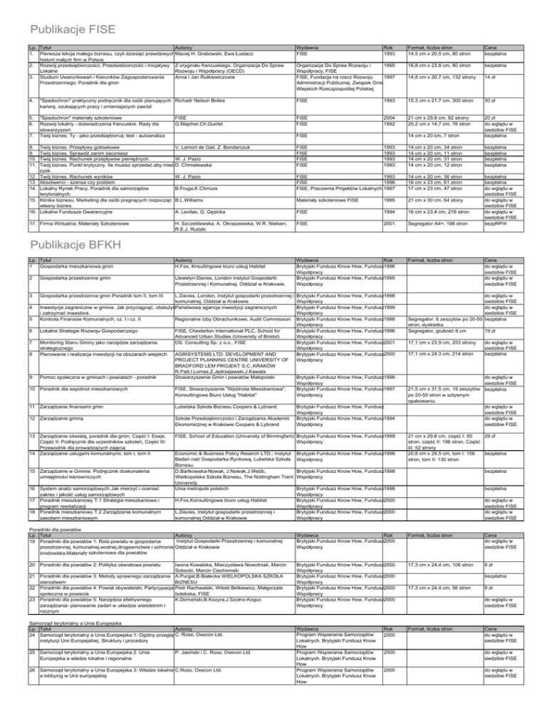 Publikacje FISE Lp. Tytuł Autorzy 1. Pierwsza lekcja małego biznesu, czyli dziesięć prawdziwych Maciej H. Grabowski, Ewa Łustacz historii małych firm w Polsce 2. Rozwój przedsiębiorczości; Przedsiebiorczość i Inicjatywy Z oryginału francuskiego, Organizacja Do Spraw Lokalne Rozwoju i Współpracy (OECD) 3. Studium Uwarunkowań i Kierunków Zagospodarowania Anna i Jan Rutkiewiczowie Przestrzennego; Poradnik dla gmin Wydawca FISE Rok 1993 Format, liczba stron 14,5 cm x 20,5 cm, 80 stron Cena bezpłatna Organizacja Do Spraw Rozwoju i 1995 Współpracy, FISE FISE, Fundacja na rzecz Rozwoju 1997 Administracji Publicznej, Związek Gmin Wiejskich Rzeczpospolitej Polskiej 16,8 cm x 23,8 cm, 80 stron bezpłatna 14,8 cm x 20,7 cm, 132 strony 14 zł 4. "Spadochron" praktyczny podręcznik dla osób planujących Richadr Nelson Bolles karierę, szukających pracy i zmieniajacych zawód FISE 1993 15,3 cm x 21,7 cm, 300 stron 30 zł 5. 6. "Spadochron" materiały szkoleniowe Rozwój lokalny - doświadczenia francuskie. Rady dla stowarzyszeń. Twój biznes: Ty - jako przedsiębiorca; test - autoanaliza FISE FISE 2004 1992 21 cm x 29,8 cm, 92 strony 20,2 cm x 14,7 cm, 76 stron 14 cm x 20 cm, 7 stron 20 zł do wglądu w siedzibie FISE bezpłatna 1993 1993 1993 1993 14 cm x 20 cm, 34 stron 14 cm x 20 cm, 11 stron 14 cm x 20 cm, 31 stron 14 cm x 20 cm, 12 stron bezpłatna bezpłatna bezpłatna bezpłatna FISE 1993 FISE 1996 FISE, Pracownia Projektów Lokalnych 1997 14 cm x 20 cm, 36 stron 16 cm x 23 cm, 61 stron 17 cm x 23 cm, 47 stron Materiały szkoleniowe FISE 1995 21 cm x 30 cm, 64 stony FISE 1994 16 cm x 23,4 cm, 216 stron H. Szczeblewska; A. Okraszewska, W.R. Nielsen, R.E.J. Rudzki FISE 2001 Segregator A4+; 188 stron bezpłatna bezpłatna do wglądu w siedzibie FISE do wglądu w siedzibie FISE do wglądu w siedzibie FISE bezpłatna Lp. Tytuł 1 Gospodarka mieszkaniowa gmin Autorzy H.Fox, Knsultingowe biuro usług Habitat Format, liczba stron 2 Gospodarka przestrzenna gmin Llewelyn-Davies, London Instytut Gospodarki Przestrzennej i Komunalnej. Oddział w Krakowie. Wydawca Rok Brytyjski Fundusz Know How, Fundusz1996 Współpracy Brytyjski Fundusz Know How, Fundusz1995 Współpracy 3 Gospodarka przestrzenna gmin Poradnik tom II, tom III Brytyjski Fundusz Know How, Fundusz1998 Współpracy Brytyjski Fundusz Know How, Fundusz1999 Współpracy Brytyjski Fundusz Know How, Fundusz1998 Współpracy Brytyjski Fundusz Know How, Fundusz1996 Współpracy Brytyjski Fundusz Know How, Fundusz2001 Współpracy Brytyjski Fundusz Know How, Fundusz2000 Współpracy do wglądu w siedzibie FISE do wglądu w siedzibie FISE Segregator: 6 zeszytów po 20-50 bezpłatna stron; dyskietka Segregator, grubość 6 cm 19 zł 7. 8. 9. 10. 11. 12. 13. 14. 15. 16. FISE G.Majcher,Ch.Guirlet FISE Twój biznes. Przepływy gotówkowe. V. Lamort de Gail, Z. Bondarczuk Twój biznes. Sprawdź zanim zaczniesz Twój biznes. Rachunek przepływów pieniężnych. W. J. Pazio Twój biznes. Punkt krytyczny. Ile musisz sprzedać aby mieć D. Chmielewska zysk. Twój biznes. Rachunek wyników W. J. Pazio Absolwenci - szansa czy problem. Lokalny Rynek Pracy. Poradnik dla samorządów B.Fruga,K.Chmura terytorialnych. Klinika biznesu. Marketing dla osób pragnących rozpocząć B.L.Williams własny biznes Lokalne Fundusze Gwarancyjne A. Levitas, G. Gęsicka 17. Firma Wirtualna; Materiały Szkoleniowe FISE FISE FISE FISE Publikacje BFKH 5 L.Davies, London, Instytut gospodarki przestrzennej i komunalnej. Oddział w Krakowie Inwestycje zagraniczne w gminie. Jak przyciągnąć, obsłużyćPaństwowa agancja inwestycji zagranicznych i zatrzymać inwestora. Kontrola Finansów Komunalnych, cz. I i cz. II Regionalne Izby Obrachunkowe, Audit Commission 6 Lokalne Strategie Rozwoju Gospodarczego 7 8 Monitoring Stanu Gminy jako narzędzie zarządzania strategicznego Planowanie i realizacja inwestycji na obszarach wiejskch 9 Pomoc społeczna w gminach i powiatach - poradnik 4 FISE, Chesterton International PLC, School for Advanced Urban Studies (University of Bristol) DS. Consulting Sp. z o.o., FISE AGRISYSTEMS LTD. DEVELOPMENT AND PROJECT PLANNING CENTRE UNIVERSITY OF BRADFORD LEM PROJEKT S.C.,KRAKÓW R.Patt,I.Lomas,Z.Jędrzejewski,J.Kawala Stowarzyszenie Gmin i powiatów Małopolski Brytyjski Fundusz Know How, Fundusz1998 Współpracy Brytyjski Fundusz Know How, Fundusz1997 Współpracy 10 Poradnik dla wspólnot mieszkaniowych FISE, Stowarzyszenie "Wpólnota Mieszkaniowa", Konsultingowe Biuro Usług "Habitat" 11 Zarządzanie finansami gmin Lubelska Szkoła Biznesu Coopers & Lybrand 12 Zarządzanie gminą Szkoła Przedsiębiorczości i Zarządzania Akademiii Ekonomicznej w Krakowie Coopers & Lybrand 13 Zarządzanie oświatą, poradnik dla gmin; Część I: Eseje, Część II: Podręcznik dla uczestników szkoleń, Część III: Przewodnik dla prowadzących zajęcia 14 Zarządzanie usługami komunalnymi, tom I, tom II FISE, School of Education (University of Birmingfam) Brytyjski Fundusz Know How, Fundusz1999 Współpracy 15 Zarządzanie w Gminie. Podręcznik doskonalenia umiejętności kierowniczych 16 System analiz samorządowych.Jak mierzyć i oceniać zakres i jakość usług samorządowych 17 Poradnik mieszkaniowy T.1 Strategia mieszkaniowa i program rewitalizacji 18 Poradnik mieszkaniowy T.2 Zarządzanie komunalnym zasobem mieszkaniowym Economic & Business Policy Reserch LTD.; Instytut Badań nad Gospodarka Rynkową, Lubelska Szkoła Biznesu D.Bartkowska-Nowak, J.Nowak,J.Webb, Wielkopolska Szkoła Biznesu, The Nottingham Trent University Unia metropolii polskich H.Fox,Konsultingowe biuro usług Habitat L.Davies, Instytut gospodarki przestrzennej i komunalnej Oddział w Krakowie Poradniki dla powiatów Lp. Tytuł Autorzy Instytut Gospodarki Przestrzennej i komunalnej 19 Poradniki dla powiatów 1: Rola powiatu w gospodarce przestrzennej, komunalnej,wodnej,drogownictwie i ochronie Oddział w Krakowie szkoleniowe dla powiatów środowiska.Materiały 20 Por