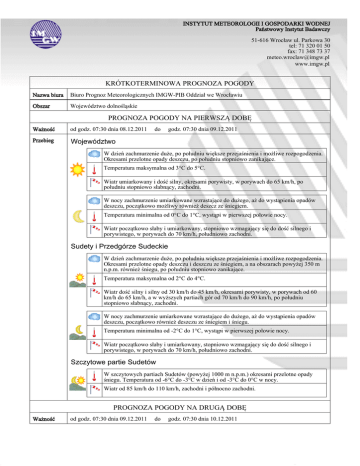 INSTYTUT METEOROLOGII I GOSPODARKI WODNEJ Państwowy Instytut Badawczy 51-616 Wrocław ul. Parkowa 30 tel: 71 320 01 50 fax: 71 348 73 37 [email protected] www.imgw.pl KRÓTKOTERMINOWA PROGNOZA POGODY Nazwa biura Biuro Prognoz Meteorologicznych IMGW-PIB Oddział we Wrocławiu Obszar Województwo dolnośląskie PROGNOZA POGODY NA PIERWSZĄ DOBĘ Ważność od godz. 07:30 dnia 08.12.2011 Przebieg Województwo do godz. 07:30 dnia 09.12.2011 W dzień zachmurzenie duże, po południu większe przejaśnienia i możliwe rozpogodzenia. Okresami przelotne opady deszczu, po południu stopniowo zanikające. Temperatura maksymalna od 3°C do 5°C. Wiatr umiarkowany i dość silny, okresami porywisty, w porywach do 65 km/h, po południu stopniowo słabnący, zachodni. W nocy zachmurzenie umiarkowane wzrastające do dużego, aż do wystąpienia opadów deszczu, początkowo możliwy również deszcz ze śniegiem. Temperatura minimalna od 0°C do 1°C, wystąpi w pierwszej połowie nocy. Wiatr początkowo słaby i umiarkowany, stopniowo wzmagający się do dość silnego i porywistego, w porywach do 70 km/h, południowo zachodni. Sudety i Przedgórze Sudeckie W dzień zachmurzenie duże, po południu większe przejaśnienia i możliwe rozpogodzenia. Okresami przelotne opady deszczu i deszczu ze śniegiem, a na obszarach powyżej 350 m n.p.m. również śniegu, po południu stopniowo zanikające. Temperatura maksymalna od 2°C do 4°C. Wiatr dość silny i silny od 30 km/h do 45 km/h, okresami porywisty, w porywach od 60 km/h do 65 km/h, a w wyższych partiach gór od 70 km/h do 90 km/h, po południu stopniowo słabnący, zachodni. W nocy zachmurzenie umiarkowane wzrastające do dużego, aż do wystąpienia opadów deszczu, początkowo również deszczu ze śniegiem i śniegu. Temperatura minimalna od -2°C do 1°C, wystąpi w pierwszej połowie nocy. Wiatr początkowo słaby i umiarkowany, stopniowo wzmagający się do dość silnego i porywistego, w porywach do 70 km/h, południowo zachodni. Szczytowe partie Sudetów W szczytowych partiach Sudetów (powyżej 1000 m n.p.m.) okresami przelotne opady śniegu. Temperatura od -6°C do -3°C w dzień i od -3°C do 0°C w nocy. Wiatr od 85 km/h do 110 km/h, zachodni i północno zachodni. PROGNOZA POGODY NA DRUGĄ DOBĘ Ważność od godz. 07:30 dnia 09.12.2011 do godz. 07:30 dnia 10.12.2011 Przebieg Województwo W dzień zachmurzenie duże z większymi przejaśnieniami, przelotne opady deszczu. Temperatura maksymalna od 5°C do 7°C. Wiatr umiarkowany i dość silny, okresami porywisty, w porywach do 65 km/h, po południu słabnący, południowo zachodni. W nocy zachmurzenie duże z większymi przejaśnieniami, w drugiej połowie nocy miejscami rozpogodzenia. Początkowo przelotne opady deszczu. Temperatura minimalna od -1°C do 0°C. Wiatr słaby i umiarkowany, południowo zachodni i zachodni. Sudety i Przedgórze Sudeckie W dzień zachmurzenie duże, po południu większe przejaśnienia i możliwe rozpogodzenia. Okresami przelotne opady deszczu i deszczu ze śniegiem, a na obszarach powyżej 350 m n.p.m. również śniegu, po południu stopniowo zanikające. Temperatura maksymalna od 2°C do 4°C. Wiatr dość silny i silny od 30 km/h do 45 km/h, okresami porywisty, w porywach od 60 km/h do 65 km/h, a w wyższych partiach gór od 70 km/h do 90 km/h, po południu stopniowo słabnący, zachodni. W nocy zachmurzenie umiarkowane wzrastające do dużego, aż do wystąpienia opadów deszczu, początkowo również deszczu ze śniegiem i śniegu. Temperatura minimalna od -2°C do 1°C, wystąpi w pierwszej połowie nocy. Wiatr początkowo słaby i umiarkowany, stopniowo wzmagający się do dość silnego i porywistego, w porywach do 70 km/h, południowo zachodni. Szczytowe partie Sudetów W szczytowych partiach Sudetów (powyżej 1000 m n.p.m.) okresami przelotne opady śniegu. Temperatura od -6°C do -3°C w dzień i od -3°C do 0°C w nocy. Wiatr od 85 km/h do 110 km/h, zachodni i północno zachodni. Dyżurny synoptyk Marek Kurowski Godz. i data wydania godz. 06:25 dnia 08.12.2011 Opracowanie niniejsze jako przedmiot prawa autorskiego podlega ochronie prawnej, zgodnie z przepisami ustawy z dnia 4 lutego 1994r o prawie autorskim i prawach pokrewnych (dz. U. z 2006 r. Nr 90, poz. 631 z późn. zm.). Wszelkie dalsze udostępnianie, rozpowszechnianie (przedruk, kopiowanie, wiadomość sms) jest dozwolone wyłącznie w formie dosłownej z bezwzględnym wskazaniem źródła informacji tj. IMGW-PIB. Reklamacje dotyczące produktu można składać w terminie do 3 dni od daty wydania na adres [email protected].