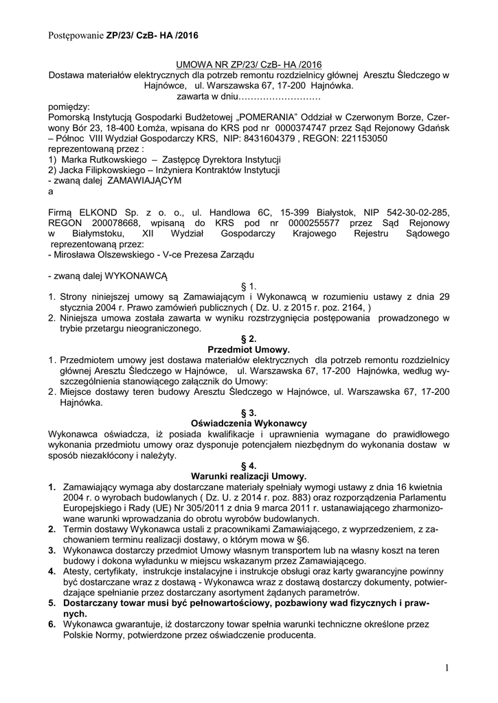 Postępowanie ZP/23/ CzB- HA /2016 UMOWA NR ZP/23/ CzB- HA /2016 Dostawa materiałów elektrycznych dla potrzeb remontu rozdzielnicy głównej Aresztu Śledczego w Hajnówce, ul. Warszawska 67, 17-200 Hajnówka. zawarta w dniu……………………… pomiędzy: Pomorską Instytucją Gospodarki Budżetowej „POMERANIA” Oddział w Czerwonym Borze, Czerwony Bór 23, 18-400 Łomża, wpisana do KRS pod nr 0000374747 przez Sąd Rejonowy Gdańsk – Północ VIII Wydział Gospodarczy KRS, NIP: 8431604379 , REGON: 221153050 reprezentowaną przez : 1) Marka Rutkowskiego – Zastępcę Dyrektora Instytucji 2) Jacka Filipkowskiego – Inżyniera Kontraktów Instytucji - zwaną dalej ZAMAWIAJĄCYM a Firmą ELKOND Sp. z o. o., ul. Handlowa 6C, 15-399 Białystok, NIP 542-30-02-285, REGON 200078668, wpisaną do KRS pod nr 0000255577 przez Sąd Rejonowy w Białymstoku, XII Wydział Gospodarczy Krajowego Rejestru Sądowego reprezentowaną przez: - Mirosława Olszewskiego - V-ce Prezesa Zarządu - zwaną dalej WYKONAWCĄ § 1. 1. Strony niniejszej umowy są Zamawiającym i Wykonawcą w rozumieniu ustawy z dnia 29 stycznia 2004 r. Prawo zamówień publicznych ( Dz. U. z 2015 r. poz. 2164, ) 2. Niniejsza umowa została zawarta w wyniku rozstrzygnięcia postępowania prowadzonego w trybie przetargu nieograniczonego. § 2. Przedmiot Umowy. 1. Przedmiotem umowy jest dostawa materiałów elektrycznych dla potrzeb remontu rozdzielnicy głównej Aresztu Śledczego w Hajnówce, ul. Warszawska 67, 17-200 Hajnówka, według wyszczególnienia stanowiącego załącznik do Umowy: 2. Miejsce dostawy teren budowy Aresztu Śledczego w Hajnówce, ul. Warszawska 67, 17-200 Hajnówka. § 3. Oświadczenia Wykonawcy Wykonawca oświadcza, iż posiada kwalifikacje i uprawnienia wymagane do prawidłowego wykonania przedmiotu umowy oraz dysponuje potencjałem niezbędnym do wykonania dostaw w sposób niezakłócony i należyty. § 4. Warunki realizacji Umowy. 1. Zamawiający wymaga aby dostarczane materiały spełniały wymogi ustawy z dnia 16 kwietnia 2004 r. o wyrobach budowlanych ( Dz. U. z 2014 r. poz. 883) oraz rozporządzenia Parlamentu Europejskiego i Rady (UE) Nr 305/2011 z dnia 9 marca 2011 r. ustanawiającego zharmonizowane warunki wprowadzania do obrotu wyrobów budowlanych. 2. Termin dostawy Wykonawca ustali z pracownikami Zamawiającego, z wyprzedzeniem, z zachowaniem terminu realizacji dostawy, o którym mowa w §6. 3. Wykonawca dostarczy przedmiot Umowy własnym transportem lub na własny koszt na teren budowy i dokona wyładunku w miejscu wskazanym przez Zamawiającego. 4. Atesty, certyfikaty, instrukcje instalacyjne i instrukcje obsługi oraz karty gwarancyjne powinny być dostarczane wraz z dostawą - Wykonawca wraz z dostawą dostarczy dokumenty, potwierdzające spełnianie przez dostarczany asortyment żądanych parametrów. 5. Dostarczany towar musi być pełnowartościowy, pozbawiony wad fizycznych i prawnych. 6. Wykonawca gwarantuje, iż dostarczony towar spełnia warunki techniczne określone przez Polskie Normy, potwierdzone przez oświadczenie producenta. 1 Postępowanie ZP/23/ CzB- HA /2016 7. Zamawiający zastrzega sobie prawo do rezygnacji z części przedmiotu umowy bez żadnych kosztów po jego stronie. § 5. Wynagrodzenie 1. Wynagrodzenie Wykonawcy za wykonanie przedmiotu Umowy wynosi: 30 750,02 zł z podatkiem VAT ( słownie: trzydzieści tysięcy siedemset pięćdziesiąt złotych 2/100) przy 23% stawce VAT . 2. Wynagrodzenie Wykonawcy obejmuje wszystkie koszty związane z wykonaniem przedmiotu Umowy. 3. Rozliczenie za wykonanie przedmiotu Umowy następować będzie na podstawie faktury VAT wystawionych przez Wykonawcę, po zrealizowaniu przedmiotu Umowy. 4. Termin płatności wynosi 30 dni od daty dostarczenia przez Wykonawcę do siedziby Zamawiającego prawidłowo wystawionej faktury VAT. 5. Na fakturze Wykonawca zobowiązany jest zamieścić nr niniejszej umowy. 6. Zamawiający nie przyjmie faktury, jeżeli zostaną zgłoszone jakiekolwiek zastrzeżenia do przedmiotu umowy. §6 Termin wykonania Wykonawca dostarczy przedmiot Umowy w terminie do 14 dni od daty zawarcia Umowy. §7 Rękojmia i gwarancja 1. Okres gwarancji na dostarczone materiały nie może być krótsza niż gwarancja producenta od daty odbioru materiałów , a w przypadku, gdy dostawa będzie realizowana częściami liczonej od daty odbioru ostatniej jej części. 2. Termin obowiązywania rękojmi za wady przedmiotu dostawy jest równa terminowi gwarancji. 3. Zamawiający jest uprawniony do wystąpienia z roszczeniami z tytułu gwarancji i rękojmi za wady w terminach ich obowiązywania. 4. Strony ustalają, że uprawnienie Zamawiającego, o którym mowa w ust. 3, rozciągają się po upływie terminów odpowiedzialności Wykonawcy, pod warunkiem, że wada zostanie zgłoszona w terminie obowiązywania gwarancji i rękojmi za wady. 5. Zamawiający zawiadomi Wykonawcę pisemnie o dostrzeżonych wadach niezwłocznie po ich wykryciu, zgodnie z przepisami prawa ze szczególnym uwzględnieniem przepisów Kodeksu cywilnego. 6. Wykonawca wykonuje zobowiązania wynikające z udzielonej gwarancji w ustalonym, i zaakceptowanym przez strony możliwie krótkim terminie nie dłuższym jednak niż 7 dni od daty zgłoszenia wady. § 8. Kary umowne i odszkodowania. 1. Zamawiającemu przysługuje naliczanie kar umownych: 1) za każdy dzień opóźnienia terminu dostawy w wysokości 0,5 % należnego wynagrodzenia ( brutto), o którym mowa w § 5 ust. 1, 2) za opóźnienia w usunięciu wad jakościowych i ilościowych, w wysokości 0,5% należnego wynagrodzenia ( brutto), o którym mowa w § 5 ust. 1 za każdy dzień opóźnienia, 3) za odstąpienie od umowy z przyczyn niezawinionych przez Zamawiającego, w wysokości 10% wynagrodzenia ( brutto), o którym mowa w § 5 ust. 1. 2. Zamawiający nalicza kary, o których mowa w ust. 1 pkt 1) bez konieczności wezwania do usunięcia uchybień Wykonawcy. 3. Zamawiający nalicza kary, o których mowa 