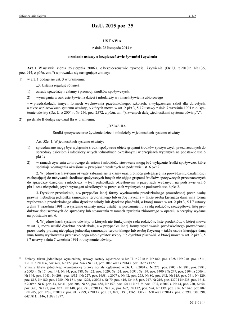 ©Kancelaria Sejmu s. 1/2 Dz.U. 2015 poz. 35 US T AW A z dnia 28 listopada 2014 r. o zmianie ustawy o bezpieczeństwie żywności i żywienia Art. 1. W ustawie z dnia 25 sierpnia 2006 r. o bezpieczeństwie żywności i żywienia (Dz. U. z 2010 r. Nr 136, poz. 914, z późn. zm. 1)) wprowadza się następujące zmiany: 1) w art. 1 dodaje się ust. 3 w brzmieniu: „3. Ustawa reguluje również: 1) zasady sprzedaży, reklamy i promocji środków spożywczych, 2) wymagania w zakresie żywienia dzieci i młodzieży w ramach żywienia zbiorowego – w przedszkolach, innych formach wychowania przedszkolnego, szkołach, z wyłączeniem szkół dla dorosłych, a także w placówkach systemu oświaty, o których mowa w art. 2 pkt 3, 5 i 7 ustawy z dnia 7 września 1991 r. o systemie oświaty (Dz. U. z 2004 r. Nr 256, poz. 2572, z późn. zm. 2)), zwanych dalej „jednostkami systemu oświaty”.”; 2) po dziale II dodaje się dział IIa w brzmieniu: „DZIAŁ IIA Środki spożywcze oraz żywienie dzieci i młodzieży w jednostkach systemu oświaty Art. 52c. 1. W jednostkach systemu oświaty: 1) sprzedawane mogą być wyłącznie środki spożywcze objęte grupami środków spożywczych przeznaczonych do sprzedaży dzieciom i młodzieży w tych jednostkach określonymi w przepisach wydanych na podstawie ust. 6 pkt 1; 2) w ramach żywienia zbiorowego dzieciom i młodzieży stosowane mogą być wyłącznie środki spożywcze, które spełniają wymagania określone w przepisach wydanych na podstawie ust. 6 pkt 2. 2. W jednostkach systemu oświaty zabrania się reklamy oraz promocji polegającej na prowadzeniu działalności zachęcającej do nabywania środków spożywczych innych niż objęte grupami środków spożywczych przeznaczonych do sprzedaży dzieciom i młodzieży w tych jednostkach określonymi w przepisach wydanych na podstawie ust. 6 pkt 1 oraz niespełniających wymagań określonych w przepisach wydanych na podstawie ust. 6 pkt 2. 3. Dyrektor przedszkola, a w przypadku innej formy wychowania przedszkolnego prowadzonej przez osobę prawną niebędącą jednostką samorządu terytorialnego lub osobę fizyczną – także osoba kierująca daną inną formą wychowania przedszkolnego albo dyrektor szkoły lub dyrektor placówki, o której mowa w art. 2 pkt 3, 5 i 7 ustawy z dnia 7 września 1991 r. o systemie oświaty może ustalić, w porozumieniu z radą rodziców, szczegółową listę produktów dopuszczonych do sprzedaży lub stosowania w ramach żywienia zbiorowego w oparciu o przepisy wydane na podstawie ust. 6. 4. W jednostkach systemu oświaty, w których nie funkcjonuje rada rodziców, listę produktów, o której mowa w ust. 3, może ustalić dyrektor przedszkola, a w przypadku innej formy wychowania przedszkolnego prowadzonej przez osobę prawną niebędącą jednostką samorządu terytorialnego lub osobę fizyczną – także osoba kierująca daną inną formą wychowania przedszkolnego albo dyrektor szkoły lub dyrektor placówki, o której mowa w art. 2 pkt 3, 5 i 7 ustawy z dnia 7 września 1991 r. o systemie oświaty. 1) 2) Zmiany tekstu jednolitego wymienionej ustawy zostały ogłoszone w Dz. U. z 2010 r. Nr 182, poz. 1228 i Nr 230, poz. 1511, z 2011 r. Nr 106, poz. 622, Nr 122, poz. 696 i Nr 171, poz. 1016 oraz z 2014 r. poz. 1662 i 1722. Zmiany tekstu jednolitego wymienionej ustawy zostały ogłoszone w Dz. U. z 2004 r. Nr 273, poz. 2703 i Nr 281, poz. 2781, z 2005 r. Nr 17, poz. 141, Nr 94, poz. 788, Nr 122, poz. 1020, Nr 131, poz. 1091, Nr 167, poz. 1400 i Nr 249, poz. 2104, z 2006 r. Nr 144, poz. 1043, Nr 208, poz. 1532 i Nr 227, poz. 1658, z 2007 r. Nr 42, poz. 273, Nr 80, poz. 542, Nr 115, poz. 791, Nr 120, poz. 818, Nr 180, poz. 1280 i Nr 181, poz. 1292, z 2008 r. Nr 70, poz. 416, Nr 145, poz. 917, Nr 216, poz. 1370 i Nr 235, poz. 1618, z 2009 r. Nr 6, poz. 33, Nr 31, poz. 206, Nr 56, poz. 458, Nr 157, poz. 1241 i Nr 219, poz. 1705, z 2010 r. Nr 44, poz. 250, Nr 54, poz. 320, Nr 127, poz. 857 i Nr 148, poz. 991, z 2011 r. Nr 106, poz. 622, Nr 112, poz. 654, Nr 139, poz. 814, Nr 149, poz. 887 i Nr 205, poz. 1206, z 2012 r. poz. 941 i 979, z 2013 r. poz. 87, 827, 1191, 1265, 1317 i 1650 oraz z 2014 r. poz. 7, 290, 538, 598, 642, 811, 1146, 1198 i 1877. 2015-01-14 ©Kancelaria Sejmu s. 2/2 5. W przypadku naruszenia przepisów ust. 1–4, dyrektor przedszkola, a w przypadku innej formy wychowania przedszkolnego prowadzonej przez osobę prawną niebędącą jednostką samorządu terytorialnego lub osobę fizyczną – także osoba kierująca daną inną formą wychowania przedszkolnego, dyrektor szkoły oraz dyrektor placówki, o której mowa w art. 2 pkt 3, 5 i 7 ustawy z dnia 7 września 1991 r. o systemie oświaty są uprawnieni do rozwiązania, bez zachowania terminu wypowiedzenia, umowy z podmiotem prowadzącym sprzedaż środków spożywczych lub działalność w zakresie zbiorowego żywienia dzieci i młodzieży, bez odszkodowania. 6. Minister właściwy do spraw zdrowia określi, w drodze rozporządzenia: 1) grupy środków spożywczych przeznaczonych do sprzedaży dzieciom i młodzieży w jednostkach systemu oświaty, 2) wymagania, jakie muszą spełniać środki spożywcze stosowane w ramach żywienia zbiorowego dzieci i młodzieży w jednostkach systemu oświaty – uwzględniając normy żywienia dzieci i młodzieży oraz mając na względzie wartości odżywcze i zdrowotne środków spożywczych.”; 3) w art. 103: a) w ust. 1 dodaje się pkt 8–10 w brzmieniu: „8) w ramach prowadzonej działalności sprzedaje w jednostce systemu oświaty środki spożywcze inne niż objęte grupami środków spożywczych przeznaczonych do sprzedaży dzieciom i młodzieży określonymi w przepisach wydanych na podstawie art. 52c ust. 6 pkt 1, 9) w ramach prowadzonej działalności reklamuje lub promuje w jednostce systemu oświaty środki spożywcze inne niż objęte grupami środków spożywczych przeznaczonych do sprzedaży dzieciom i młodzieży określonymi w prz