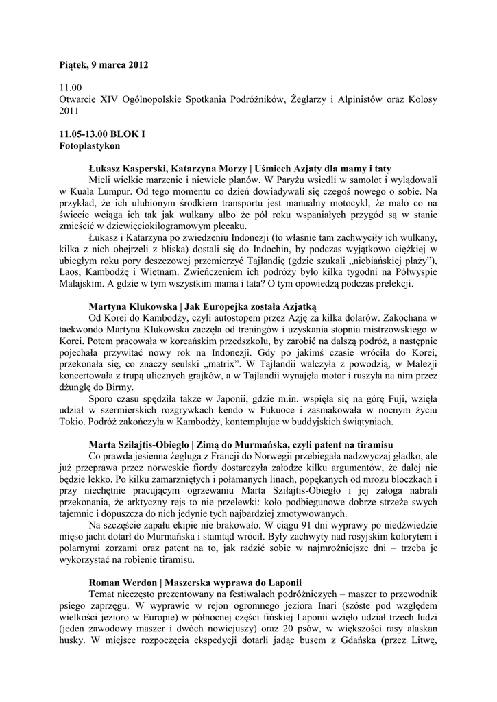 Piątek, 9 marca 2012 11.00 Otwarcie XIV Ogólnopolskie Spotkania Podróżników, Żeglarzy i Alpinistów oraz Kolosy 2011 11.05-13.00 BLOK I Fotoplastykon Łukasz Kasperski, Katarzyna Morzy | Uśmiech Azjaty dla mamy i taty Mieli wielkie marzenie i niewiele planów. W Paryżu wsiedli w samolot i wylądowali w Kuala Lumpur. Od tego momentu co dzień dowiadywali się czegoś nowego o sobie. Na przykład, że ich ulubionym środkiem transportu jest manualny motocykl, że mało co na świecie wciąga ich tak jak wulkany albo że pół roku wspaniałych przygód są w stanie zmieścić w dziewięciokilogramowym plecaku. Łukasz i Katarzyna po zwiedzeniu Indonezji (to właśnie tam zachwyciły ich wulkany, kilka z nich obejrzeli z bliska) dostali się do Indochin, by podczas wyjątkowo ciężkiej w ubiegłym roku pory deszczowej przemierzyć Tajlandię (gdzie szukali „niebiańskiej plaży”), Laos, Kambodżę i Wietnam. Zwieńczeniem ich podróży było kilka tygodni na Półwyspie Malajskim. A gdzie w tym wszystkim mama i tata? O tym opowiedzą podczas prelekcji. Martyna Klukowska | Jak Europejka została Azjatką Od Korei do Kambodży, czyli autostopem przez Azję za kilka dolarów. Zakochana w taekwondo Martyna Klukowska zaczęła od treningów i uzyskania stopnia mistrzowskiego w Korei. Potem pracowała w koreańskim przedszkolu, by zarobić na dalszą podróż, a następnie pojechała przywitać nowy rok na Indonezji. Gdy po jakimś czasie wróciła do Korei, przekonała się, co znaczy seulski „matrix”. W Tajlandii walczyła z powodzią, w Malezji koncertowała z trupą ulicznych grajków, a w Tajlandii wynajęła motor i ruszyła na nim przez dżunglę do Birmy. Sporo czasu spędziła także w Japonii, gdzie m.in. wspięła się na górę Fuji, wzięła udział w szermierskich rozgrywkach kendo w Fukuoce i zasmakowała w nocnym życiu Tokio. Podróż zakończyła w Kambodży, kontemplując w buddyjskich świątyniach. Marta Sziłajtis-Obiegło | Zimą do Murmańska, czyli patent na tiramisu Co prawda jesienna żegluga z Francji do Norwegii przebiegała nadzwyczaj gładko, ale już przeprawa przez norweskie fiordy dostarczyła załodze kilku argumentów, że dalej nie będzie lekko. Po kilku zamarzniętych i połamanych linach, popękanych od mrozu bloczkach i przy niechętnie pracującym ogrzewaniu Marta Sziłajtis-Obiegło i jej załoga nabrali przekonania, że arktyczny rejs to nie przelewki: koło podbiegunowe dobrze strzeże swych tajemnic i dopuszcza do nich jedynie tych najbardziej zmotywowanych. Na szczęście zapału ekipie nie brakowało. W ciągu 91 dni wyprawy po niedźwiedzie mięso jacht dotarł do Murmańska i stamtąd wrócił. Były zachwyty nad rosyjskim kolorytem i polarnymi zorzami oraz patent na to, jak radzić sobie w najmroźniejsze dni – trzeba je wykorzystać na robienie tiramisu. Roman Werdon | Maszerska wyprawa do Laponii Temat nieczęsto prezentowany na festiwalach podróżniczych – maszer to przewodnik psiego zaprzęgu. W wyprawie w rejon ogromnego jeziora Inari (szóste pod względem wielkości jezioro w Europie) w północnej części fińskiej Laponii wzięło udział trzech ludzi (jeden zawodowy maszer i dwóch nowicjuszy) oraz 20 psów, w większości rasy alaskan husky. W miejsce rozpoczęcia ekspedycji dotarli jadąc busem z Gdańska (przez Litwę, Łotwę, Estonię i Finlandię) – część uczestników w samochodzie, część w ciągniętej za nim przyczepie. Trasa ściśle maszerskiego etapu tej podróży za koło podbiegunowe wiodła z miejscowości Inari na północny wschód, systemem jezior, potoków i dolin do miejscowości Sevettijärvi. Tam, w zatoce jeziora, uczestnicy wyprawy urządzili sobie biwak, który stał się równocześnie ich bazą wypadową do dalszych wędrówek. 13.00-13.20 PRZERWA 13.20-17.05 BLOK II Krzysztof Paul | Zimowe zajęcia dla panów po siedemdziesiątce A tak dokładnie to nawet dla panów 75+. Chodzi o to, żeby w okresie zimowym po prostu poruszać się trochę na świeżym powietrzu. A że w mieście warunki nie zawsze zachęcają, przy okazji wyjechać gdzieś w plener. Dla przykładu: w roku 2009 do Norwegii, by dokonać trzeciego polskiego przejścia płaskowyżu Hardangervidda na nartach z południa na północ (Krzysztof Paul, Lech Wedlejt i Andrzej Szuksztul), raptem 170 km. Rok później na wewnętrzne morze Estonii, Väinameri (w składzie: Krzysztof Paul i Jan Faściszewski) – warunki lodowe były dobre, więc prawie 100 km, m.in. przez puste, zamarznięte akweny, szło się naprawdę wybornie. I wreszcie w marcu 2011 (Paulowi i Faściszewskiemu towarzyszył tym razem Krzysztof Dowgiałło) – śladami Wojciecha Moskala: 190 km z Oulu w Finlandii do Lulea w Szwecji po zamarzniętej Zatoce Botnickiej. Trochę wiało. Stefan Czerniecki | Szept amazońskiego potoku Wyprawa eksploracyjna w trudnodostępny stan Amazonas na południu Wenezueli, niemal w całości pokryty lasami deszczowymi i poprzecinany gęstą siecią dopływów Orinoko. Już samo tylko otrzymanie pozwolenia na działalność w tym terenie wymaga sporej determinacji, Stefanowi Czernieckiemu udało się zaś znacznie więcej. Dzięki współpracy z lokalnymi przewodnikami po kilku dniach podróży łodzią w górę Orinoko, a następnie Rio Cunucunuma dotarł do skalnego tepui Cerro Duida, gigantycznego ostańca należącego do jednej z najstarszych formacji geologicznych na Ziemi, i wszedł na jego szczyt. Dużą dawkę emocji gwarantowała jednak nie tylko zapierająca dech przyroda (zachody słońca nad Orinoko!), ale i zła sława działających tu karteli narkotykowych, przemytników złota i cyny, obozów kolumbijskiej partyzantki oraz czyhającej gdzieś w ciemnościach anakondy. Janek Lisewski | Bałtyk na desce Prosta sprawa: 11-metrowy latawiec, 130-centymetrowa deska i ponad 100-milowy dystans do pokonania. Z Polski do Szwecji przez Morze Bałtyckie. Samotnie, bez wsparcia łodzi asekuracyjnej. Przed Jankiem Lisewsk