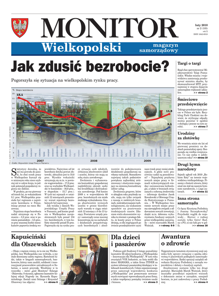 luty 2010 nr 2 (105) rok X ISSN 1642-0918 Jak zdusić bezrobocie? Pogorszyła się sytuacja na wielkopolskim rynku pracy. Targi o targi Rząd chce sprywatyzować Międzynarodowe Targi Poznańskie. Władze miasta i województwa zamierzają przekonywać ministra skarbu, by skomunalizował MTP, przynajmniej w stopniu dającym samorządom większość udziałów. >> strona 2 Śmieciowe przedsięwzięcie RYS. Z. GLONTI, FOT. S. SIEWIOR, LM – LOKALNE MEDIA Takiego przedsięwzięcia jeszcze w Polsce nie było. Recykling Park Chodzież ma dowieść, że utylizując odpady, można pozostać w zgodzie z ekologią i jeszcze na tym zarobić. >> strona 7 Urodziny za złotówkę We wrześniu minie sto lat od pierwszej premiery na deskach poznańskiej opery. Rozpoczęło się wielkie świętowanie. Co nas czeka w jubileuszowym roku? >> strona 10 S tatystycy dowodzą, że nie ma powodu do paniki, bo choć rynek pracy w Wielkopolsce kurczył się w minionym roku nieco szybciej niż w całym kraju, to jednak potencjał gospodarczy regionu nie słabnie. W grudniu, po raz pierwszy od trzech lat, ze wskaźnikiem 9,1 proc. Wielkopolska przestała być regionem o najniższym bezrobociu w Polsce, tracąc prymat na rzecz Mazowsza. Najniższa stopa bezrobocia nadal utrzymuje się w Poznaniu – 3,2 proc. oraz w powiecie poznańskim – 3,5 proc., co przy znacznej liczbie mieszkańców poprawia średnią wo- jewództwa. Najwyższe od lat bezrobocie dotyka powiat złotowski, aktualnie jest to 19,8 proc. Wysokie wskaźniki utrzymują się m.in. w powiecie wągrowieckim – 17,0 proc. oraz na wschodzie Wielkopolski (w konińskim – 16,0 proc., w słupeckim – 15,7 proc.). W tych też rejonach w ostatnich 12 miesiącach procentowy wzrost rejestracji bezrobotnych był najwyższy. Jak wynika z danych Wojewódzkiego Urzędu Pracy w Poznaniu, pod koniec grudnia w Wielkopolsce zarejestrowanych było ponad 134 tys. bezrobotnych, w tym kobiety stanowiły ponad 55 proc. Pogorszyła się na rynku pra- cy sytuacja osób młodych, zwłaszcza absolwentów szkół i uczelni, którzy nie mają za sobą stażu zawodowego. Zwolnienia i wyhamowanie koniunktury gospodarczej najdotkliwiej odczuły osoby bez kwalifikacji i doświadczenia zawodowego. Pod koniec 2009 r. w województwie 60 proc. bezrobotnych nie miało średniego wykształcenia. Grupa absolwentów wyższych uczelni w gronie bezrobotnych wzrosła w ciągu ostatnich 12 miesięcy z 8 do 13 tysięcy. Powiatowe urzędy pracy i samorządy coraz mocniej koncentrują się na zachętach i działaniach przygotowujących bezrobotnych i absol- wentów do podejmowania działalności gospodarczej na własny rachunek. Stosunkowo najwięcej takich podmiotów powiększa najbardziej zróżnicowany i elastycznie reagujący na zmienną koniunkturę sektor usług. Zwolnienia grupowe, które w ubiegłym roku przybrały na sile, mają nie tylko związek z recesją w niektórych branżach, restrukturyzacjami technologicznymi, czy szukaniem sposobów na przetrwanie trudniejszych czasów. Zdaniem wielu ekonomistów wynika to również z prostego faktu, że koszty pracy w Polsce drożeją, co dla migrujących po świecie przedsiębiorstw czyni nasz rynek pracy mniej atrakcyjnym. A gdzie nowi pracownicy nadal są poszukiwani? – Najszybciej przybywa nowych miejsc pracy w firmach wykorzystujących wiedzę i zawansowane technologie, a także w branżach związanych z ochroną środowiska – informuje dyrektor Jacek Kowalewski z Głównego Urzędu Statystycznego w Poznaniu. – W Wielkopolsce tworzenie nowych miejsc pracy ma niewątpliwie związek z oddawaniem nowych inwestycji, dzięki m.in. dobremu wykorzystaniu funduszy unijnych przez wielkopolskie samorządy – mówi marszałek Marek Woźniak. >>strony 8-9 Drugi hymn narodowy Sejmik ogłosił rok 2010 „Rokiem Roty” na terenie województwa wielkopolskiego. Piszemy o historii utworu, który omal nie stał się naszym hymnem narodowym, i o jego autorach. >> strona 11 Inna strona samorządu Co łączy Krystynę Poślednią i Joannę Szczepkowską? Przychodzi wąglik do wojewody… Horror: z radnej zostało tylko futro! Radny z PO, co nie lubi gry w golfa. >> strona 16 Dla dzieci i pasażerów Awantura o zdrowie – Oboje z mężem wiemy, że to nie my Wielkopolskę, lecz Wielkopolska nas wybrała, a my stale doceniamy zalety regionu. Rzetelność ludzi, także w kręgach samorządowych, bankowców, którzy nam zaufali, solidność i innowacyjność pracowników zatrudnionych w Solarisie, a nawet przyrodę. Wrośliśmy w to wszystko – mówi „gość Monitora” Solange Olszewska. 9 stycznia, ogłoszono laureatów kolejnej edycji Nagrody im. Ryszarda Kapuścińskiego. Zostali nimi Solange i Krzysztof Olszewscy (na zdjęciu). >> strona 6 Podczas gali finałowej 5 lutego poznaliśmy laureatów III edycji konkursu „i-Wielkopolska – Innowacyjni dla Wielkopolski”. W tym roku zwyciężyli VOX Industrie, za linię mebli dla dzieci MAMAMA, a także firma ITINER za system informacji pasażerskiej działający w telefonach komórkowych. Celem organizowanego przez samorząd województwa konkursu „i-Wielkopolska” jest promowanie nowoczesnych rozwiązań wprowadzanych przez firmy, a także współpracy pomiędzy światem nauki i biznesu. >> strona 3 Najgorętszym tematem styczniowej sesji sejmiku były sprawy związane z opieką zdrowotną w placówkach podległych samorządowi województwa. Radni opozycji zażądali odwołania Krystyny Pośledniej z zarządu województwa i debaty o kondycji szpitali. Zrealizowany zostanie tylko ten drugi postulat. Marszałek Marek Woźniak, który musiałby przedłożyć sejmikowi wniosek o dokonanie zmian w zarządzie, oznajmił bowiem, że jest zadowolony z pracy Pośledniej. >> strona 4 FOT. S. SIEWIOR Kapuściński dla Olszewskich 2 Monitor Wielkopolski | luty 2010 www.monitorwielkopolski.com.pl aktualnoœci na wstêpie Targi o targi Wielkopolskie blaski i cienie Samorządy województwa i miasta walczą, by