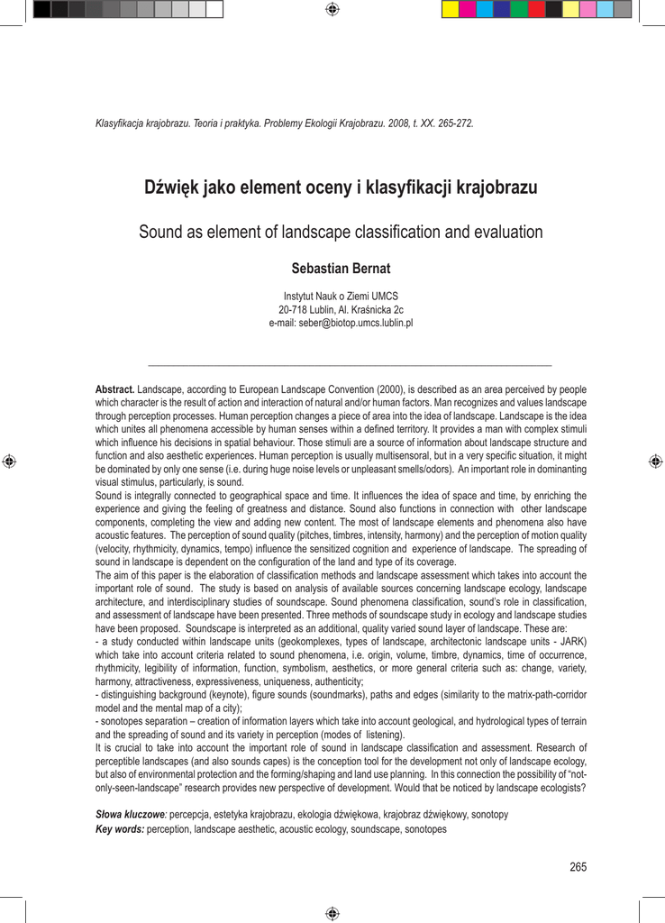 Klasyfikacja krajobrazu. Teoria i praktyka. Problemy Ekologii Krajobrazu. 2008, t. XX. 265-272. Dźwięk jako el�ement oceny i kl�asy��kacji krajobraz� Sound as ele�ent of landscape classification and evaluation Sebastian Bernat Instytut Nauk o Zie�i U�CS 20-718 Lublin, �l. �raśnicka 2c e-�ail: [email protected]�cs.lublin.pl ________________________________________________________________________________ Abstract. Landscape, according to European Landscape Convention (2000), is described as an area perceived by people which character is the result of action and interaction of natural and/or hu�an factors. �an recognizes and values landscape through perception processes. Hu�an perception changes a piece of area into the idea of landscape. Landscape is the idea which unites all pheno�ena accessible by hu�an senses within a defined territory. It provides a �an with co�plex sti�uli which influence his decisions in spatial behaviour. �hose sti�uli are a source of infor�ation about landscape structure and function and also aesthetic experiences. Hu�an perception is usually �ultisensoral, but in a very specific situation, it �ight be do�inated by only one sense (i.e. during huge noise levels or unpleasant s�ells/odors). �n i�portant role in do�inanting visual sti�ulus, particularly, is sound. Sound is integrally connected to geographical space and ti�e. It influences the idea of space and ti�e, by enriching the experience and giving the feeling of greatness and distance. Sound also functions in connection with other landscape co�ponents, co�pleting the view and adding new content. �he �ost of landscape ele�ents and pheno�ena also have acoustic features. �he perception of sound quality (pitches, ti�bres, intensity, har�ony) and the perception of �otion quality (velocity, rhyth�icity, dyna�ics, te�po) influence the sensitized cognition and experience of landscape. �he spreading of sound in landscape is dependent on the configuration of the land and type of its coverage. �he ai� of this paper is the elaboration of classification �ethods and landscape assess�ent which takes into account the i�portant role of sound. �he study is based on analysis of available sources concerning landscape ecology, landscape architecture, and interdisciplinary studies of soundscape. Sound pheno�ena classification, sound’s role in classification, and assess�ent of landscape have been presented. �hree �ethods of soundscape study in ecology and landscape studies have been proposed. Soundscape is interpreted as an additional, quality varied sound layer of landscape. �hese are: - a study conducted within landscape units (geoko�plexes, types of landscape, architectonic landscape units - J�R�) which take into account criteria related to sound pheno�ena, i.e. origin, volu�e, ti�bre, dyna�ics, ti�e of occurrence, rhyth�icity, legibility of infor�ation, function, sy�bolis�, aesthetics, or �ore general criteria such as: change, variety, har�ony, attractiveness, expressiveness, uniqueness, authenticity; - distinguishing background (keynote), figure sounds (sound�arks), paths and edges (si�ilarity to the �atrix-path-corridor �odel and the �ental �ap of a city); - sonotopes separation – creation of infor�ation layers which take into account geological, and hydrological types of terrain and the spreading of sound and its variety in perception (�odes of listening). It is crucial to take into account the i�portant role of sound in landscape classification and assess�ent. Research of perceptible landscapes (and also sounds capes) is the conception tool for the develop�ent not only of landscape ecology, but also of environ�ental protection and the for�ing/shaping and land use planning. In this connection the possibility of “notonly-seen-landscape” research provides new perspective of develop�ent. Would that be noticed by landscape ecologists? słowa kluczowe: percepc��a, estetyka kra��obrazu, ekologia dźwiękowa, kra��obraz dźwiękowy, sonotopy key words: perception, landscape aesthetic, acoustic ecology, soundscape, sonotopes 265 Bernat S. Wprowadzenie W badaniach ekologiczno-kra��obrazowych kra��obraz ��est układe� wza��e�nie powiązanych ele�entów tworzących pełną, ale zró�nicowaną wewnętrznie całość, funkc��onu��ącą w zgodzie z prawa�i przyrody, obdarzoną zdolnością do sa�oregulac��i i charakteryzu��ącą się określony� indywidualiz�e� (Richling 2002); kra��obraz ��est syste�e� infor�acy��ny� środowiska geograficznego (�ichalczyk 2002). W świetle Europe��skie�� �onwenc��i �ra��obrazowe�� (2000) kra��obraz to obszar postrzegany przez ludzi, którego charakter ��est wynikie� działalności i interakc��i czynników przyrodniczych i/lub ludzkich; ��est zate� rzeczywistością geograficzno-psychologiczną (Bartkowski 1985). Człowiek pozna��e i wartościu��e kra��obraz poprzez procesy percepc��i. Ludzka percepc��a z�ienia wycinek powierzchni Zie�i w ideę kra��obrazu. �ra��obraz ��est zate� ideą ��ednoczącą wszystkie dostępne z�ysła�i z��awiska w ra�ach określonego terytoriu� (Passarge 1924). �ra��obraz dostarcza człowiekowi zło�onych bodźców, wpływa��ących w du�y� stopniu na ��ego decyz��e i zachowania przestrzenne (�.in. Bartkowski 1985; �owalczyk 1992; Pietrzak 1998). Są one źródłe� infor�ac��i o strukturze i funkc��onowaniu kra��obrazu a tak�e źródłe� prze�yć estetycznych. Coraz częście�� w �iędzynarodowych progra�ach podkreślana ��est wielofunkcy��ność kra��obrazu. W kra��obrazie �a�y bowie� koegzystenc��ę funkc��i ekologicznych, ekono�