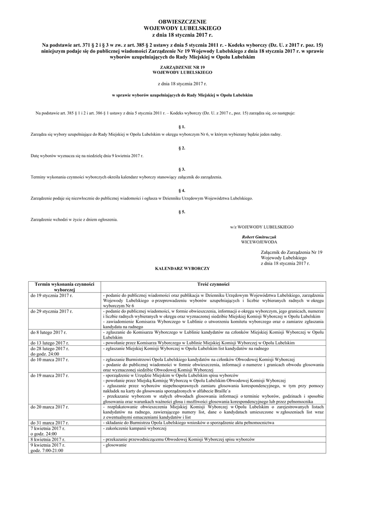 OBWIESZCZENIE WOJEWODY LUBELSKIEGO z dnia 18 stycznia 2017 r. Na podstawie art. 371 § 2 i § 3 w zw. z art. 385 § 2 ustawy z dnia 5 stycznia 2011 r. - Kodeks wyborczy (Dz. U. z 2017 r. poz. 15) niniejszym podaje się do publicznej wiadomości Zarządzenie Nr 19 Wojewody Lubelskiego z dnia 18 stycznia 2017 r. w sprawie wyborów uzupełniających do Rady Miejskiej w Opolu Lubelskim ZARZĄDZENIE NR 19 WOJEWODY LUBELSKIEGO z dnia 18 stycznia 2017 r. w sprawie wyborów uzupełniających do Rady Miejskiej w Opolu Lubelskim Na podstawie art. 385 § 1 i 2 i art. 386 § 1 ustawy z dnia 5 stycznia 2011 r. – Kodeks wyborczy (Dz. U. z 2017 r., poz. 15) zarządza się, co następuje: § 1. Zarządza się wybory uzupełniające do Rady Miejskiej w Opolu Lubelskim w okręgu wyborczym Nr 6, w którym wybierany będzie jeden radny. § 2. Datę wyborów wyznacza się na niedzielę dnia 9 kwietnia 2017 r. § 3. Terminy wykonania czynności wyborczych określa kalendarz wyborczy stanowiący załącznik do zarządzenia. § 4. Zarządzenie podaje się niezwłocznie do publicznej wiadomości i ogłasza w Dzienniku Urzędowym Województwa Lubelskiego. § 5. Zarządzenie wchodzi w życie z dniem ogłoszenia. w/z WOJEWODY LUBELSKIEGO Robert Gmitruczuk WICEWOJEWODA Załącznik do Zarządzenia Nr 19 Wojewody Lubelskiego z dnia 18 stycznia 2017 r. KALENDARZ WYBORCZY Termin wykonania czynności wyborczej do 19 stycznia 2017 r. do 29 stycznia 2017 r. do 8 lutego 2017 r. do 13 lutego 2017 r. do 28 lutego 2017 r. do godz. 24:00 do 10 marca 2017 r. do 19 marca 2017 r. do 20 marca 2017 r. do 31 marca 2017 r. 7 kwietnia 2017 r. o godz. 24:00 8 kwietnia 2017 r. 9 kwietnia 2017 r. godz. 7:00-21:00 Treść czynności - podanie do publicznej wiadomości oraz publikacja w Dzienniku Urzędowym Województwa Lubelskiego, zarządzenia Wojewody Lubelskiego o przeprowadzeniu wyborów uzupełniających i liczbie wybieranych radnych w okręgu wyborczym Nr 6 - podanie do publicznej wiadomości, w formie obwieszczenia, informacji o okręgu wyborczym, jego granicach, numerze i liczbie radnych wybieranych w okręgu oraz wyznaczonej siedzibie Miejskiej Komisji Wyborczej w Opolu Lubelskim - zawiadomienie Komisarza Wyborczego w Lublinie o utworzeniu komitetu wyborczego oraz o zamiarze zgłaszania kandydata na radnego - zgłaszanie do Komisarza Wyborczego w Lublinie kandydatów na członków Miejskiej Komisji Wyborczej w Opolu Lubelskim - powołanie przez Komisarza Wyborczego w Lublinie Miejskiej Komisji Wyborczej w Opolu Lubelskim - zgłaszanie Miejskiej Komisji Wyborczej w Opolu Lubelskim list kandydatów na radnego - zgłaszanie Burmistrzowi Opola Lubelskiego kandydatów na członków Obwodowej Komisji Wyborczej - podanie do publicznej wiadomości w formie obwieszczenia, informacji o numerze i granicach obwodu głosowania oraz wyznaczonej siedzibie Obwodowej Komisji Wyborczej - sporządzenie w Urzędzie Miejskim w Opolu Lubelskim spisu wyborców - powołanie przez Miejską Komisję Wyborczą w Opolu Lubelskim Obwodowej Komisji Wyborczej - zgłaszanie przez wyborców niepełnosprawnych zamiaru głosowania korespondencyjnego, w tym przy pomocy nakładek na karty do głosowania sporządzonych w alfabecie Braille`a - przekazanie wyborcom w stałych obwodach głosowania informacji o terminie wyborów, godzinach i sposobie głosowania oraz warunkach ważności głosu i możliwości głosowania korespondencyjnego lub przez pełnomocnika - rozplakatowanie obwieszczenia Miejskiej Komisji Wyborczej w Opolu Lubelskim o zarejestrowanych listach kandydatów na radnego, zawierającego numery list, dane o kandydatach umieszczone w zgłoszeniach list wraz z ewentualnymi oznaczeniami kandydatów i list - składanie do Burmistrza Opola Lubelskiego wniosków o sporządzenie aktu pełnomocnictwa - zakończenie kampanii wyborczej - przekazanie przewodniczącemu Obwodowej Komisji Wyborczej spisu wyborców - głosowanie