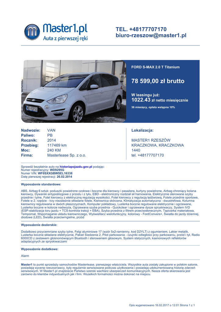 TEL. +48177707170 [email protected] FORD S-MAX 2.0 T Titanium 78 599,00 zł brutto W leasingu już: 1022.43 zł netto miesięcznie 36 miesięcy, opłata wstępna 10% Nadwozie: Paliwo: Rocznik: Przebieg: Moc: Firma: VAN PB 2014 117469 km 240 KM Masterlease Sp. z o.o. Lokalizacja: MASTER1 RZESZÓW KRACZKOWA, KRACZKOWA 1440 tel. +48177707170 Sprawdź bezpłatnie auto na historiapojazdu.gov.pl podając: Numer rejestracyjny: WD9295G Numer VIN: WF0SXXGBWSEL16338 Datę pierwszej rejestracji: 26.02.2014 Wyposażenie standardowe: ABS, Airbag 6 sztuk: poduszki powietrzne czołowe i boczne dla kierowcy i pasażera, kurtyny powietrzne, Airbag chroniący kolana kierowcy, Dywaniki antypoślizgowe z przodu i z tyłu, EBD - elektroniczny rozdział sił hamowania, Elektrycznie sterowane szyby przednie i tylne, Fotel kierowcy z elektryczną regulacją wysokości, Fotel kierowcy z regulacją lędźwiową, Fotele przednie sportowe, Fotele w 2. rzędzie - trzy niezależnie składane fotele, Kierownica skórzana, Klimatyzacja automatyczna - dwustrefowa, Kolumna kierownicy regulowana w dwóch płaszczyznach, Komputer pokładowy, Lusterka boczne regulowane elektrycznie i ogrzewane, Lusterka boczne w kolorze nadwozia, Ogrzewana szyba przednia - Quickclear i ogrzewane dysze spryskiwaczy, System IVD (ESP-stabilizacja toru jazdu + TCS-kontrola trakcji + EBA), Szyba przednia z filtrem przeciwsłonecznym, Tapicerka materiałowa, Tempomat, Wspomaganie układu kierowniczego, Wyświetlacz wielofunkcyjny, kolorowy - FordConvers+, Światła do jazdy dziennej, diodowe (LED), Światła przeciwmgielne, przód Wyposażenie dealerskie: Dodatkowo przyciemniane szyby tylne, Felgi aluminiowe 17 (wzór 5x2-ramienny, kod D2YLT) z ogumieniem, Lakier metalik, Lusterka boczne składane elektrycznie, Pakiet Siedzenia 2, Pilot parkowania - czujniki odległości przy parkowaniu, przód i tył, Radio 6000CD z zestawem głośnomówiącym Bluetooth i sterowaniem głosowym, System statycznych, ksenonowych reflektorów adaptacyjnych ze spryskiwaczami Wyposażenie dodatkowe: Alarm Master1 to punkt sprzedaży samochodów Masterlease, pierwszego właściciela. Wszystkie auta zostały zakupione w polskim salonie, posiadają wycenę rzeczoznawcy, były regularnie serwisowane podczas użytkowania i posiadają udokumentowaną historię zdarzeń serwisowych. W Master1.pl znajdziecie Państwo szeroki wachlarz ubezpieczeń komunikacyjnych. Nasza oferta skierowana jest zarówno do klientów indywidualnych jak i firm. Wszelkich formalności można dokonać na miejscu. Opis wygenerowano 16.02.2017 o 12:01 Strona 1 z 1
