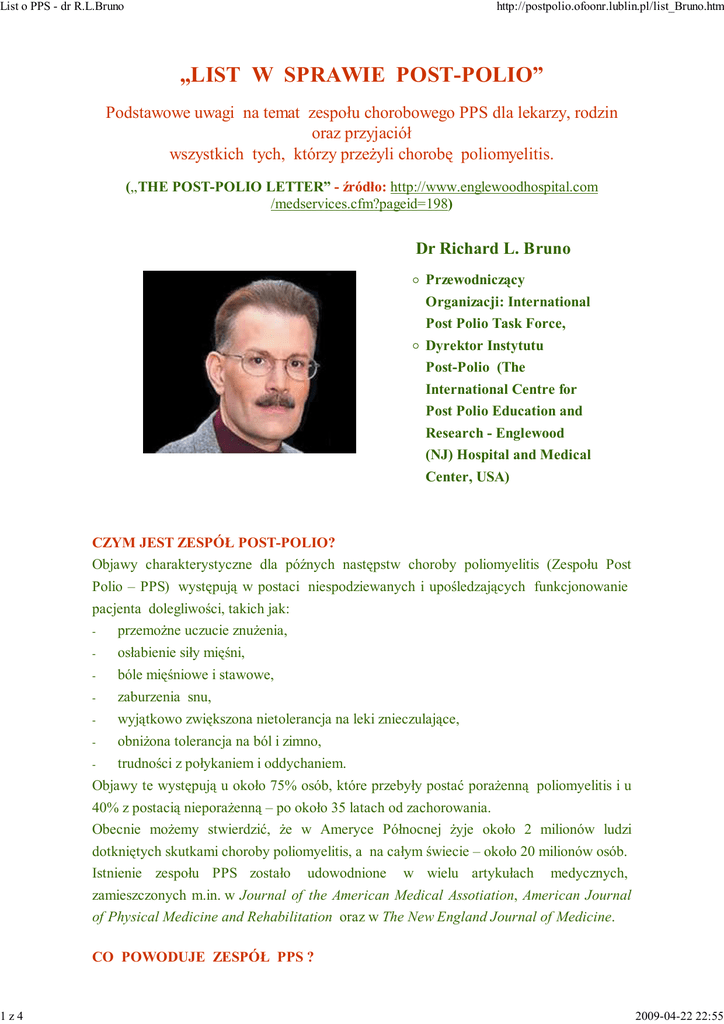 List o PPS - dr R.L.Bruno 1z4 http://postpolio.ofoonr.lublin.pl/list_Bruno.htm „LIST W SPRAWIE POST-POLIO” Podstawowe uwagi na temat zespołu chorobowego PPS dla lekarzy, rodzin oraz przyjaciół wszystkich tych, którzy przeŜyli chorobę poliomyelitis. („THE POST-POLIO LETTER” - źródło: http://www.englewoodhospital.com /medservices.cfm?pageid=198) Dr Richard L. Bruno Przewodniczący Organizacji: International Post Polio Task Force, Dyrektor Instytutu Post-Polio (The International Centre for Post Polio Education and Research - Englewood (NJ) Hospital and Medical Center, USA) CZYM JEST ZESPÓŁ POST-POLIO? Objawy charakterystyczne dla późnych następstw choroby poliomyelitis (Zespołu Post Polio – PPS) występują w postaci niespodziewanych i upośledzających funkcjonowanie pacjenta dolegliwości, takich jak: przemoŜne uczucie znuŜenia, - osłabienie siły mięśni, - bóle mięśniowe i stawowe, - zaburzenia snu, - wyjątkowo zwiększona nietolerancja na leki znieczulające, - obniŜona tolerancja na ból i zimno, - trudności z połykaniem i oddychaniem. Objawy te występują u około 75% osób, które przebyły postać poraŜenną poliomyelitis i u 40% z postacią nieporaŜenną – po około 35 latach od zachorowania. Obecnie moŜemy stwierdzić, Ŝe w Ameryce Północnej Ŝyje około 2 milionów ludzi dotkniętych skutkami choroby poliomyelitis, a na całym świecie – około 20 milionów osób. Istnienie zespołu PPS zostało udowodnione w wielu artykułach medycznych, zamieszczonych m.in. w Journal of the American Medical Assotiation, American Journal of Physical Medicine and Rehabilitation oraz w The New England Journal of Medicine. CO POWODUJE ZESPÓŁ PPS ? 2009-04-22 22:55 List o PPS - dr R.L.Bruno 2z4 Ten http://postpolio.ofoonr.lublin.pl/list_Bruno.htm zespół chorobowy wywołany jest poprzez trwające przez dziesięciolecia ponadprzeciętne obciąŜenie układu neuromięśniowego. Wirus polio z reguły uszkodził około 95% neuronów ruchowych w pniu mózgu oraz w rdzeniu kręgowym, a około 50% z nich zniszczył nieodwracalnie. Praktycznie nie ma mięśnia niedotkniętego atakiem tego wirusa w sposób mniejszy lub większy; okazuje się, Ŝe dotyczy to teŜ neuronów aktywujących centralny układ nerwowy, utrzymujących go w stanie aktywności i czuwania oraz odpowiedzialnych za koncentrację uwagi. Pomimo, Ŝe uszkodzone – neurony, które przeŜyły podjęły dodatkową pracę, wypuszczając "kiełki", jak dodatkowe linie telefoniczne, aby uaktywnić mięśnie osierocone przez obumarłe neurony ruchowe. Te przerośnięte, uszkodzone przez wirusa poliomyelitis neurony, teraz szwankują i giną z przepracowania, powodując osłabienie siły mięśniowej i zmęczenie. Nadmierne – w tym momencie – wykorzystywanie potencjału osłabionych mięśni powoduje powstanie objawów w postaci bólów mięśniowych i stawowych, a czasem trudności w oddychaniu i połykaniu. JAK MOśNA ROZPOZNAĆ ZESPÓŁ PPS ? Nie istnieje Ŝaden charakterystyczny i swoisty test na rozpoznawanie zespołu PPS – nie jest nim równieŜ elektromiografia (EMG). PPS rozpoznawany jest w drodze wykluczenia istnienia innych schorzeń dających podobne objawy (w tym zaburzenia oddechowe i skurcze mięśni zakłócające sen), niedoczynności tarczycy, anemii. Inne schorzenia neuromięśniowe prawie nigdy nie są odpowiedzialne za pojawienie się objawów PPS. CZY PPS STANOWI ZAGROśENIE śYCIA ? Nie. JednakŜe – z powodu uszkodzenia neuronów centralnego układu nerwowego – osoby po polio są szczególnie wraŜliwe na doŜylne lub wziewne anestetyki oraz na leki uspokajające; potrzebują więc mniejszych dawek tych środków. Osoby po przebytym polio mogą mieć trudności z wybudzeniem się z narkozy i mogą mieć problemy z oddychaniem i połykaniem nawet przy lokalnych znieczuleniach stomatologicznych. CZY PPS JEST CHOROBĄ POSTĘPUJĄCĄ ? PPS nie jest ani postępujące, ani nie jest chorobą. PPS jest spowodowane zmęczeniem organizmu wywołanym przez zbyt duŜe przeciąŜenia zbyt małej liczby neuronów – przerośniętych i uszkodzonych przez wirus poliomyelitis. JednakŜe stwierdzono, Ŝe u osób po przebytym polio, z nieleczonym osłabieniem mięśni, kaŜdego roku ginie około 7% funkcjonujących, przepracowanych neuronów ruchowych. CZY PPS MOśNA LECZYĆ ? Tak. Osoby po przebytym polio muszą "oszczędzać się, by się ocalić”, to znaczy: oszczędzać energię i zaprzestać nadmiernego wykorzystywania ruchowego swego ciała, aby zachować sprawność. Osoby te powinny mniej chodzić, uŜywać wszystkich dostępnych im pomocy ortopedycznych: ortez, kul, lasek, wózków, a przede wszystkim: planować okresy wypoczynku oraz zaprzestawać wysiłku zanim wystąpią objawy PPS. PoniewaŜ wiele osób po przebytym polio ma tendencję do niedocukrzeń, powinni oni – w celu zmniejszenia osłabienia mięśniowego – jeść wysokobiałkowe śniadania i 2009-04-22 22:55 List o PPS - dr R.L.Bruno 3z4 http://postpolio.ofoonr.lublin.pl/list_Bruno.htm spoŜywać często w ciągu dnia niewielkie posiłki wysokobiałkowe i niskotłuszczowe. CZY ĆWICZENIA SĄ JEDYNYM SPOSOBEM, BY WZMOCNIĆ MIĘŚNIE? Nie. Ćwiczenia obciąŜające układ mięśniowy zwiększają jego wyczerpanie. A więc „siódme poty” i „palenie gumy” doprowadzą jedynie do "wypalenia" ocalałych neuronów ruchowych. Osoby po przebytym polio zazwyczaj nie mogą wykonywać forsownych ćwiczeń aby poprawiać kondycję układu krąŜenia. Pomocne natomiast mogą być ćwiczenia rozciągające. Ale jakakolwiek terapia nie moŜe wywoływać lub nasilać objawów PPS. CZY LECZENIE PPS DAJE JAKIEŚ EFEKTY? Tak. W najgorszym przypadku objawy zespołu PPS przechodzą do fazy plateau, czyli dotychczasowej, stałej – gdy osoba po przebytym polio nie będzie zbyt często nadmiernie przeciąŜać mięśni. Większość tych osób – gdy zacznie dbać o stosowanie oszczędzającego trybu Ŝycia i o prawidłowy 