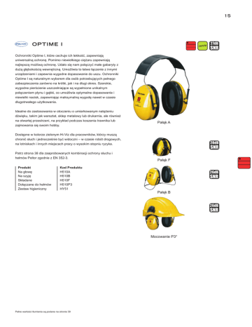 15 OPTIME I Ochronniki Optime I, które cechuje ich lekkość, zapewniają uniwersalną ochronę. Pomimo niewielkiego ciężaru zapewniają najlepszą możliwą ochronę. Udało się nam połączyć małe gabaryty z dużą głębokością wewnętrzną. Umożliwia to łatwe łączenie z innymi urządzeniami i zapewnia wygodne dopasowanie do uszu. Ochronniki Optime I są naturalnym wyborem dla osób potrzebujących pełnego zabezpieczenia zarówno na krótki, jak i na długi okres. Szerokie, wygodne pierścienie uszczelniające są wypełnione unikalnym połączeniem płynu i gąbki, co umożliwia optymalne dopasowanie i niewielki nacisk, zapewniając maksymalną wygodę nawet w czasie długotrwałego użytkowania. Idealne do zastosowania w otoczeniu o umiarkowanym natężeniu dźwięku, takim jak warsztat, sklep metalowy lub drukarnia, ale również na otwartej przestrzeni, na przykład podczas koszenia trawnika lub zajmowania się swoim hobby. Pałąk A Dostępne w kolorze zielonym Hi-Viz dla pracowników, którzy muszą chronić słuch i jednocześnie być widoczni – w czasie robót drogowych, na lotniskach i innych miejscach pracy o wysokim stopniu ryzyka. Patrz strona 38 dla zaaprobowanych kombinacji ochrony słuchu i hełmów Peltor zgodnie z EN 352-3. Produkt Na głowę Na szyję Składane Dołączane do hełmów Zestaw higieniczny Pałąk F Kod Produktu H510A H510B H510F H510P3 HY51 Pałąk B Mocowanie P3* Pełne wartości tłumienia są podane na stronie 39 16 BULL’S EYE I Nauszniki Peltor Bull’s Eye I zostały zaprojektowane we współpracy ze światowej klasy strzelcami sportowymi. Celem było stworzenie nauszników, które będą sprawdzały się w różnych dyscyplinach tego sportu. Na przykład dolna część nauszników posiada specjalne wycięcie, które ułatwia składanie się do strzału długą bronią. Poza tym poziom tłumienia tych nauszników, przy zachowaniu ich niewielkich rozmiarów, zapewnia odpowiednią ochronę w większości sytuacji. Nauszniki powinny być wygodne; po to by nosić ja zawsze wtedy gdy pojawia się niebezpieczny hałas i po to by nic nie dekoncentrowało strzelca podczas strzelania. To dlatego nauszniki Peltor Bull’s Eye I mają szerokie, wygodne poduszki uszczelniające wypełnione pianką i płynem co zapewnia optymalne uszczelnienie i niewielki ucisk. Składane nauszniki dają łatwo i bezpiecznie przechowywać się w kieszeni lub torbie. Produkt Na głowę Zestaw higieniczny Kod Produktu Bull’s Eye I: H515FB-516-** (**= GN, RD or SV) HY51 HY51 GN Pełne wartości tłumienia są podane na stronie 39 17 H 31 Płaskie ochronniki słuchu są idealne do prac w leśnictwie, tartakach i przemyśle. To wygodne nauszniki ze znakomitym tłumieniem, niewielkim uciskiem, przylegające do głowy bez odstających części. Kształt czasz tłumiących został tak zaprojektowany aby stworzyć ochronnik słuchu, który będzie idealnie pasował do kasku ochronnego. Górna część czaszy została wyprofilowana i znakomicie mieści się pod skorupą hełmu. Szerokie, wygodne poduszki uszczelniające są wypełnione pianką i płynem co zapewnia optymalne uszczelnienie i niewielki ucisk pozwalający używać je przez długi czas. Poduszki uszczelniające posiadają kanały wentylacyjne a folia z której są wykonane jest miękka i higieniczna. Patrz strona 38 dla zaaprobowanych kombinacji ochrony słuchu i hełmów Peltor zgodnie z EN 352-3. Produkt Na głowę Na szyję Dołączane do hełmów Kod Produktu H31A 300 H31B 300 H31P3* 300 Pełne wartości tłumienia są podane na stronie 39 23 OPTIME II Ochronniki Optime II zaprojektowano do użytku w środowisku, w którym użytkownik jest szczególnie narażony na działanie hałasu, dlatego tłumią one w maksymalnym stopniu również dźwięki o niskiej częstotliwości. Poduszki uszczelniające są wypełnione specjalnym połączeniem płynu i gąbki. Połączenie to zapewnia idealne dopasowanie i niewielki ucisk, dzięki czemu uzyskano maksymalną wygodę nawet w czasie długotrwałego użytkowania. Poduszki uszczelniające są wyposażone w kanaliki wentylacyjne i zostały pokryte miękką i higieniczną folią. Ochronników Optime II można używać w otoczeniu, w którym występuje duże nasilenie hałasu związanego z przemysłem, pracą maszyn, hałasem na lotniskach lub w rolnictwie. Dostępne również w wersji dielektrycznej (brak widocznych metalowych elementów). Dostępne w kolorze zielonym Hi-Viz dla pracowników, którzymuszą chronić słuch i jednocześnie być widoczni – w czasie robót drogowych, Pałąk A na lotniskach i innych miejscach pracy o wysokim stopniu ryzyka. Patrz strona 38 dla zaaprobowanych kombinacji ochrony słuchu i hełmów Peltor zgodnie z EN 352-3. Produkt Na głowę Na szyję Składane Dołączane do hełmów Zestaw higieniczny Kod Produktu H520A H520B H520F H520P3 HY52 Pałąk F Pałąk B Mocowanie P3* Pełne wartości tłumienia są podane na stronie 40 32 OPTIME III Optime III to super ochronnik słuchu przeznaczony do zastosowań w bardzo hałaśliwym otoczeniu. Ochrona słuchu opiera się na technologii wykorzystującej podwójną obudowę, która minimalizuje rezonans w czaszy. Zapewnia to maksymalne tłumienie dźwięków o wysokich częstotliwościach i jednocześnie umożliwia zrozumienie rozmowy i wydawanych poleceń. Akustyczne połączenie między wewnętrzną przestrzenią i przestrzenią pomiędzy obudowami zapewnia z kolei maksymalne tłumienie niskich częstotliwości. Pierścienie uszczelniające są szerokie i wypełnione miękką gąbką, dzięki czemu nie uciskają nadmiernie i można je dokładnie dopasować. Skuteczna ochrona oraz wygoda to cechy ochronników Optime III. Dostępne w kolorze zielonym Hi-Viz dla pracowników, którzy muszą chronić słuch i jednocześnie być widoczni – w czasie robót drogowych, na lotniskach i innych miejscach pracy o wysokim stopniu ryzyka. Pałąk A Patrz strona 38 dla zaaprobowanych kombinacji oc