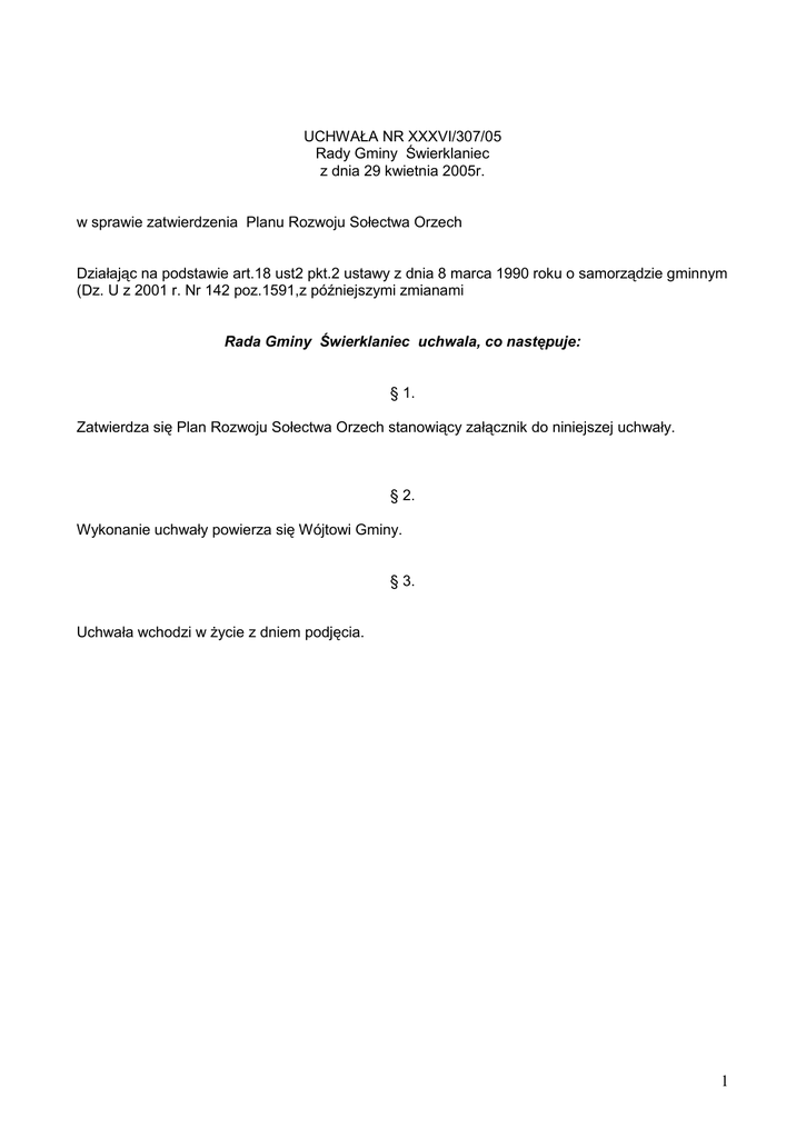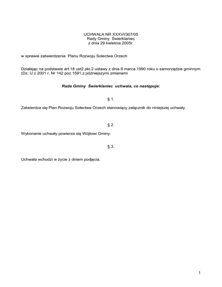 UCHWAŁA NR XXXVI/307/05 Rady Gminy Świerklaniec z dnia 29 kwietnia 2005r. w sprawie zatwierdzenia Planu Rozwoju Sołectwa Orzech Działając na podstawie art.18 ust2 pkt.2 ustawy z dnia 8 marca 1990 roku o samorządzie gminnym (Dz. U z 2001 r. Nr 142 poz.1591,z późniejszymi zmianami Rada Gminy Świerklaniec uchwala, co następuje: § 1. Zatwierdza się Plan Rozwoju Sołectwa Orzech stanowiący załącznik do niniejszej uchwały. § 2. Wykonanie uchwały powierza się Wójtowi Gminy. § 3. Uchwała wchodzi w życie z dniem podjęcia. 1 Załącznik nr 1 do Uchwały Rady Gminy Świerklaniec Nr XXXVI/307/05 z dnia 29.04.2005r. Sołectwo Orzech Gmina Świerklaniec Plan rozwoju miejscowości Orzech w Gminie Świerklaniec na lata 2005 – 2008 Opracowała Rada Sołecka Sołectwa Orzech 2 Spis treści 1. 2. 3. 4. 5. 6. 7. 8. Charakterystyka gminy Świerklaniec Charakterystyka miejscowości – sołectwa Orzech. Inwentaryzacja zasobów miejscowości – sołectwa Orzech. Ocena mocnych i słabych stron miejscowości – sołectwa Orzech. Planowane kierunki rozwoju miejscowości – sołectwa Orzech. Opis planowanego przedsięwzięcia. Szacunkowy kosztorys planowanego przedsięwzięcia. Harmonogram planowanego przedsięwzięcia. 3 1.Charakterystyka gminy Świerklaniec Gmina Świerklaniec położona jest w północnej części Górnego Śląska, w sąsiedztwie Tarnowskich Gór, Piekar Śląskich, Radzionkowa i Miasteczka Śląskiego, administracyjnie przynależy do powiatu tarnogórskiego. Rys. 1 Usytuowanie gminy Świerklaniec w powiecie tarnogórskim Powstanie gminy w jej obecnych granicach nastąpiło w 1977r. w wyniku połączenia dwóch gmin Nakło i Świerklaniec. Obecnie granice gminy obejmują obszar o powierzchni 44,3 km 2. Ośrodkiem administracyjnym gminy jest Świerklaniec. Mieści się tutaj Urząd Gminy i wiele instytucji o zasięgu ponad gminnym oraz firm usługowych. Podstawową jednostką osadniczą gminy są sołectwa: Świerklaniec, Nakło, Nowe Chechło i Orzech, które w przeszłości były odrębnymi miejscowościami Rys. 2 Położenie sołectw na terenie gminy Świerklaniec. Przez teren gminy przebiegają główne szlaki komunikacyjne: droga krajowa nr 78 (Tarnowskie Góry – Siewierz), droga wojewódzka nr 911 (Świerklaniec – Bytom) oraz drogi powiatowe. Gmina Świerklaniec pod względem walorów środowiska przyrodniczego jest jedną z najatrakcyjniejszych w regionie. Do jej atutów zaliczyć należy: wysoką lesistość, czystsze powietrze w porównaniu z okolicznymi przemysłowymi miastami, występujące na jej obszarze zbiorniki wodne i parki. Lasy zajmują 47,4% całkowitej powierzchni gminy i są skoncentrowane w północnej jej części. Funkcja lasów nie ogranicza się jedynie do rekreacji, ale pełnią one także rolę 4 ochronną i gospodarczą. Teren zamknięty granicami administracyjnymi gminy Świerklaniec posiada specyficzny, rekreacyjno - wypoczynkowy charakter. Decydują o tym lokalne warunki przyrodnicze oraz położenie geograficzne na obrzeżach aglomeracji górnośląskiej. Na terenie gminy zlokalizowane są dwa duże zbiorniki wodne: jezioro Świerklanieckie (zbiornik Kozłowa Góra), które stanowi rezerwuar wody dla celów zaopatrzenia w wodę Górnego Śląska, to także ważny element krajobrazowo – przyrodniczy. Zbiornik ten zlokalizowany jest w pobliżu w Parku w Świerklańcu o powierzchni około 160 ha, który stanowi unikatową kompozycję, składająca się z terenów leśnych, łąk, alejek i stawów, ze 120 letnimi dębami, sosnami wejmutkami i wieloma cennymi gatunkami drzew. Jezioro Chechło - Nakło (Zalew Nakło – Chechło) powstało w miejscu dawnego wyrobiska piasku, zalew pełni funkcje rekreacyjno – wypoczynkowo – sportowe, położony jest w sąsiedztwie kompleksu leśnego. Ma on wody pierwszej klasy czystości i udostępniony jest do kąpieli. Na skutek bliskiego położenia i dogodnego dojazdu gmina jest miejscem turystycznym i rekreacyjnym dla mieszkańców okolicznych miast. Park Świerklaniecki przyciąga tysiące spacerowiczów a latem jezioro Chechło-Nakło jest miejscem wypoczynku sobotnio-niedzielnego dla dziesiątków tysięcy ludzi. Gminę Świerklaniec zamieszkuje około 10 800 osób. Z roku na rok zwiększa się liczba ludzi najstarszych, a maleje liczba osób w rocznikach najmłodszych, jednakże gmina Świerklaniec jest w korzystnej sytuacji pod względem demograficznym, ponieważ od kilku lat charakteryzuje ją dodatnie saldo migracyjne. Tak więc liczba mieszkańców, pomimo obniżającego się przyrostu naturalnego, ma tendencję wzrostową poprzez napływ ludności z okolicznych miast. Najliczniejszą grupę mieszkańców stanowi ludność w wieku produkcyjnym (62%), następnie przedprodukcyjnym (21,3%) i poprodukcyjnym (16,7%). Tabela 1. Liczba ludności w gminie Świerklaniec. Lata Orzech Świerklaniec Nakło Nowe Chechło Razem 2000 2001 2002 2003 2004 1848 1852 1859 1899 1915 3685 3669 3667 3671 3688 3937 3894 3873 3912 3859 1224 1228 1247 1290 1319 10 694 10 643 10 646 10 772 10 781 Liczba bezrobotnych w gminie od kilku lat systematycznie rośnie. Głównym powodem jest likwidacja i restrukturyzacja kopalń, hut i innych zakładów, w których mieszkańcy znajdowali zatrudnienie. Bezrobocie w gminie kształtuje się na podobnym poziomie jak w całym powiecie, w którym, stopa bezrobocia wynosi 16,4%. W gminie Świerklaniec prosperuje około 500 przedsiębiorstw, aż 75% z nich zostało założonych przez miejscową ludność. W gminie przeważają przedsiębiorstwa usługowe, stanowią one prawie 50% wszystkich zarejestrowanych. Najwięcej świadczy usługi w zakresie prac remontowo – budowlanych, wysokim udziałem odznaczają się także firmy transportowe i gastronomiczne. Przedsiębiorstw handlowych jest dwa razy mniej niż usługowych a najmniejszy udział mają przedsiębiorstwa produkcyjne, 6% pośród wszystkich firm. Na terenie Gminy Świerklaniec znajdują się następujące zabytki 