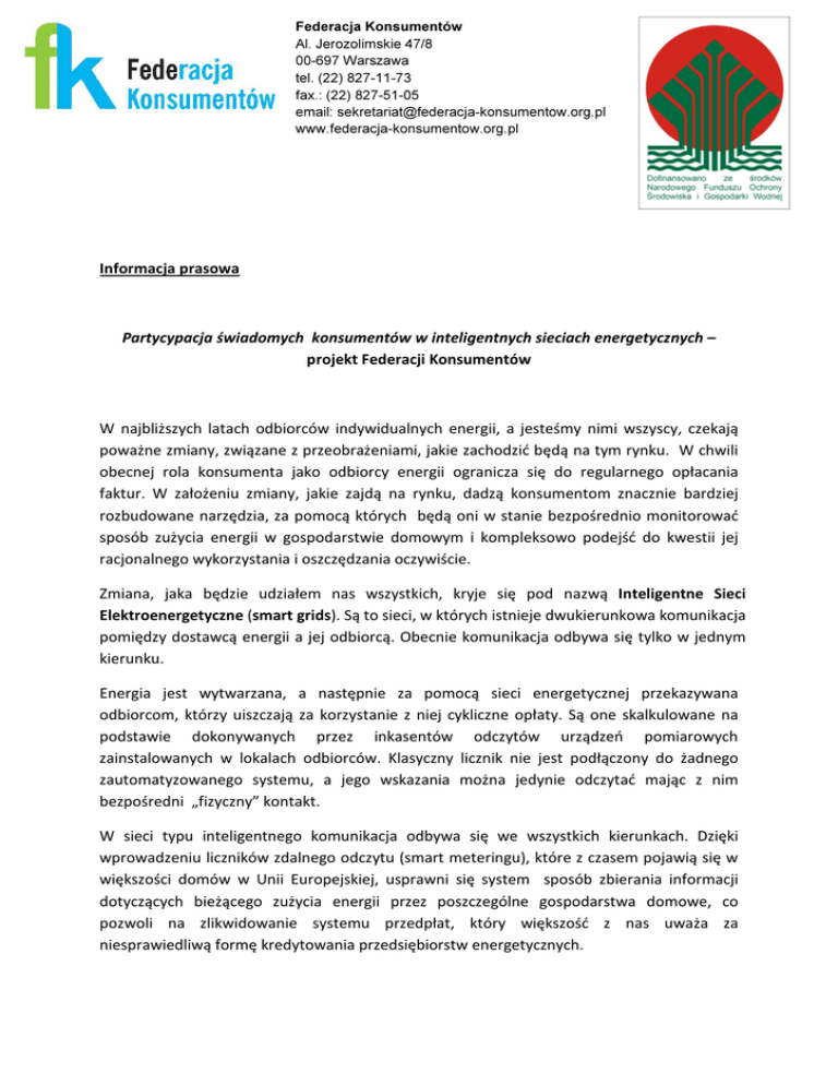 Federacja Konsumentów Al. Jerozolimskie 47/8 00-697 Warszawa tel. (22) 827-11-73 fax.: (22) 827-51-05 email: [email protected] www.federacja-konsumentow.org.pl Informacja prasowa Partycypacja świadomych konsumentów w inteligentnych sieciach energetycznych – projekt Federacji Konsumentów W najbliższych latach odbiorców indywidualnych energii, a jesteśmy nimi wszyscy, czekają poważne zmiany, związane z przeobrażeniami, jakie zachodzić będą na tym rynku. W chwili obecnej rola konsumenta jako odbiorcy energii ogranicza się do regularnego opłacania faktur. W założeniu zmiany, jakie zajdą na rynku, dadzą konsumentom znacznie bardziej rozbudowane narzędzia, za pomocą których będą oni w stanie bezpośrednio monitorować sposób zużycia energii w gospodarstwie domowym i kompleksowo podejść do kwestii jej racjonalnego wykorzystania i oszczędzania oczywiście. Zmiana, jaka będzie udziałem nas wszystkich, kryje się pod nazwą Inteligentne Sieci Elektroenergetyczne (smart grids). Są to sieci, w których istnieje dwukierunkowa komunikacja pomiędzy dostawcą energii a jej odbiorcą. Obecnie komunikacja odbywa się tylko w jednym kierunku. Energia jest wytwarzana, a następnie za pomocą sieci energetycznej przekazywana odbiorcom, którzy uiszczają za korzystanie z niej cykliczne opłaty. Są one skalkulowane na podstawie dokonywanych przez inkasentów odczytów urządzeń pomiarowych zainstalowanych w lokalach odbiorców. Klasyczny licznik nie jest podłączony do żadnego zautomatyzowanego systemu, a jego wskazania można jedynie odczytać mając z nim bezpośredni „fizyczny” kontakt. W sieci typu inteligentnego komunikacja odbywa się we wszystkich kierunkach. Dzięki wprowadzeniu liczników zdalnego odczytu (smart meteringu), które z czasem pojawią się w większości domów w Unii Europejskiej, usprawni się system sposób zbierania informacji dotyczących bieżącego zużycia energii przez poszczególne gospodarstwa domowe, co pozwoli na zlikwidowanie systemu przedpłat, który większość z nas uważa za niesprawiedliwą formę kredytowania przedsiębiorstw energetycznych. Poza zautomatyzowaniem odczytu zużycia energii inteligentna sieć będzie w stanie dużo szybciej niż w chwili obecnej wykrywać awarie i przerwy w dostawach energii. Pojawią się nowe możliwości w zakresie mikroprodukcji energii odnawialnej w warunkach gospodarstwa domowego. Docelowo zmianie ulec ma system taryf, co może przyczynić się do oszczędności. Z drugiej strony, aby włączyć się w działanie nowego systemu, konieczna będzie wymiana licznika energii elektrycznej. Nowy licznik będzie na bieżąco odczytywał i przesyłał dane do przedsiębiorstwa, stąd pojawiają się obawy o zachowanie prywatności i ochronę danych osobowych. Zmiany kosztują. Już w tej chwili konsumenci zastanawiają się, kto za ten nowy system zapłaci? Federacja Konsumentów od dłuższego czasu z uwagą obserwuje i aktywnie uczestniczy w różnych inicjatywach związanych z wprowadzeniem nowego systemu nie tylko w Polsce, ale także w Europie. Z doświadczeń naszych oraz partnerów europejskich wynika, że z reguły przy okazji wprowadzania zmian na rynku energetycznym konsumenci nie otrzymują wystarczającej ilości informacji, przez co nie są na nie przygotowani i częstokroć zamiast na nich zyskać - tracą. Bazując na doświadczeniach przedstawicieli innych krajów, należy stwierdzić, że w przygotowaniach do wprowadzeniach systemu od samego początku popełniany był ten sam błąd. Brak lub niedostateczna kampania mająca poinformować konsumentów o zmieniających się zasadach rządzących rynkiem energii elektrycznej. Prowadziło to i w dalszym ciągu prowadzi do bardzo wielu problemów oraz jest bezpośrednim czynnikiem wpływającym na to, że odbiorcy końcowi padają ofiarą nieuczciwych praktyk rynkowych, jak również czynów niedozwolonych. Aby temu przeciwdziałać, od kwietnia 2013r. Federacja Konsumentów przy wsparciu Narodowego Funduszu Ochrony Środowiska i Gospodarki Wodnej realizuje projekt pt. Partycypacja świadomych konsumentów w inteligentnych sieciach energetycznych. Projekt objęty został patronatem Prezesa Urzędu Regulacji Energetyki, partnerem merytorycznym jest Energa S.A. Głównym celem, jaki postawiliśmy sobie w związku z realizacją projektu, jest zwiększenie poziomu świadomości społecznej i ekologicznej konsumentów w zakresie wprowadzenia w Polsce Inteligentnych Sieci Energetycznych. W ramach projektu planowane są liczne działania, których celem jest przybliżenie kwestii nadchodzących zmian polskim konsumentom. Jako pierwszy zrealizowany został moduł szkoleń pt. „Korzyści dla odbiorców z innowacyjnych rozwiązań w systemie energetycznym”. W jego ramach przeszkoliliśmy doradców konsumentów, którzy udzielają konsumentom bezpłatnych porad w oddziałach Federacji Konsumentów na terenie całego kraju, by wyposażeni w wiedzę i umiejętności związane z Inteligentnymi Sieciami Energetycznymi edukowali konsumentów i rozwiewali ich wątpliwości związane ze zmianami. Ogłosiliśmy również konkurs z atrakcyjnymi nagrodami dla osób aktywnie zaangażowanych w system odnawialnych źródeł energii i pozyskujących energię z tych źródeł w ramach mikroinstalacji oraz małych instalacji dla potrzeb przynajmniej swojego gospodarstwa domowego. Aby wziąć w nim udział, do czego gorąco zachęcamy, należy, korzystając z przygotowanego formularza konkursowego opisać w formie krótkiego opowiadania swoje doświadczenia z wykorzystaniem energii ze źródeł odnawialnych. Autorzy najciekawszych krótkich opowiadań zostaną nagrodzeni, a ich przykład posłuży do promowania tego sposobu pozyskiwania energii na poziomie gospodarstwa domowego. Informacje dotyczące konkursu, formularz zgłoszeniowy oraz regulamin dostępne są na stronie internetowej http://www.federacja-konsumentow.org.pl W następnej kolejności plan