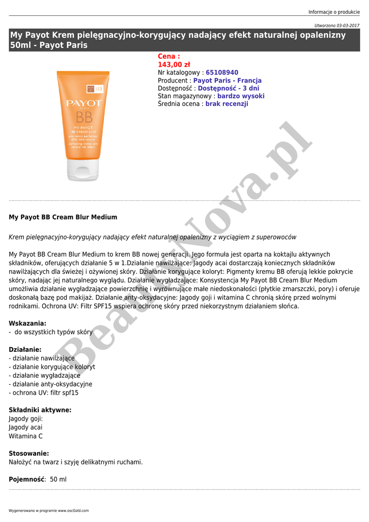 Informacje o produkcie Utworzono 03-03-2017 My Payot Krem pielęgnacyjno-korygujący nadający efekt naturalnej opalenizny 50ml - Payot Paris Cena : 143,00 zł ov a. pl Nr katalogowy : 65108940 Producent : Payot Paris - Francja Dostępność : Dostępność - 3 dni Stan magazynowy : bardzo wysoki Średnia ocena : brak recenzji My Payot BB Cream Blur Medium yN Krem pielęgnacyjno-korygujący nadający efekt naturalnej opalenizny z wyciągiem z superowoców ea ut My Payot BB Cream Blur Medium to krem BB nowej generacji. Jego formuła jest oparta na koktajlu aktywnych składników, oferujących działanie 5 w 1.Działanie nawilżające: Jagody acai dostarczają koniecznych składników nawilżających dla świeżej i ożywionej skóry. Działanie korygujące koloryt: Pigmenty kremu BB oferują lekkie pokrycie skóry, nadając jej naturalnego wyglądu. Działanie wygładzające: Konsystencja My Payot BB Cream Blur Medium umożliwia działanie wygładzające powierzchnię i wyrównujące małe niedoskonałości (płytkie zmarszczki, pory) i oferuje doskonałą bazę pod makijaż. Działanie anty-oksydacyjne: Jagody goji i witamina C chronią skórę przed wolnymi rodnikami. Ochrona UV: Filtr SPF15 wspiera ochronę skóry przed niekorzystnym działaniem słońca. Wskazania: - do wszystkich typów skóry B Działanie: - działanie nawilżające - działanie korygujące koloryt - działanie wygładzające - działanie anty-oksydacyjne - ochrona UV: filtr spf15 Składniki aktywne: Jagody goji: Jagody acai Witamina C Stosowanie: Nałożyć na twarz i szyję delikatnymi ruchami. Pojemność: 50 ml Wygenerowano w programie www.oscGold.com