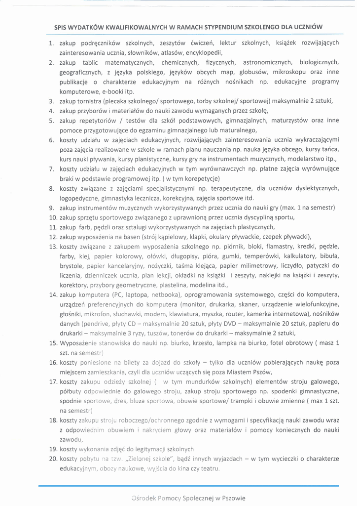 SPIS WYDATKÓW KWALlFIKOWALNYCH W RAMACH STYPENDIUM SZKOLENGO DLA UCZNIÓW 1. zakup podręczników szkolnych, zeszytów ćwiczeń, lektur szkolnych, książek rozwijających zainteresowania ucznia, słowników, atlasów, encyklopedii, 2. zakup tablic matematycznych, chemicznych, fizycznych, astronomicznych, biologicznych, geograficznych, z języka polskiego, języków obcych map, globusów, mikroskopu oraz inne publikacje różnych edukacyjne programy o charakterze edukacyjnym na nośnikach np. komputerowe, e-booki itp. 3. zakup tornistra (plecaka szkolnego/ sportowego, torby szkolnej/ sportowej) maksymalnie 2 sztuki, 4. zakup przyborów i materiałów do nauki zawodu wymaganych przez szkołę, S. zakup repetytoriów / testów dla szkół podstawowych, gimnazjalnych, maturzystów oraz inne pomoce przygotowujące do egzaminu gimnazjalnego lub maturalnego, 6. koszty udziału w zajęciach edukacyjnych, rozwijających zainteresowania ucznia wykraczającymi poza zajęcia realizowane w szkole w ramach planu nauczania np. nauka języka obcego, kursy tańca, kurs nauki pływania, kursy planistyczne, kursy gry na instrumentach muzycznych, modelarstwo itp., 7. koszty udziału w zajęciach edukacyjnych w tym wyrównawczych np. płatne zajęcia wyrównujące braki w podstawie programowej itp. ( w tym korepetycje) 8. koszty związane z zajęciami specjalistycznymi np. terapeutyczne, dla uczniów dyslektycznych, logopedyczne, gimnastyka lecznicza, korekcyjna, zajęcia sportowe itd. 9. zakup instrumentów muzycznych wykorzystywanych przez ucznia do nauki gry (max. 1 na semestr) 10. zakup sprzętu sportowego związanego z uprawnioną przez ucznia dyscypliną sportu, 11. zakup farb, pędzli oraz sztalugi wykorzystywanych na zajęciach plastycznych, 12. zakup wyposażenia na basen (strój kąpielowy, klapki, okulary pływackie, czepek pływacki), 13. koszty związane z zakupem wyposażenia szkolnego np. piórnik, bloki, flamastry, kredki, pędzle, farby, klej, papier kolorowy, ołówki, długopisy, pióra, gumki, temperówki, kalkulatory, bibuła, brystole, papier kancelaryjny, nożyczki, taśma klejąca, papier milimetrowy, liczydło, patyczki do liczenia, dzienniczek ucznia, plan lekcji, okładki na książki i zeszyty, naklejki na książki i zeszyty, korektory, przybory geometryczne, plastelina, modelina itd., 14. zakup komputera (PC, laptopa, netbooka), oprogramowania systemowego, części do komputera, urządzeń preferencyjnych do komputera (monitor, drukarka, skaner, urządzenie wielofunkcyjne, głośniki, mikrofon, słuchawki, modem, klawiatura, myszka, router, kamerka internetowa), nośników danych (pendrive, płyty CD - maksymalnie 20 sztuk, płyty DVD - maksymalnie 20 sztuk, papieru do drukarki - maksymalnie 3 ryzy, tuszów, tonerów do drukarki - maksymalnie 2 sztuki, 15. Wyposażenie stanowiska do nauki np. biurko, krzesło, lampka na biurko, fotel obrotowy ( masz 1 szt. na semestr) 16. koszty poniesione na bilety za dojazd do szkoły - tylko dla uczniów pobierających naukę poza miejscem zamieszkania, czyli dla uczniów uczących się poza Miastem Pszów, 17. koszty zakupu odzieży szkolnej ( w tym mundurków szkolnych) elementów stroju galowego, półbuty odpowiednie do galowego stroju, zakup stroju sportowego np. spodenki gimnastyczne, spodnie sportowe, dres, bluza sportowa, obuwie sportowej trampki i obuwie zmienne ( max 1 szt. na semestr) 18. koszty zakupu stroju roboczego/ochronnego z odpowiednim zgodnie z wymogami i specyfikacją nauki zawodu wraz obuwiem i nakryciem głowy oraz materiałów i pomocy koniecznych do nauki zawodu, 19. koszty wykonania zdjęć do legitymacji szkolnych 20. koszty pobytu 'la tzw. "Zielonej szkole", bądź innych wyjazdach - w tym wycieczki o charakterze edukacyjnym, obozy naukowe, wyjścia do kina czy teatru. Ośrodek Pomocy Społecznej w Pszowie ROZLICZENIE Refundacja kosztów dokumentów poniesionych przez ucznia na cele edukacyjne dokonuje się na podstawie zestawienia wraz z załącznikami, takimi jak: ~ faktur VAT, ~ imiennych rachunków, ~ imiennych biletów miesięcznych, ~ dowodów ~ wydatki związane ze zbiorowymi wyjazdami na wycieczkę szkolną, z wyjściami do kina, teatru itp. można udokumentować pisemnego wpłaty (w przypadku uczestnictwa zaświadczenie, umowa potwierdzająca na podstawie kosztu poniesionego Powyższe dokumenty uczestnictwo oraz koszty poniesionych opłat) oświadczenia wystawionego przez szkołę z określeniem powinny zawierać m. in.: nazwę wystawcy ~ datę wystawienia/ ~ numer dokumentu, ~ imię i nazwisko wnioskodawcy ~ pełną nazwę przedmiotu adnotację przymiotnika klubach, szkołach tańca - przez ucznia. ~ miały w zajęciach dodatkowych, sprzedaży podlegającego "szkolne" lub refundacji - istotne jest, by np. plecak, obuwie, "sportowe". w nazwie umieszczonej na fakturze/ W przypadku gdy rachunku, to na odwrocie sprzedawca umieszczając pieczęć, opi i czytelny podpis. Ośrodek zakupiony Pomocy Społecznej w Pszowie towar spodenki itp. nie może potwierdzić ma tego ten fakt