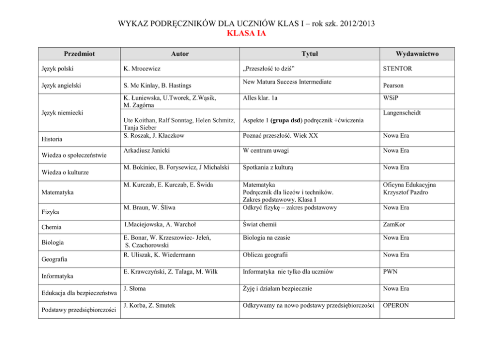 WYKAZ PODRĘCZNIKÓW DLA UCZNIÓW KLAS I – rok szk. 2012/2013 KLASA IA Przedmiot Tytuł Autor Język polski K. Mrocewicz Język angielski S. Mc Kinlay, B. Hastings „Przeszłość to dziś” New Matura Success Intermediate Wiedza o społeczeństwie Wiedza o kulturze Chemia Biologia Geografia Informatyka Edukacja dla bezpieczeństwa Podstawy przedsiębiorczości Pearson Alles klar. 1a Ute Koithan, Ralf Sonntag, Helen Schmitz, Tanja Sieber S. Roszak, J. Kłaczkow Aspekte 1 (grupa dsd) podręcznik +ćwiczenia Poznać przeszłość. Wiek XX Nowa Era Arkadiusz Janicki W centrum uwagi Nowa Era M. Bokiniec, B. Forysewicz, J Michalski Spotkania z kulturą Nowa Era M. Kurczab, E. Kurczab, E. Świda Oficyna Edukacyjna Krzysztof Pazdro M. Braun, W. Śliwa Matematyka Podręcznik dla liceów i techników. Zakres podstawowy. Klasa I Odkryć fizykę – zakres podstawowy I.Maciejowska, A. Warchoł Świat chemii ZamKor E. Bonar, W. Krzeszowiec- Jeleń, S. Czachorowski R. Uliszak, K. Wiedermann Biologia na czasie Nowa Era Oblicza geografii Nowa Era E. Krawczyński, Z. Talaga, M. Wilk Informatyka nie tylko dla uczniów PWN J. Słoma Żyję i działam bezpiecznie Nowa Era J. Korba, Z. Smutek Odkrywamy na nowo podstawy przedsiębiorczości OPERON WSiP Langenscheidt Matematyka Fizyka STENTOR K. Łuniewska, U.Tworek, Z.Wąsik, M. Zagórna Język niemiecki Historia Wydawnictwo Nowa Era WYKAZ PODRĘCZNIKÓW DLA UCZNIÓW KLAS I – rok szk. 2012/2013 KLASA IB Przedmiot Język polski K. Mrocewicz Język angielski S. Mc Kinlay, B. Hastings Język rosyjski Historia Wiedza o społeczeństwie Wiedza o kulturze Chemia Biologia Geografia Informatyka Edukacja dla bezpieczeństwa Podstawy przedsiębiorczości „Przeszłość to dziś” New Matura Success Intermediate Wydawnictwo STENTOR Pearson M. Wiatr –Kmieciak, S. Wujec Вот и мы PWN S. Roszak, J. Kłaczkow Poznać przeszłość. Wiek XX Nowa Era Arkadiusz Janicki W centrum uwagi Nowa Era M. Bokiniec, B. Forysewicz, J. Michalski Spotkania z kulturą Nowa Era M. Kurczab, E. Kurczab, E. Świda Oficyna Edukacyjna Krzysztof Pazdro M. Braun, W. Śliwa Matematyka Podręcznik dla liceów i techników. Zakres podstawowy. Klasa I Odkryć fizykę – zakres podstawowy I. Maciejowska, A. Warchoł Świat chemii ZamKor E. Bonar, W. Krzeszowiec- Jeleń, S. Czachorowski R. Uliszak, K. Wiedermann Biologia na czasie Nowa Era Oblicza geografii Nowa Era E. Krawczyński, Z. Talaga, M. Wilk Informatyka nie tylko dla uczniów PWN J. Słoma Żyję i działam bezpiecznie Nowa Era J. Korba, Z. Smutek Odkrywamy na nowo podstawy przedsiębiorczości OPERON Matematyka Fizyka Tytuł Autor Nowa Era WYKAZ PODRĘCZNIKÓW DLA UCZNIÓW KLAS I – rok szk. 2012/2013 KLASA IC Przedmiot Język polski K. Mrocewicz Język angielski S. Mc Kinlay, B. Hastings Język rosyjski Historia Wiedza o kulturze Wiedza o społeczeństwie Matematyka Fizyka Chemia Biologia Tytuł Autor „Przeszłość to dziś” New Matura Success Intermediate Wydawnictwo STENTOR Pearson M. Wiatr –Kmieciak, S. Wujec Вот и мы PWN S. Roszak, J. Kłaczkow Poznać przeszłość. Wiek XX Nowa Era M. Bokiniec, B. Forysewicz, J. Michalski Arkadiusz Janicki Spotkania z kulturą Nowa Era W centrum uwagi Nowa Era K. Kłaczkow, M. Kurczab, E. Świda M. Braun, W. Śliwa Matematyka Podręcznik dla liceów i techników. Zakres podstawowy i rozszerzony. Klasa I Odkryć fizykę – zakres podstawowy Oficyna Edukacyjna Krzysztof Pazdro Nowa Era I.Maciejowska, A. Warchoł Świat chemii ZamKor E. Bonar, W. Krzeszowiec- Jeleń, S. Czachorowski R. Uliszak, K. Wiedermann Biologia na czasie Nowa Era Oblicza geografii Nowa Era E. Krawczyński, Z. Talaga, M. Wilk Informatyka nie tylko dla uczniów PWN J. Słoma Żyję i działam bezpiecznie Nowa Era J. Korba, Z. Smutek Odkrywamy na nowo podstawy przedsiębiorczości OPERON Geografia Informatyka Edukacja dla bezpieczeństwa Podstawy przedsiębiorczości WYKAZ PODRĘCZNIKÓW DLA UCZNIÓW KLAS I – rok szk. 2012/2013 KLASA ID Przedmiot Język polski K. Mrocewicz Język angielski S. Mc Kinlay, B. Hastings Język francuski Wiedza o społeczeństwie Historia Wiedza o kulturze Chemia Biologia Geografia Informatyka Edukacja dla bezpieczeństwa Podstawy przedsiębiorczości „Przeszłość to dziś” New Matura Success Intermediate Wydawnictwo STENTOR Pearson R. Boutegege, M. Supryn-Klepcarz Francopholie express PWN Arkadiusz Janicki W centrum uwagi Nowa Era S. Roszak, J. Kłaczkow Poznać przeszłość. Wiek XX Nowa Era M. Bokiniec, B. Forysewicz, J. Michalski M. Kurczab, E. Kurczab, E. Świda Spotkania z kulturą Nowa Era Oficyna Edukacyjna Krzysztof Pazdro M. Braun, W. Śliwa Matematyka Podręcznik dla liceów i techników. Zakres podstawowy. Klasa I Odkryć fizykę – zakres podstawowy I. Maciejowska, A. Warchoł Świat chemii ZamKor E. Bonar, W. Krzeszowiec- Jeleń, S. Czachorowski R. Uliszak, K. Wiedermann Biologia na czasie Nowa Era Oblicza geografii Nowa Era E. Krawczyński, Z. Talaga, M .Wilk Informatyka nie tylko dla uczniów PWN J. Słoma Żyję i działam bezpiecznie Nowa Era J. Korba, Z. Smutek Odkrywamy na nowo podstawy przedsiębiorczości OPERON Matematyka Fizyka Tytuł Autor Nowa Era WYKAZ PODRĘCZNIKÓW DLA UCZNIÓW KLAS I – rok szk. 2012/2013 KLASA IE Przedmiot Język polski K .Mrocewicz Język angielski S. Mc Kinlay, B. Hastings Język francuski Historia Wiedza o społeczeństwie Wiedza o kulturze Chemia Biologia Geografia Informatyka Edukacja dla bezpieczeństwa Podstawy przedsiębiorczości „Przeszłość to dziś” New Matura Success Intermediate Wydawnictwo STENTOR Pearson R. Boutegege, M. Supryn-Klepcarz Francopholie express PWN S. Roszak, J. Kłaczkow Poznać przeszłość. Wiek XX Nowa Era Arkadiusz Janicki W centrum uwagi Nowa Era M. Bokiniec, B. Forysewicz, J. Michalski M. Kurczab, E. Kurczab, E. Świda Spotkania z kulturą Nowa Era Oficyna Edukacyjna Krzysztof Pazdro M. Braun, W. Śliwa Matematyka Podręcznik dla liceów i techników. Zakres podstawowy. Klasa 