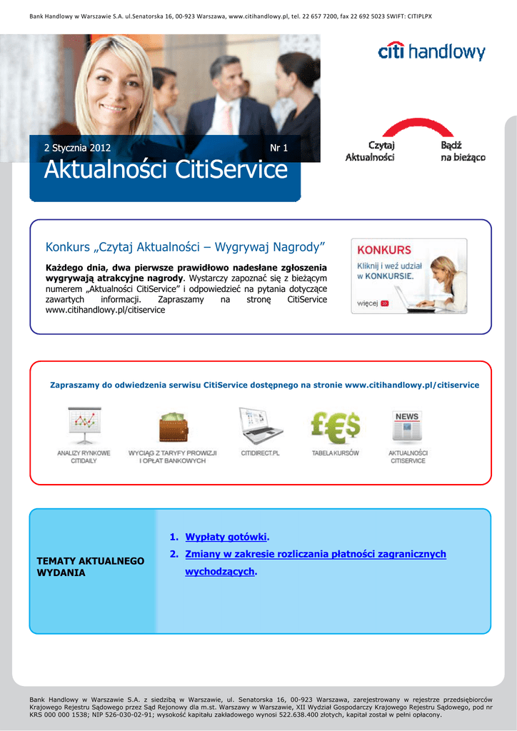 Bank Handlowy w Warszawie S.A. ul.Senatorska 16, 00‐923 Warszawa, www.citihandlowy.pl, tel. 22 657 7200, fax 22 692 5023 SWIFT: CITIPLPX 2 Stycznia 2012 Nr 1 Aktualności CitiService Konkurs „Czytaj Aktualności – Wygrywaj Nagrody” Każdego dnia, dwa pierwsze prawidłowo nadesłane zgłoszenia wygrywają atrakcyjne nagrody. Wystarczy zapoznać się z bieżącym numerem „Aktualności CitiService” i odpowiedzieć na pytania dotyczące CitiService zawartych informacji. Zapraszamy na stronę www.citihandlowy.pl/citiservice Zapraszamy do odwiedzenia serwisu CitiService dostępnego na stronie www.citihandlowy.pl/citiservice 1. Wypłaty gotówki. TEMATY AKTUALNEGO WYDANIA 2. Zmiany w zakresie rozliczania płatności zagranicznych wychodzących. Bank Handlowy w Warszawie S.A. z siedzibą w Warszawie, ul. Senatorska 16, 00-923 Warszawa, zarejestrowany w rejestrze przedsiębiorców Krajowego Rejestru Sądowego przez Sąd Rejonowy dla m.st. Warszawy w Warszawie, XII Wydział Gospodarczy Krajowego Rejestru Sądowego, pod nr KRS 000 000 1538; NIP 526-030-02-91; wysokość kapitału zakładowego wynosi 522.638.400 złotych, kapitał został w pełni opłacony. Bank Handlowy w Warszawie S.A. ul.Senatorska 16, 00‐923 Warszawa, www.citihandlowy.pl, tel. 22 657 7200, fax 22 692 5023 SWIFT: CITIPLPX WYPŁATY GOTÓWKI Informujemy, że w przypadku wypłaty gotówki przekraczającej równowartość 50 000 PLN, wskazane jest zgłoszenie przez Państwa takiej informacji do Banku na dwa dni robocze przed planowanym dokonaniem operacji, najpóźniej do godziny 15.00. Zgłoszenia mogą Państwo dokonać u Doradcy CitiService lub w oddziale banku, w którym planowana jest wypłata. W przypadku nie dokonania powyższego zgłoszenia Oddział ma prawo odmówić Klientowi dokonania wypłaty gotówki. POWRÓT DO LISTY TEMATÓW AKTUALNOŚCI CITISERVICE ZMIANY W ZAKRESIE ROZLICZANIA PŁATNOŚCI ZAGRANICZNYCH WYCHODZĄCYCH Pragniemy poinformować, że od 1 stycznia 2012 r. wprowadzone zostaną zmiany w zakresie rozliczania płatności zagranicznych wychodzących realizowanych w walutach państw krajów UE i EOG - (Euro (EUR), Frank szwajcarski (CHF), Funt brytyjski (GBP), Forint węgierski (HUF), Lew bułgarski (BGN), Korona duńska (DKK), Korona islandzka (ISK), Lit litewski (LTL), Łat łotewski (LVL), Korona norweska (NOK), Złoty polski (PLN), Lej rumuński (RON), Korona szwedzka (SEK), Korona czeska (CZK). Wszystkie płatności w walutach krajów UE i EOG, które do tej pory były realizowane z datą waluty d+2 będą realizowane z datą waluty d+1 bez dodatkowych opłat dla Klientów. Zmiana nie dotyczy Klientów, którzy już mają realizowane płatności zagraniczne z data waluty d+1 lub d+0. Zmiana wynika z implementacji przepisów Ustawy z dnia 19 sierpnia 2011r. o Usługach Płatniczych (Dz.U. z 2011r. Nr 199 poz. 1175). POWRÓT DO LISTY TEMATÓW AKTUALNOŚCI CITISERVICE Bank Handlowy w Warszawie S.A. z siedzibą w Warszawie, ul. Senatorska 16, 00-923 Warszawa, zarejestrowany w rejestrze przedsiębiorców Krajowego Rejestru Sądowego przez Sąd Rejonowy dla m.st. Warszawy w Warszawie, XII Wydział Gospodarczy Krajowego Rejestru Sądowego, pod nr KRS 000 000 1538; NIP 526-030-02-91; wysokość kapitału zakładowego wynosi 522.638.400 złotych, kapitał został w pełni opłacony.