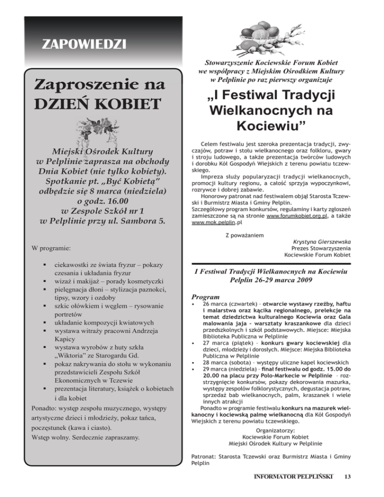 ZAPOWIEDZI Stowarzyszenie Kociewskie Forum Kobiet we współpracy z Miejskim Ośrodkiem Kultury w Pelplinie po raz pierwszy organizuje Zaproszenie na DZIEŃ KOBIET Miejski Ośrodek Kultury w Pelplinie zaprasza na obchody Dnia Kobiet (nie tylko kobiety). Spotkanie pt. „Być Kobietą” odbędzie się 8 marca (niedziela) o godz. 16.00 w Zespole Szkół nr 1 w Pelplinie przy ul. Sambora 5. „I Festiwal Tradycji Wielkanocnych na Kociewiu” Celem festiwalu jest szeroka prezentacja tradycji, zwyczajów, potraw i stołu wielkanocnego oraz folkloru, gwary i stroju ludowego, a także prezentacja twórców ludowych i dorobku Kół Gospodyń Wiejskich z terenu powiatu tczewskiego. Impreza służy popularyzacji tradycji wielkanocnych, promocji kultury regionu, a całość sprzyja wypoczynkowi, rozrywce i dobrej zabawie. Honorowy patronat nad festiwalem objął Starosta Tczewski i Burmistrz Miasta i Gminy Pelplin. Szczegółowy program konkursów, regulaminy i karty zgłoszeń zamieszczone są na stronie www.forumkobiet.org.pl, a także www.mok.pelplin.pl Z poważaniem W programie: ciekawostkizeświatafryzur–pokazy czesaniaiukładaniafryzur wizażimakijaż–poradykosmetyczki pielęgnacjadłoni–stylizacjapaznokci, tipsy,wzoryiozdoby szkicołówkiemiwęglem–rysowanie portretów układaniekompozycjikwiatowych wystawawitrażypracowniAndrzeja Kapicy wystawawyrobówzhutyszkła „Wiktoria” ze Starogardu Gd. pokaznakrywaniadostołuwwykonaniu przedstawicieliZespołuSzkół Ekonomicznych w Tczewie prezentacjaliteratury,książekokobietach i dla kobiet Ponadto:występzespołumuzycznego,występy artystycznedzieciimłodzieży,pokaztańca, poczęstunek(kawaiciasto). Wstępwolny.Serdeczniezapraszamy. Krystyna Gierszewska Prezes Stowarzyszenia Kociewskie Forum Kobiet I Festiwal Tradycji Wielkanocnych na Kociewiu Pelplin 26-29 marca 2009 Program 26 marca (czwartek) – otwarcie wystawy rzeźby, haftu i malarstwa oraz kącika regionalnego, prelekcje na temat dziedzictwa kulturalnego Kociewia oraz Gala malowania jaja – warsztaty kraszankowe dla dzieci przedszkolnych i szkół podstawowych. Miejsce: Miejska Biblioteka Publiczna w Pelplinie • 27 marca (piątek) – konkurs gwary kociewskiej dla dzieci, młodzieży i dorosłych. Miejsce: Miejska Biblioteka Publiczna w Pelplinie • 28 marca (sobota) – występy uliczne kapel kociewskich • 29 marca (niedziela) – finał festiwalu od godz. 15.00 do 20.00 na placu przy Polo-Markecie w Pelplinie – rozstrzygnięcie konkursów, pokazy dekorowania mazurka, występy zespołów folklorystycznych, degustacja potraw, sprzedaż bab wielkanocnych, palm, kraszanek i wiele innych atrakcji Ponadto w programie festiwalu konkurs na mazurek wielkanocny i kociewską palmę wielkanocną dla Kół Gospodyń Wiejskich z terenu powiatu tczewskiego. • Organizatorzy: Kociewskie Forum Kobiet Miejski Ośrodek Kultury w Pelplinie Patronat: Starosta Tczewski oraz Burmistrz Miasta i Gminy Pelplin INFORMATOR PELPLIŃSKI 13