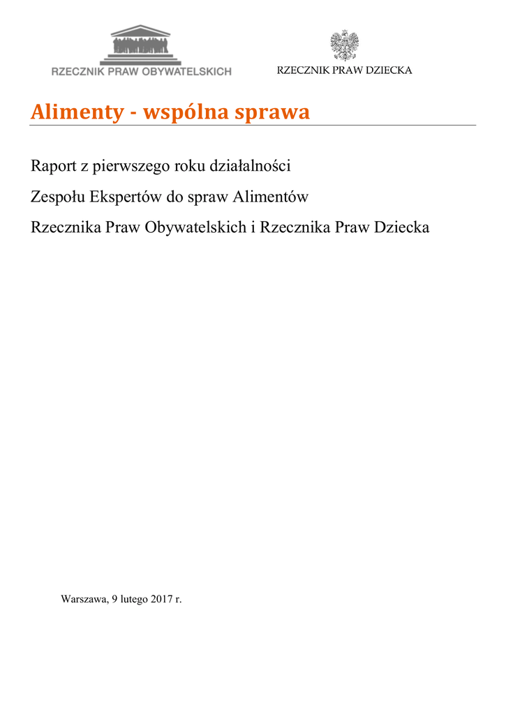 Alimenty - wspólna sprawa Raport z pierwszego roku działalności Zespołu Ekspertów do spraw Alimentów Rzecznika Praw Obywatelskich i Rzecznika Praw Dziecka Warszawa, 9 lutego 2017 r. Wstęp Niniejszy raport podsumowuje działania Zespołu Ekspertów do spraw Alimentów, powołanego wspólnie przez Rzecznika Praw Obywatelskich i Rzecznika Praw Dziecka w lutym 2016 r. Rzecznik Praw Dziecka stoi na straży praw dziecka. Rzecznik Praw Obywatelskich jest ustawowo zobowiązany zarówno do ochrony praw jednostki, jak i stoi na straży realizacji zasady równego traktowania. W prace Zespołu zaangażowani są eksperci z różnych dziedzin: adwokaci, sędziowie, komornicy, przedstawiciele organizacji pozarządowych, organizacji pracodawców, świata nauki i środowiska penitencjarnego1. Dzięki doświadczeniu ekspertów, Rzecznicy w ciągu ostatniego roku zwracali się do instytucji państwowych z propozycjami zmian, które mają służyć poprawie sytuacji w zakresie niealimentacji dzieci. Napływające do Zespołu odpowiedzi to dodatkowe źródło informacji. Wszystko to dostępne jest pod adresem www.rpo.gov.pl/pl/sprawa/sprawy-alimentow. Zespół wypracował kilkadziesiąt projektów i propozycji (już wdrażanych albo analizowanych). 1 Skład Zespołu: www.rpo.gov.pl/pl/content/zespołu-ekspertów-ds-alimentów. 2 I. Fakty Obowiązek alimentacyjny. Art. 133 § 1 Kodeksu rodzinnego i opiekuńczego Milion dzieci w Polsce nie otrzymuje alimentów. To niemal co dziesiąte dziecko i młoda osoba do 25. roku życia. W grupie do 18 lat pokrzywdzonych jest jeszcze więcej – 14%2. Zadłużenie rodziców wobec dzieci przekracza 10 mld zł. Niepłacących rodziców jest kilkaset tysięcy. W 96% to ojcowie. Średnie zadłużenie dłużnika alimentacyjnego wynosi 33 tys. zł3. W ciągu ostatnich sześciu miesięcy zadłużenie rodziców wpisanych do Krajowego Rejestru Długów Biura Informacji Gospodarczej Spółka Akcyjna wzrosło o 860 mln zł4. W każdym z województw: mazowieckim, śląskim i dolnośląskim, niespłacany dług rodziców wobec dzieci przekroczył miliard złotych w województwie. Egzekucja komornicza – jeżeli alimenty nie są płacone dobrowolnie, opiekun dziecka może wystąpić o egzekucję alimentów przez komornika. Skuteczność egzekucji w sprawach o alimenty szacuje się na 19,5% (stosunek spraw zakończonych wyegzekwowaniem długu alimentacyjnego do liczby wszystkich zakończonych spraw) 5 . Średnia skuteczność komorniczej egzekucji we wszystkich sprawach wynosi 30%. Fundusz Alimentacyjny to pomoc państwa dla nieotrzymujących alimentów dzieci – ale tylko w rodzinach, gdzie dochód na osobę nie przekracza 725 zł. Takie kryterium dochodowe określono w 2007 r. i od tamtej pory nie było ono waloryzowane, mimo że minimalne wynagrodzenie wzrosło ponad dwukrotnie, a w 2017 r. wynosi 2000 zł). Fundusz Alimentacyjny wypłaca alimenty w wysokości ok. 1,5 mld zł rocznie. Obsługa FA kosztuje 200 mln zł rocznie6. Fundusz pomaga ok. 300 tys. dzieci, bo reszta przekracza kryterium dochodowe. W 2015 r. dłużnicy alimentacyjni zwrócili ok. 192 mln zł z tytułu wypłaconych świadczeń z FA, z tego ok. 118 mln zł przekazano na dochody budżetu państwa, zaś pozostałe ok. 74 mln zł zostało przekazanych na dochody własne gmin. W relacji do kwoty wypłaconych w 2015 r. świadczeń z FA, kwota zwrotów stanowiła 12,9%7 (13,9% w 2014 r.). Pomoc z FA nie może przekroczyć 500 zł na dziecko (ale nie więcej niż kwota zasądzonych alimentów). Przestępstwo niealimentacji - art. 209 Kodeksu karnego. 2 A. Chełstowska, Alimenty na dzieci – diagnoza polskiego systemu i przegląd praktyk zagranicznych, s. 13. Dane Krajowego Rejestr Długów ze stycznia 2017 r. i Dane BIG InfoMonitor. 4 https://zgloszenie.krd.pl. 5 A. Chełstowska, op cit., s. 19. 6 Dane z BIG InfoMonitor: Alimenty – polski wstyd, Warszawa 2016, s. 5. 7 Informacja o realizacji ustawy o pomocy osobom uprawnionym do alimentów w 2015 r., MRPiPS, czerwiec 2016. 3 3 W 2015 roku do prokuratury wpłynęło ponad 50 tys. spraw z art. 209 k.k. Prokuratura wniosła 11 tys. aktów oskarżenia. Umorzyła 9891 spraw i odmówiła wszczęcia postępowania w 19 044 sprawach8. Pod koniec 2016 r. w więzieniach przebywało 2714 skazanych za przestępstwo niealimentacji. Wszystkich skazanych (także za inne przestępstwa), którzy mieli zobowiązania alimentacyjne, przebywało w więzieniach 12 047. Jedynie 29% osadzonych ze zobowiązaniami alimentacyjnymi pracowało w zakładach karnych. Postawy społeczne: 23% ankietowanych usprawiedliwia częstą zmianę rachunków bankowych, aby uniknąć zajęcia pieniędzy przez komornika; 28% nie miałoby skrupułów, przepisując majątek na rodzinę, by uciec przed wierzycielem; 37% mogłoby wytłumaczyć pracę na czarno, aby uniknąć ściągania długów z pensji9. 8 A. Chełstowska, op cit., s. 25. BIG, Badanie przeprowadzone przez Pactor metodą CATI, na ogólnopolskiej reprezentatywnej 1000-osobowej próbie Polaków w wieku powyżej 18 lat, w lutym 2016 r. 9 4 II. Alimenty – od zasądzenia do (nie)płacenia i egzekucji należności wobec dziecka Art. 133 § 1 Kodeksu rodzinnego i opiekuńczego stanowi: „rodzice obowiązani są do świadczeń alimentacyjnych względem dziecka, które nie jest jeszcze w stanie utrzymać się samodzielnie, chyba że dochody z majątku dziecka wystarczają na pokrycie kosztów jego utrzymania i wychowania”. W przypadku, gdy rodzice dziecka nie mogą się porozumieć, wysokość alimentów określa sąd (ich wysokość może zostać także ustalona w drodze ugody sądowej). W Polsce nie obowiązują tzw. tabele alimentacyjne. Sąd wyznacza alimenty na podstawie swojej wiedzy i doświadczenia, szacując potrzeby dziecka oraz możliwości zarobkowe zobowiązanego do alimentów rodzica. Jeżeli rodzic nie płaci alimentów, albo jeżeli nie płaci w całości, opiekun dziecka może złożyć wniosek o egzekucję alimentów przez kom