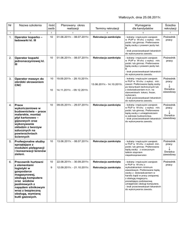 Wałbrzych, dnia 25.08.2011r. Nr 1 Nazwa szkolenia 2 ilość osób Planowany okres realizacji Terminy rekrutacji Wymagania dla kandydatów Ścieżka rekrutacji 3 4 5 6 7 1. Operator koparko – ładowarki kl. III 10 01.06.2011r. - 08.07.2011r. Rekrutacja zamknięta - kobiety i mężczyźni zarejestr. w PUP w W-chu z wyksz. min. podst. lub gimnaz. Preferowane będą osoby z prawem jazdy kat. B - brak przeciwwskazań lekarskich do wykonywania zawodu. Pośrednik pracy 2. Operator koparki jednonaczyniowej kl. III 10 01.06.2011r. - 08.07.2011r. Rekrutacja zamknięta - kobiety i mężczyźni zarejestr. w PUP w W-chu z wyksz. min. podst. lub gimnaz. Preferowane będą osoby z prawem jazdy kat. B - brak przeciwwskazań lekarskich do wykonywania zawodu. Pośrednik pracy 3. Operator maszyn do obróbki skrawaniem CNC 10 19.09.2011r. - 28.10.2011r. 4. 5. 6. 13.06.2011r.- 14.10.2011r. 10 14.11.2011r. - 09.12.2011r. Prace wykończeniowe w budownictwie – prace malarskie, montaż płyt kartonowo – gipsowych oraz wykonywanie okładzin z tworzyw sztucznych na powierzchniach ściennych 10 09.05.2011r. - 29.07.2011r. Profesjonalne służby sprzątające z modułem pielęgnacji i konserwacji terenów zieleni. 10 Pracownik hurtowni z elementami logistyki w gospodarce magazynowej, obsługą komputera oraz wózków jezdniowych z napędem silnikowym wraz z bezpieczną obsługą, wymianą butli gazowych. 10 22.08.2011r. - 30.09.2011r. Rekrutacja zamknięta 9 12.09.2011r. - 21.10.2011r. Rekrutacja zamknięta. Rekrutacja zamknięta - kobiety i mężczyźni zarejestr. Pośrednik w PUP w W-chu z wyksz. min. pracy zawod. Preferowane będą osoby po kierunkach technicznych lub Doradca z doświadczeniem m.in. na zawodowy stanowiskach: tokarz, frezer, wytaczarz, - brak przeciwwskazań lekarskich do wykonywania zawodu. ↓ - kobiety i mężczyźni zarejestr. Pośrednik w PUP w W-chu z wyksz. min. pracy podst. lub gimnaz. Preferowane będą osoby z umiejętnościami Doradca w zakresie budownictwa. - brak przeciwwskazań lekarskich zawodowy do wykonywania zawodu. ↓ 13.06.2011r. - 08.07.2011r. Rekrutacja zamknięta - kobiety i mężczyźni zarejestr. w PUP w W-chu z wykszt. min. podst. lub gimnaz. Preferowane będą osoby z orzeczonym lekkim stopniem niepełnosprawności. - kobiety i mężczyźni zarejestr. w PUP w W-chu z wykształceniem minimum zawodowym. Preferowane będą osoby z doświadczeniem w handlu bądź w pracy związanej z obsługą magazynu, posiadające podstawową umiejętność obsługi komputera. - brak przeciwwskazań lekarskich do wykonywania zawodu. Pośrednik pracy ↓ Doradca zawodowy Pośrednik pracy Nr ilość osób Planowany okres realizacji Terminy rekrutacji Kierowca wózków jezdniowych z napędem silnikowym wraz z bezpieczną obsługą, wymianą butli gazowych. 9 18.07.2011r. - 29.07.2011r. Rekrutacja zamknięta Pośrednik pracy 9 01.08.2011r. - 12.08.2011r. 9 14.11.2011r. - 25.11.2011r. Szkolenie okresowe w zakresie prawa jazdy kat. „C” 10 20.06.2011r. - 30.06.2011r. Rekrutacja zamknięta Pośrednik pracy 10 03.10.2011r. - 12.10.2011r. 10 03.10.2011r. - 12.10.2011r. Kurs spawania blach i rur spoinami pachwinowymi metodą MAG 10 24.10.2011r. - 09.12.2011r. 01.09.2011r. - 30.09.2011r. - kobiety i mężczyźni zarejestr. 10. Podstawy obsługi komputera z obsługą kas fiskalnych oraz elementami telemarketingu 20 11. Elektryk bez ograniczenia napięcia 10 12. Handlowiec doskonały z podstawami obsługi komputera, fakturowaniem oraz obsługą kas fiskalnych i terminali kart płatniczych 10 13. Szkolenie z zakresu aktywnego poszukiwania pracy 12 04.04.2011r. - 22.04.2011r. KP – Wałbrzych Rekrutacja zamknięta 12 09.05.2011r. - 27.05.2011r. KP – Wałbrzych Rekrutacja zamknięta 16 03.10.2011r. - 21.10.2011r. KP- Jedlina Zdrój 12 10.10.2011r. - 28.10.2011r. KP – Wałbrzych 12 07.11.2011r. - 25.11.2011r. KP – Wałbrzych 12 21.11.2011r. - 09.12.2011r. KP – Wałbrzych 7. 8. 9. Nazwa szkolenia Wymagania dla kandydatów - kobiety i mężczyźni zarejestr. w PUP w W-chu z wyksz. podstawowym lub gimnazjalnym Rekrutacja zamknięta i zawodowym. 05.09.2011r. - 16.09.2011r. - brak przeciwwskazań lekarskich do wykonywania zawodu. - kobiety i mężczyźni zarejestr. w PUP w W-chu z wyksz. min. podst. lub gimnaz. posiadające 01.08.2011r. - 09.09.2011r. prawo jazdy kat. C wydane przed 10 września 2009r. - brak przeciwwskazań lekarskich do wykonywania zawodu. w PUP w W-chu z wyksz. min. podst. lub gimnaz. - brak przeciwwskazań lekarskich do wykonywania zawodu. 06.06.2011r. - 08.07.2011r. Rekrutacja zamknięta Ścieżka rekrutacji Pośrednik pracy - kobiety i mężczyźni zarejestr. w Pośrednik PUP w W-chu z pracy wykształceniem minimum podstawowym lub gimnazjalnym, Doradca posiadających predyspozycje do zawodowy pracy z klientem. - brak przeciwwskazań lekarskich do wykonywania zawodu. ↓ 10.10.2011r. - 28.10.2011r. 16.08.2011r.- 09.09.2011r. - kobiety i mężczyźni zarejestr. w Pośrednik PUP w W-chu z pracy wykształceniem minimum zawodowym. Preferowane będą osoby z wykształceniem kierunkowym: elektryk, elektromonter, elektromechanik lub udokumentowanym doświadczeniem w w/w obszarach, - brak przeciwwskazań lekarskich do wykonywania zawodu. 19.09.2011r. - 28.10.2011r. 18.07.2011r. - 19.08.2011r. - kobiety i mężczyźni zarejestr. w Pośrednik PUP w W-chu z pracy wykształceniem minimum średnim, - brak przeciwwskazań lekarskich Doradca zawodowy do wykonywania zawodu. ↓ 01.09.201r. - 16.09.2001r. 01.09.2011r. - 10.10.2011r. - kobiety i mężczyźni zarejestr. w PUP w W-chu z wyksz. min. podst. lub gimnaz.( do udziału w szkoleniu mogą zostać zakwalifikowane osoby bez wykształcenia) Pośrednik pracy ↓ Doradca zawodowy * Kolorem czerwonym oznaczona zostały planowane okresy realizacji dodatkowych szkoleń oraz terminy rekrutacji na niniejsze szkolenia Dodatkowe informacje: 1. Kartę kandydata na szkolenie można pobrać u pośrednika pracy, w Wydziale Szkoleń (pok. nr 9 lub