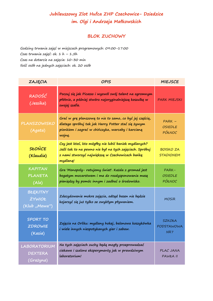 Jubileuszowy Zlot Hufca ZHP Czechowice- Dziedzice im. Olgi i Andrzeja Małkowskich BLOK ZUCHOWY Godziny trwania zajęć w miejscach programowych: 09:00-17:00 Czas trwania zajęć: ok. 1 h – 1,5h Czas na dotarcie na zajęcia: 10-30 min Ilość osób na jednych zajęciach: ok. 20 osób ZAJĘCIA OPIS RADOŚĆ Poczuj się jak Picasso i wyzwól swój talent na ogromnym (Jessika) PLANSZOWISKO (Agata) SŁOŃCE płótnie, a później stwórz najoryginalniejszą koszulkę w MIEJSCE PARK MIEJSKI swojej szafie. Grać w grę planszową to nie to samo, co być jej częścią, dlatego spróbuj tak jak Harry Potter stać się żywym pionkiem i zagrać w chińczyka, warcaby i karcianą wojnę. PARK – OSIEDLE PÓŁNOC Czy jest ktoś, kto mógłby nie lubić baniek mydlanych? Jeśli tak to na pewno nie był na tych zajęciach. Spróbuj BOISKO ZA (Klaudia) z nami stworzyć największą w Czechowicach bańkę STADIONEM KAPITAN Gra 'Monopoly- ratujemy świat'. Każda z gromad jest PARK- bogatym mocarstwem i ma do rozdysponowania masę OSIEDLE pieniędzy by pomóc innym i zadbać o środowisko. PÓŁNOC PLANETA (Ala) BŁĘKITNY ŻYWIOŁ (Klub „Mewa”) SPORT TO ZDROWIE (Kasia) LABORATORIUM DEXTERA (Grażyna) mydlaną! Zdecydowanie mokre zajęcia, odtąd basen nie będzie kojarzyć się już tylko ze zwykłym pływaniem. Zajęcia na Orliku: mydlany hokej, balonowa koszykówka i wiele innych niespotykanych gier i zabaw. MOSiR SZKOŁA PODSTAWOWA NR7 Na tych zajęciach zuchy będą mogły przeprowadzać ciekawe i szalone eksperymenty jak w prawdziwym laboratorium! PLAC JANA PAWŁA II GRUPA I (20 osób) Próbna Gromada Zuchowa z Bestwiny 20 Gromada Zuchowa „Leśne Ogniki” GODZINA ZAJĘCIA MIEJSCE PROPONOWANE DOJŚCIE 9.30-10.30 10.50-11.50 12.15-13.15 Na zajęcia: Pieszo do LABORATORIUM PLAC JANA DEXTERA PAWŁA II RADOŚĆ BŁĘKITNY ŻYWIOŁ centrum miasta Na kolejny punkt: pieszo Na kolejny punkt: PARK MIEJSKI MOSiR pieszo Na kolejny punkt: pieszo Na kolejny punkt: 13.25-14.25 (+obiad) SŁOŃCE BOISKO ZA STADIONEM Przystanek „Kopernika Gliksmanka” Ul. Legionów Autobus VII-14.36 Wysiąść na przystanku 14.50-15.50 KAPITAN PARK-OSIEDLE PLANETA PÓŁNOC „Osiedle Północ” ul. Wyspiańskiego o 14.44 (5 przystanek od Gliksmanki) 16.00-17.00 PLANSZOWISKO PARK – OSIEDLE PÓŁNOC Zabrać na zajęcia: -koszulkę do pomalowania -strój kąpielowy -koło lub motylki do pływania -ręcznik Pieszo do hufca GRUPA II (18 osób) 8 Gromada Zuchowa „Dzielni Jaskiniowcy” 12 Gromada Zuchowa „Bajkowe Stworki” 21 Gromada Zuchowa „Radosne Kleksy” GODZINA ZAJĘCIA MIEJSCE PROPONOWANE DOJŚCIE Na zajęcia: pieszo do 9.40-10.40 RADOŚĆ PARK MIEJSKI centrum miasta Na kolejny punkt: pieszo 11.00-12.00 Na kolejny punkt: LABORATORIUM PLAC JANA Przystanek „MDK” DEXTERA PAWŁA II Ul. Legionów Autobus VII-12.18 Wysiąść na przystanku „Osiedle Północ” 12.35-13.55 (+obiad) PLANSZOWISKO PARK – OSIEDLE PÓŁNOC Ul. Wyspiańskiego o 12.24 Na kolejny punkt: Przystanek „Osiedle Północ” Ul. Wyspiańskiego Autobus VII - 14.10 14.20-15.20 BŁĘKITNY ŻYWIOŁ Wysiąść na przystanku MOSiR „MOSiR” o 14.18 Na kolejny punkt: pieszo Do hufca: Przystanek „Kopernika Glismanka” 15.30-16.30 SŁOŃCE BOISKO ZA Autobus VII-16.38 STADIONEM Wysiąść na dworcu lub następnym przystanku ZSTiL i później pieszo do hufca Zabrać na zajęcia: -koszulkę do pomalowania -strój kąpielowy -koło lub motylki do pływania -ręcznik GRUPA III (24 osoby) 11 Gromada Zuchowa „Wesołe Łakomczuchy” GODZINA ZAJĘCIA MIEJSCE PROPONOWANE DOJŚCIE Na zajęcia: pieszo 9.20-10.55 KAPITAN PARK-OSIEDLE PLANETA PÓŁNOC Na kolejny punkt Przystanek „Osiedle Północ” ul. Wyspiańskiego Autobus VII- 11.10 Wysiąść na przystanku 11.30-12.30 BŁĘKITNY ŻYWIOŁ „MOSiR” o 11.18 MOSiR Na kolejny punkt: Pieszo na stadion 12.40-14.00 (+obiad) Na kolejny punkt: SŁOŃCE BOISKO ZA Przystanek STADIONEM Łukasiewicza/ Gimnazjum nr3 Autobus 5-14.14 Wysiąść na przystanku 14.35-15.40 PLANSZOWISKO PARK – OSIEDLE PÓŁNOC „Osiedle Północ” ul.Wyspiańskiego o 14.26 Na kolejny punkt: Pieszo 16.00-17.00 SPORT TO ZDROWIE Zabrać na zajęcia: -strój kąpielowy -koło lub motylki do pływania -ręcznik SZKOŁA PODSTAWOWA NR7 Pieszo do hufca