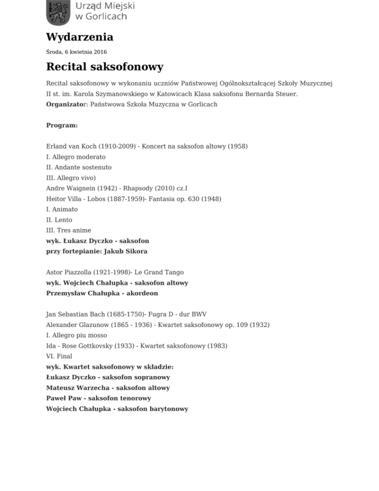 Wydarzenia Środa, 6 kwietnia 2016 Recital saksofonowy Recital saksofonowy w wykonaniu uczniów Państwowej Ogólnokształcącej Szkoły Muzycznej II st. im. Karola Szymanowskiego w Katowicach Klasa saksofonu Bernarda Steuer. Organizator: Państwowa Szkoła Muzyczna w Gorlicach Program: Erland van Koch (1910-2009) - Koncert na saksofon altowy (1958) I. Allegro moderato II. Andante sostenuto III. Allegro vivo) Andre Waignein (1942) - Rhapsody (2010) cz.I Heitor Villa - Lobos (1887-1959)- Fantasia op. 630 (1948) I. Animato II. Lento III. Tres anime wyk. Łukasz Dyczko - saksofon przy fortepianie: Jakub Sikora Astor Piazzolla (1921-1998)- Le Grand Tango wyk. Wojciech Chałupka - saksofon altowy Przemysław Chałupka - akordeon Jan Sebastian Bach (1685-1750)- Fugra D - dur BWV Alexander Glazunow (1865 - 1936) - Kwartet saksofonowy op. 109 (1932) I. Allegro piu mosso Ida - Rose Gottkovsky (1933) - Kwartet saksofonowy (1983) VI. Final wyk. Kwartet saksofonowy w składzie: Łukasz Dyczko - saksofon sopranowy Mateusz Warzecha - saksofon altowy Paweł Paw - saksofon tenorowy Wojciech Chałupka - saksofon barytonowy