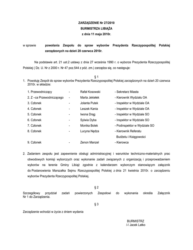 ZARZĄDZENIE Nr 27/2010 BURMISTRZA LIBIĄśA z dnia 11 maja 2010r. w sprawie powołania Zespołu do spraw wyborów Prezydenta Rzeczypospolitej Polskiej zarządzonych na dzień 20 czerwca 2010r. Na podstawie art. 21 ust.2 ustawy z dnia 27 września 1990 r. o wyborze Prezydenta Rzeczypospolitej Polskiej ( Dz. U. Nr z 2000 r. Nr 47 poz.544 z póź. zm.) zarządza się, co następuje: §1 1. Powołuję Zespół do spraw wyborów Prezydenta Rzeczypospolitej Polskiej zarządzonych na dzień 20 czerwca 2010r. w składzie: 1. Przewodniczący - Rafał Kosowski - Sekretarz Miasta 2. Z –ca Przewodniczącego - Marta Jekiełek - Kierownik Wydziału OA 3. Członek - Jolanta Putek - Inspektor w Wydziale OA 4. Członek - Leszek Kania - Inspektor w Wydziale OA 5. Członek - Iwona Drąg - Inspektor w Wydziale SO 6. Członek - Sylwia Dyba - Inspektor w Wydziale SO 7. Członek - Monika Bolek - Podinspektor w Wydziale SO 8. Członek - Lucyna Nędza - Kierownik Referatu BudŜetu i Księgowości 9. Członek - Zenon Manzel - Kierowca 2. Zadaniem zespołu jest zapewnienie obsługi administracyjnej i warunków techniczno-materialnych prac obwodowych komisji wyborczych oraz wykonanie zadań związanych z organizacją i przeprowadzeniem wyborów na terenie Gminy LibiąŜ zgodnie z kalendarzem wyborczym stanowiącym załącznik do Postanowienia Marszałka Sejmu Rzeczypospolitej Polskiej z dnia 21 kwietnia 2010r. o zarządzeniu wyborów Prezydenta Rzeczypospolitej Polskiej. §2 Szczegółowy przydział Nr 1 do Zarządzenia. zadań powierzonych Zespołowi do wykonania określa §3 Zarządzenie wchodzi w Ŝycie z dniem wydania BURMISTRZ /-/ Jacek Latko Załącznik Załącznik Nr 1 do Zarządzenia Nr 27/2010 Burmistrza LibiąŜa z dnia 11 maja 2010r. 1. Pełnienie funkcji urzędnika wyborczego, koordynowanie całokształtu prac zespołu , szkolenie Obwodowych Komisji Wyborczych, utrzymanie kontaktu z Delegaturą Krajowego Biura Wyborczego w Krakowie - Rafał Kosowski 2. Obsługa organizacyjno-biurowa, w tym redagowanie projektów aktów prawnych i korespondencji związanej z wyborami, przyjmowanie zgłoszeń do Obwodowych Komisji Wyborczych i sporządzanie wykazu kandydatów zgłaszanych do OKW, zapewnienie obsługi OKW przez pracowników samorządowych, losowania składów komisji oraz uzupełniania składów OKW, zorganizowanie pierwszego posiedzenia i szkolenia OKW, zabezpieczenie kart do głosowania oraz materiałów wyborczych do czasu wydania obwodowym komisjom wyborczym, zapewnienie transportu materiałów wyborczych do OKW, zapewnienie obsługi w zakresie stałego dyŜuru w dniu wyborów 3. Przygotowanie spisów wyborczych, zapewnienie wydawania zaświadczeń o prawie do głosowania, zapewnienie udzielania pełnomocnictw do głosowania i prowadzenia wykazu sporządzanych aktów pełnomocnictw do głosowania 4. Obsługa techniczna, w tym przygotowanie lokali wyborczych zabezpieczenie materiałów biurowych, druków wyborczych i pieczęci dla komisji wyborczych, zapewnienie łączności z lokalami wyborczymi, zapewnienie odbioru materiałów wyborczych z OKW po głosowaniu 5. Obsługa finansowa 6. Koordynowanie obsługi informatycznej przez operatorów informatycznych, zapewnienie szkolenia operatorów, współpraca z Delegaturą KBW w Krakowie w zakresie funkcjonowania Platformy Wyborczej, zapewnienie sprzętu komputerowego potrzebnego do obsługi OKW, bieŜąca aktualizacja informacji wyborczych na stronie internetowej Urzędu Miejskiego w LibiąŜu 7. Rozplakatowanie obwieszczeń i informacji wyborczych - Marta Jekiełek - Iwona Drąg - Sylwia Dyba - Monika Bolek - Jolanta Putek - Lucyna Nędza - Leszek Kania - Zenon Manzel BURMISTRZ /-/ Jacek Latko